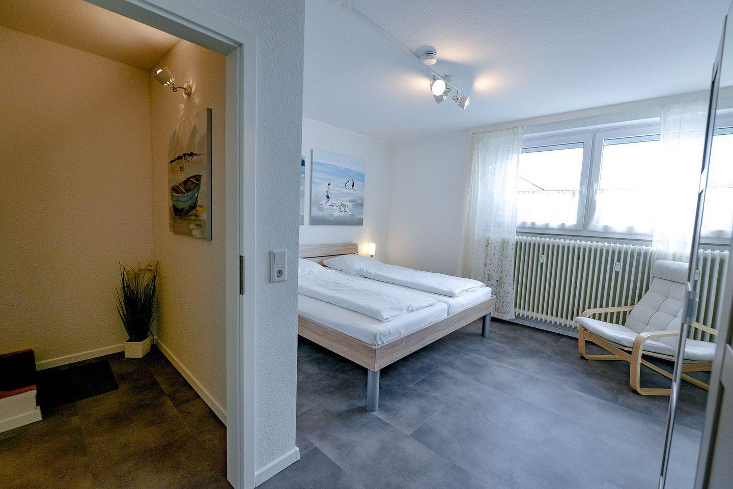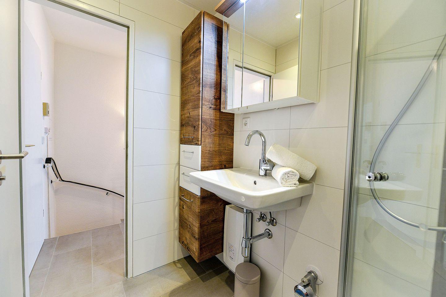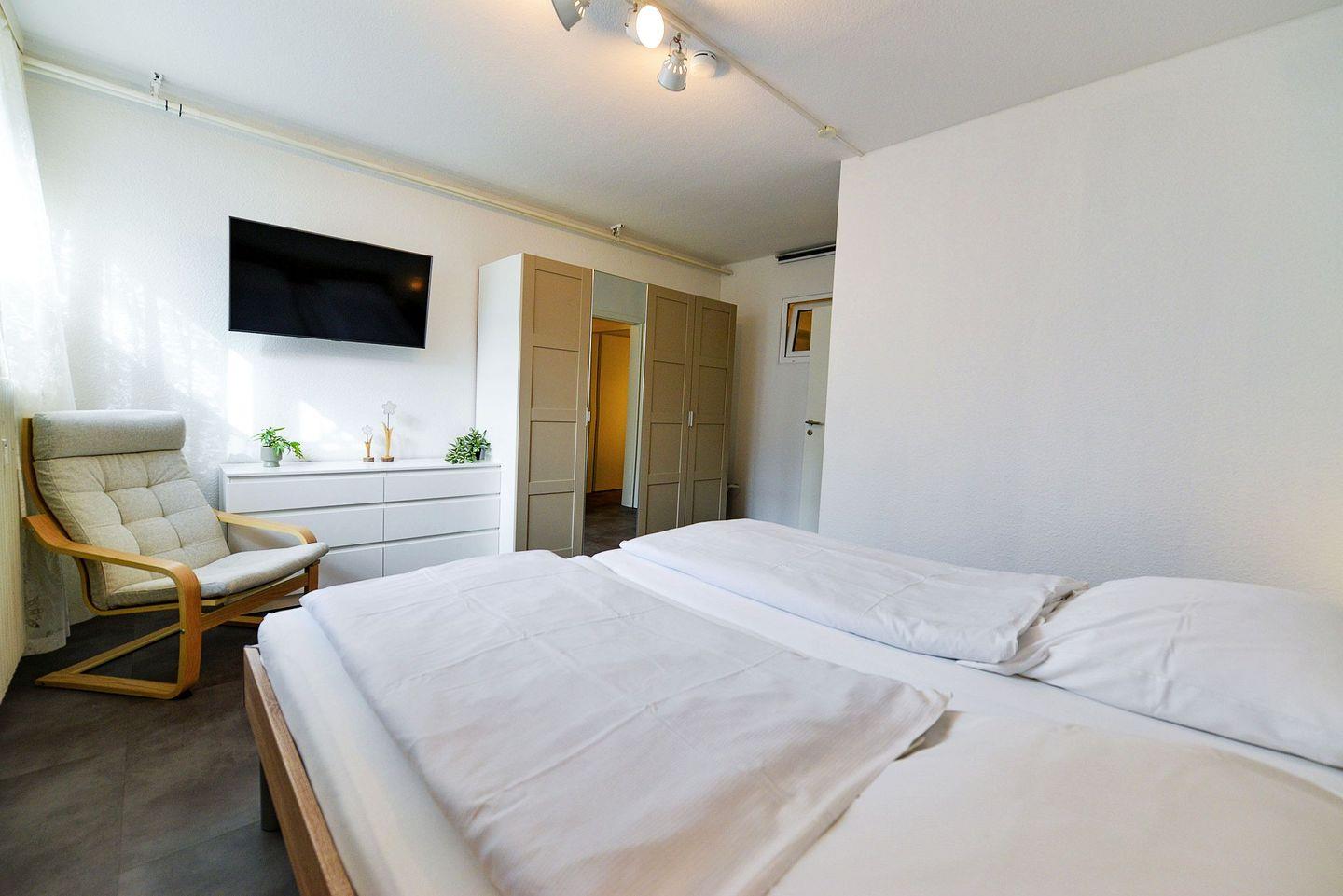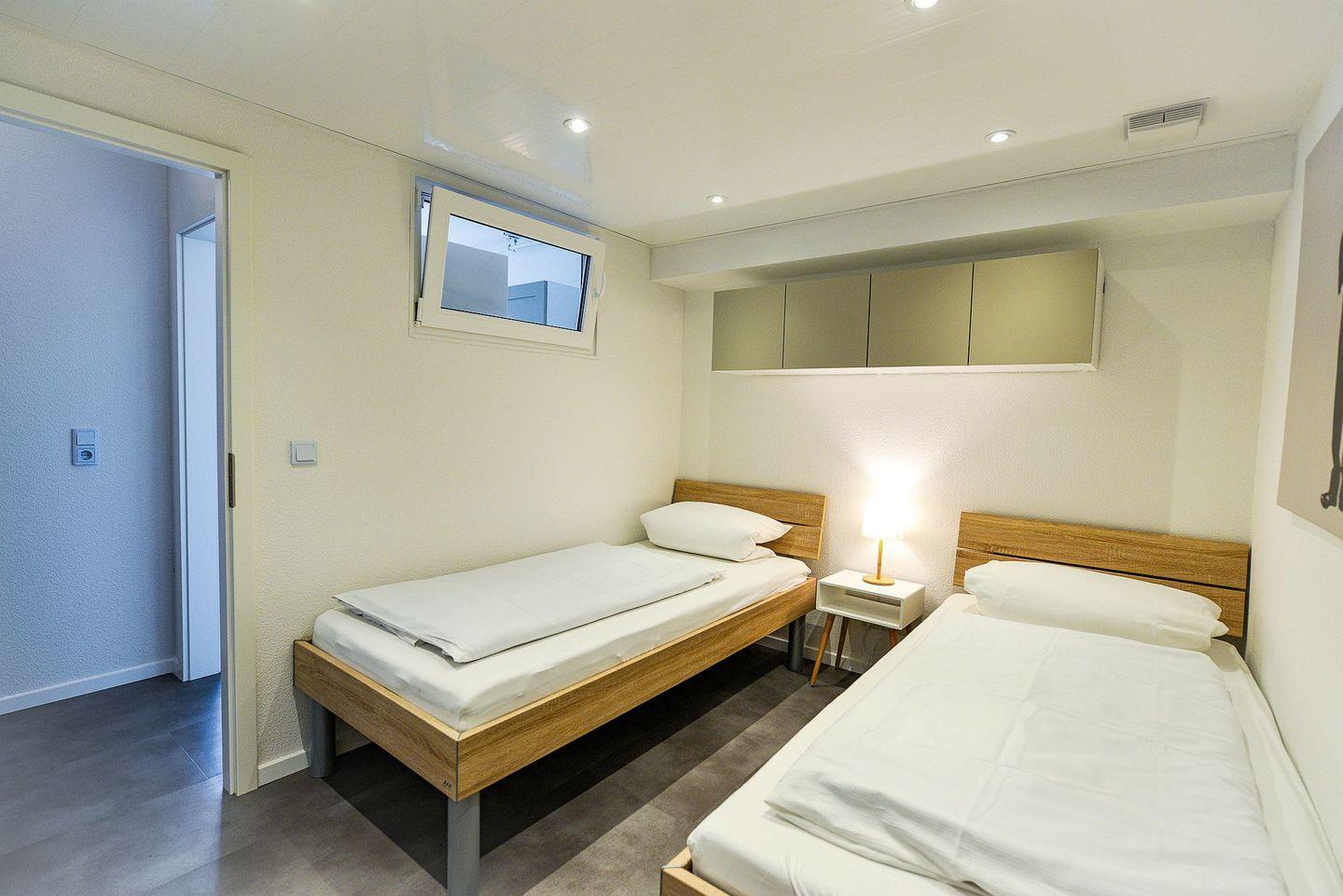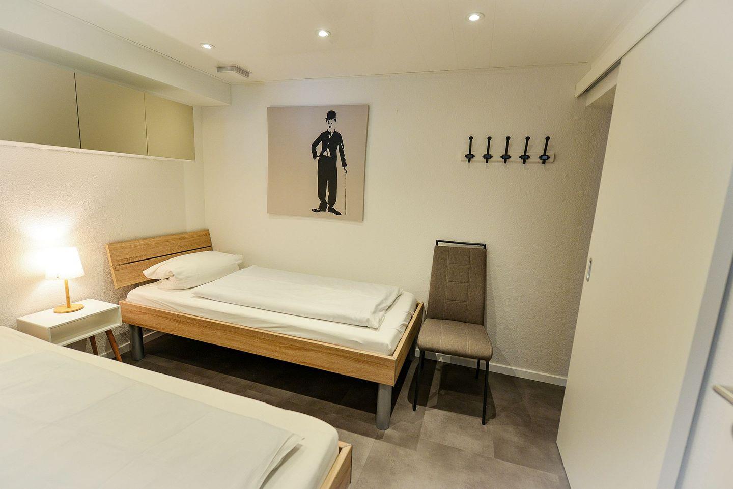 Ein modern renoviertes Bad mit Dusche und WC sowie der Flur mit Garderobe ergänzen das Raumangebot im oberen Bereich. Eine gute Treppe führt hinunter in die untere Etage mit zwei separaten Schlafzimmern: eines mit hochwertigem Doppelbett und TV, das andere mit zwei hochwertigen Einzelbetten. Das zweite Schlafzimmer ist über ein Fenster mit dem Hauptzimmer verbunden, abdunkelbar und bietet Privatsphäre.
