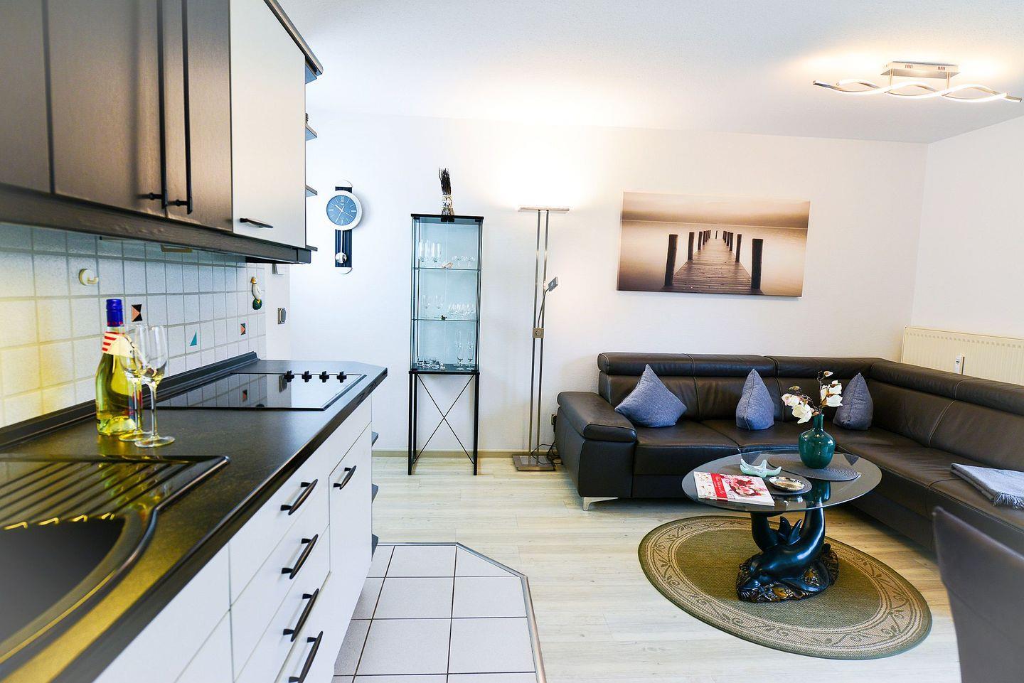 Die komfortable 55?m² große Erdgeschosswohnung befindet sich komplett auf einer Ebene – ideal für alle, die bequemen Zugang ohne Treppen schätzen. Sie bietet Platz für 2 Personen oder eine Familie mit 2 Kindern und verfügt über ein Schlafzimmer mit Doppelbett und TV, ein Kinderzimmer mit Etagenbett, einen Wohn-/Essbereich mit TV, eine voll ausgestattete Küche, WLAN sowie ein Duschbad mit WC.