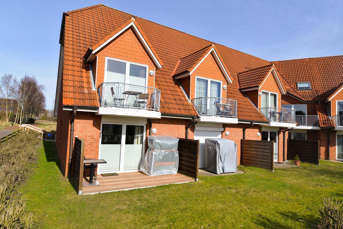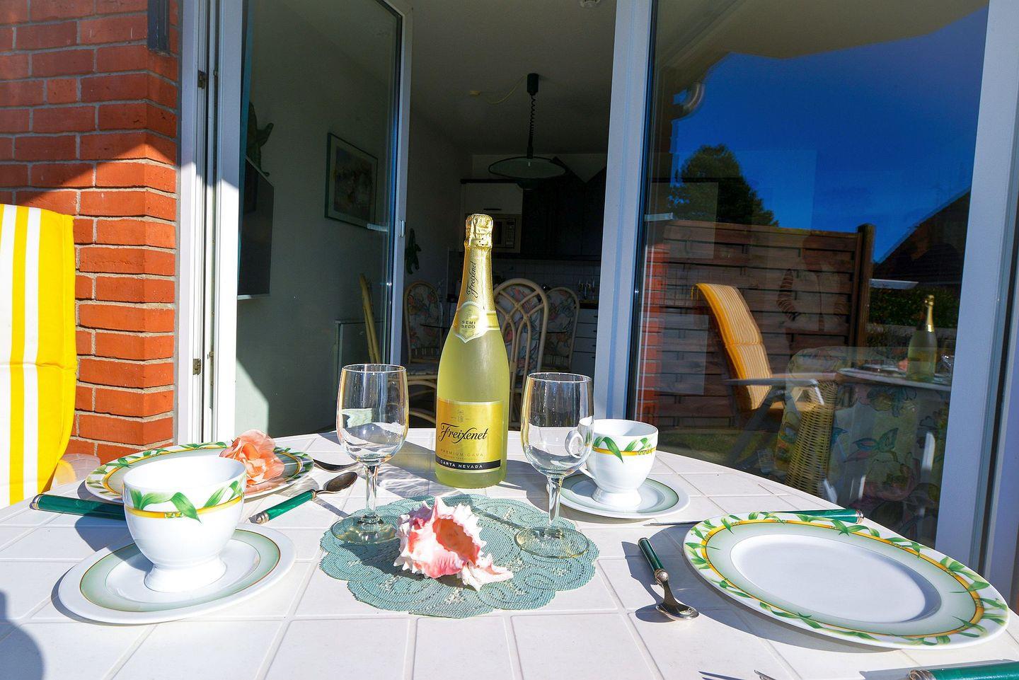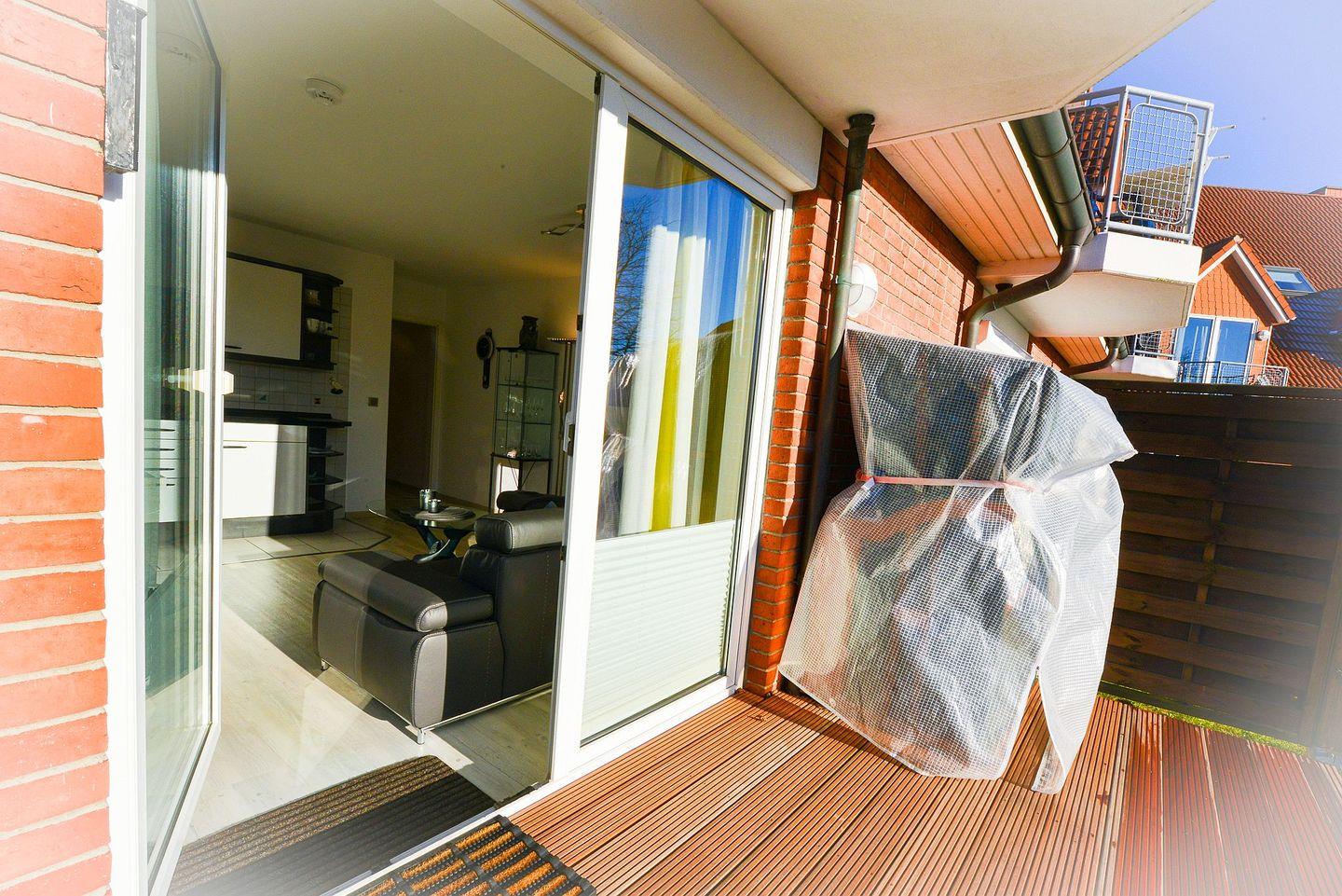 Zur Wohnung gehört eine Terrasse mit Sitzgelegenheit und Strandkorb. Ein eigener, ausgeschilderter Parkplatz (DS29) befindet sich direkt am Haus.