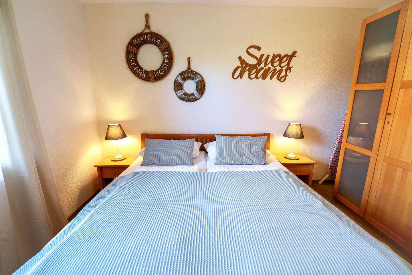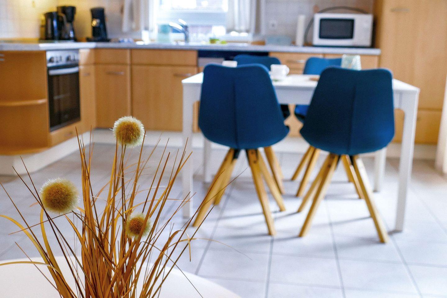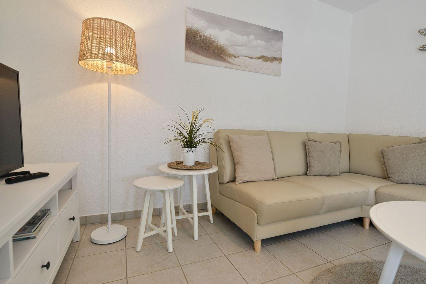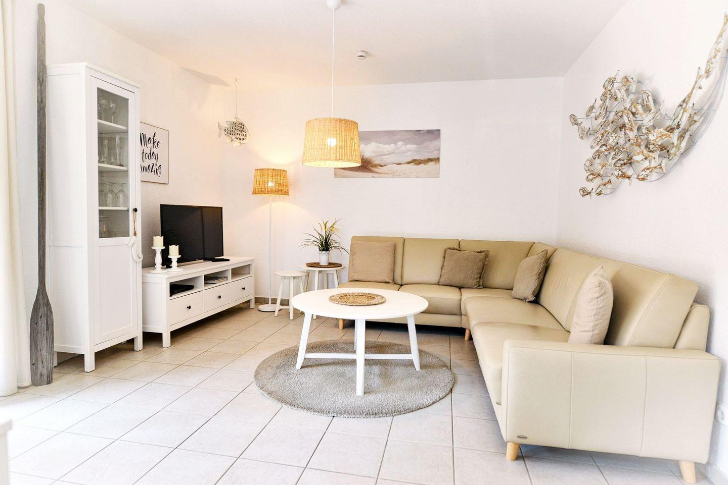 Diese 62 m² große Erdgeschosswohnung besticht durch helles, skandinavisches Design und eine überdachte Südterrasse, die zum Frühstücken oder Entspannen nach einem Tag am Strand einlädt. Die Ausstattung ist ideal für erholsame Ferientage: eine offene, voll ausgestattete Küchenzeile, ein modernes Bad mit bodengleicher Dusche und Waschmaschine, zwei Flatscreen-TVs, WLAN sowie Fußbodenheizung für behagliche Stunden auch in der kühleren Jahreszeit. Ein abschließbarer Abstellraum für Fahrräder und ein Parkplatz direkt am Haus sorgen für zusätzlichen Komfort. Der feinsandige Strand von Sahlenburg sowie das