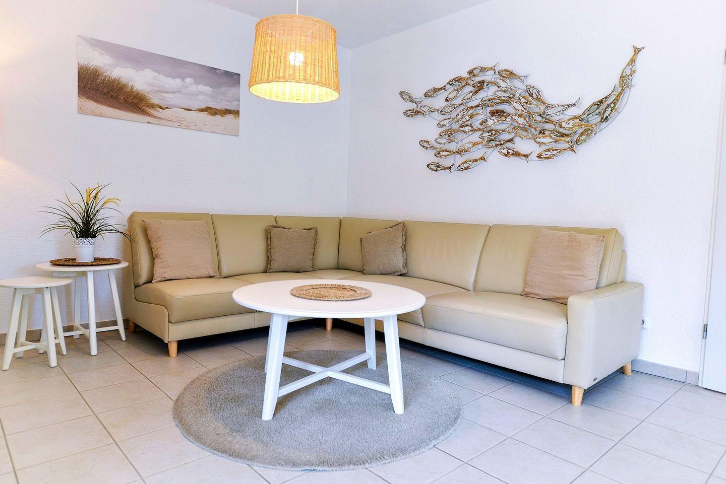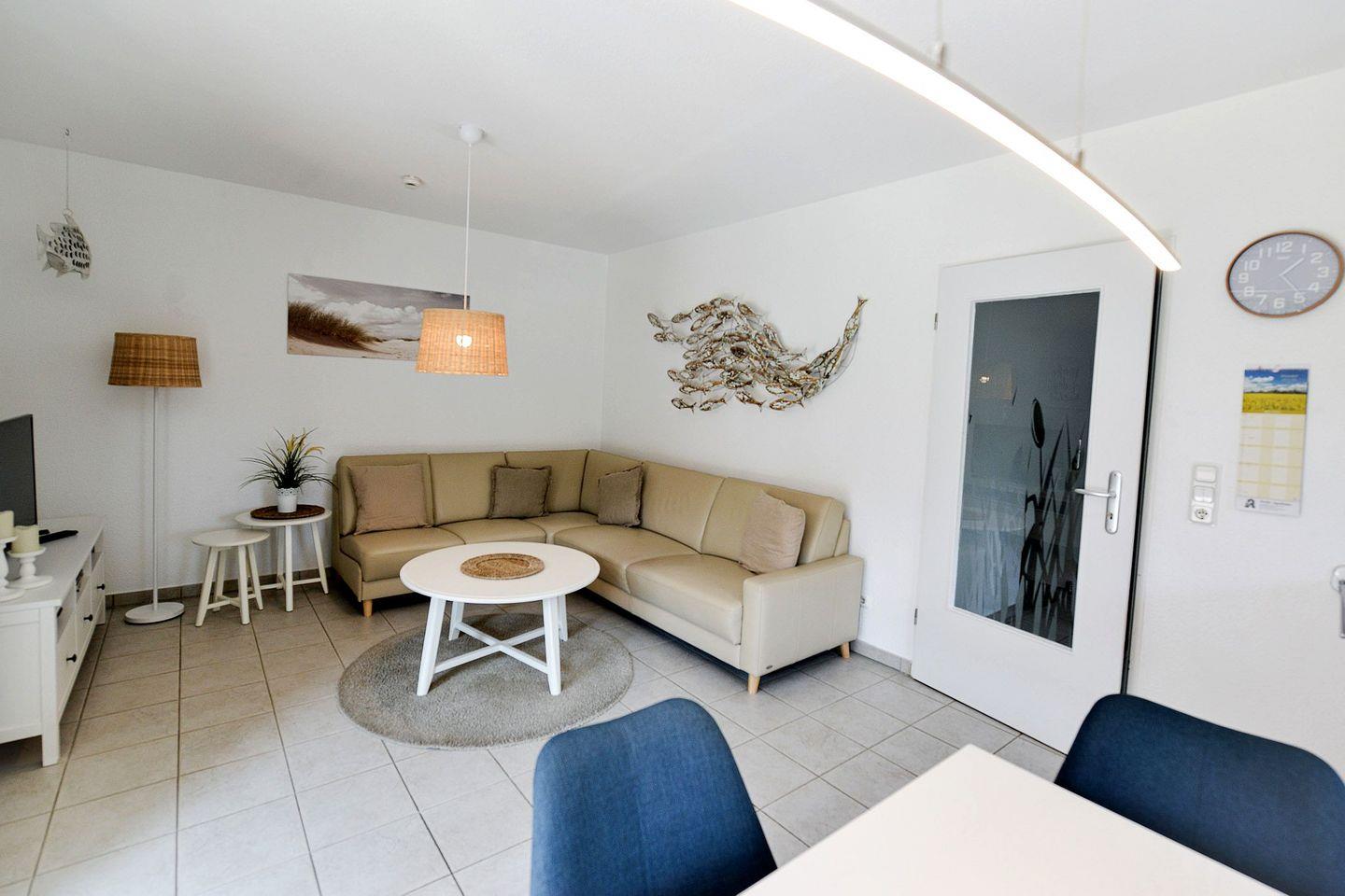 Helle 62 m² Erdgeschosswohnung mit skandinavischem Design, Südterrasse und Fußbodenheizung. Voll ausgestattete Küche, Bad mit bodengleicher Dusche & Waschmaschine, 2 Flatscreen-TVs, WLAN. Strand nur ca. 900 m entfernt. Kostenloser Parkplatz vor dem Haus, abschließbarer Fahrradraum. Kleiner Hund willkommen – ideal für entspannte Tage an der Nordsee.