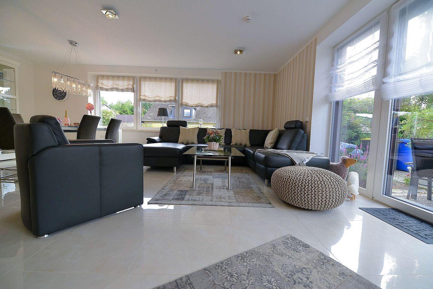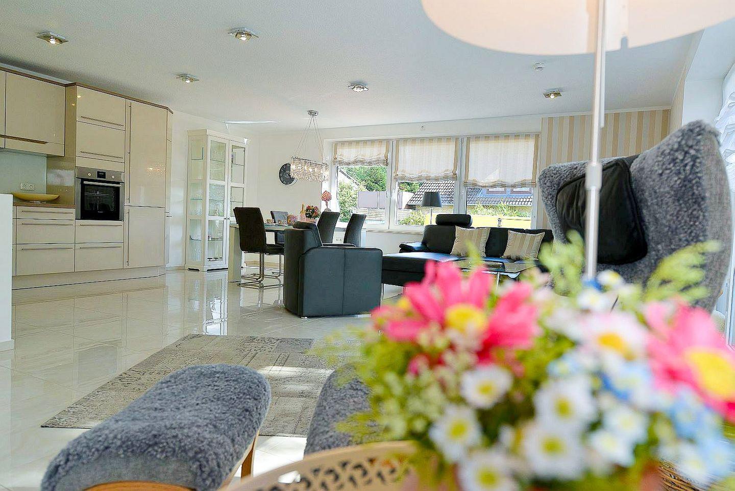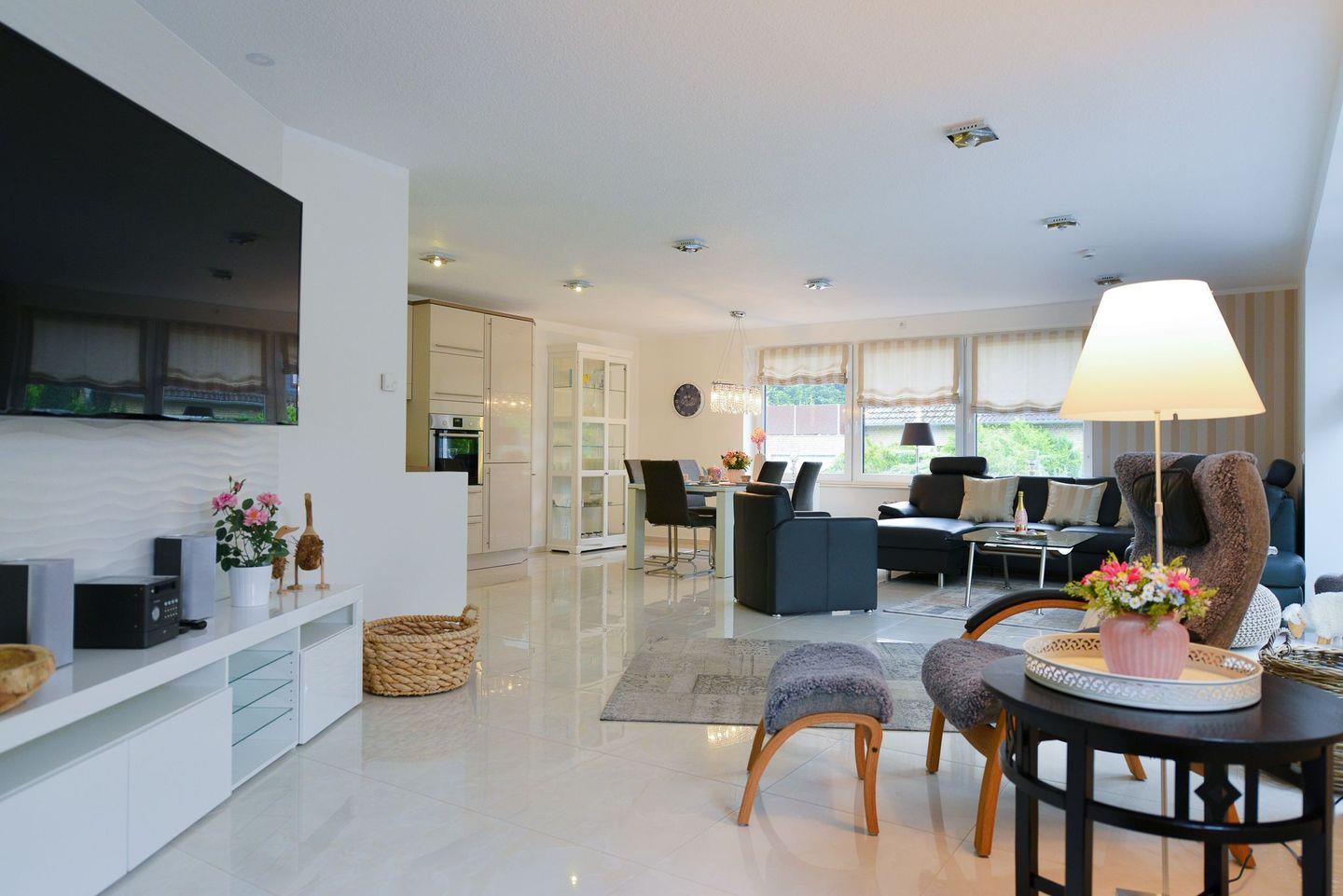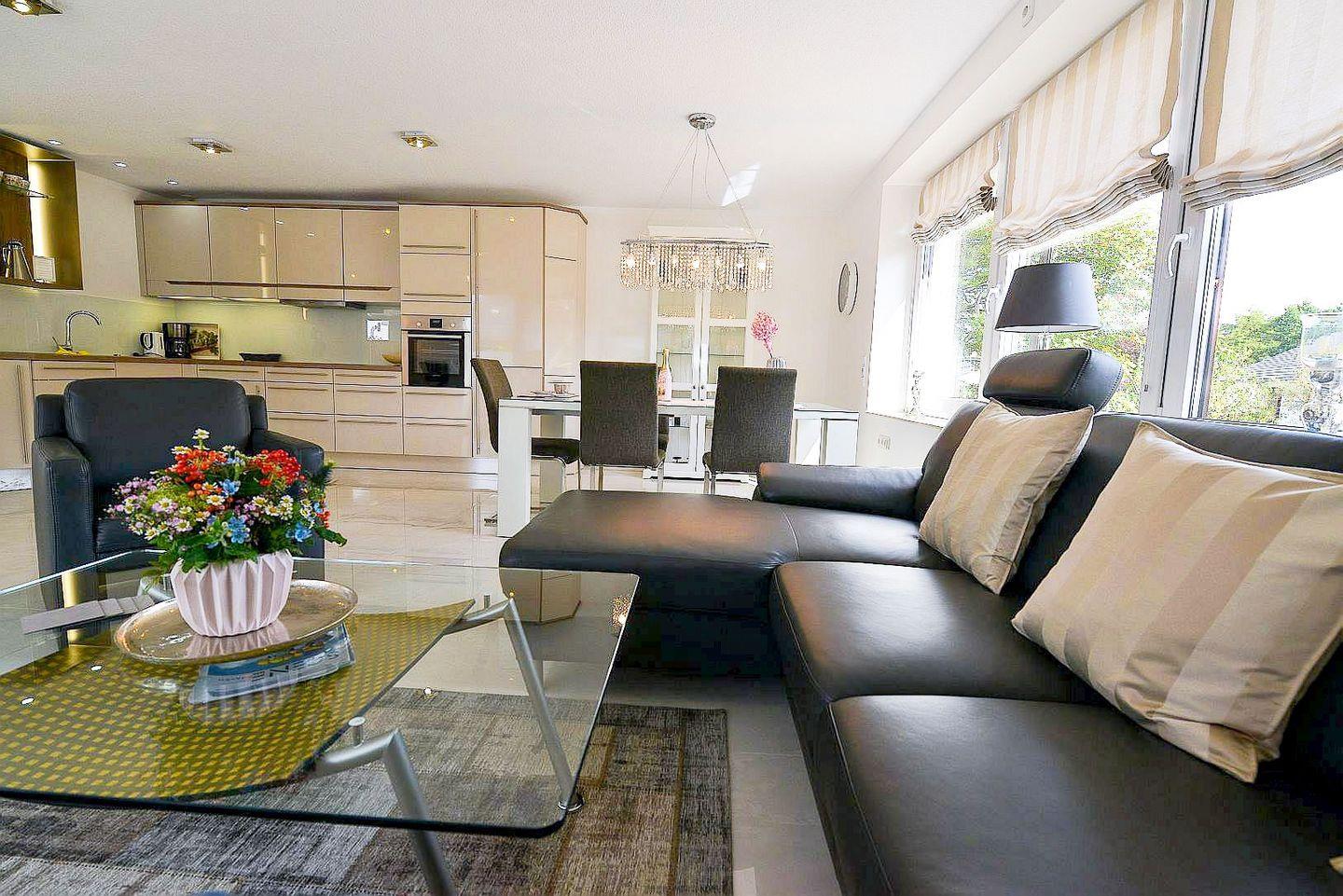 Die Ferienwohnung überzeugt mit einem großzügigen, lichtdurchfluteten Wohnbereich, stilvoller Einrichtung, Fußbodenheizung in allen Räumen, drei Smart-TVs, elektrischen Fensterrollos sowie kostenfreiem WLAN. Der Wohnraum bietet eine gemütliche Couch, viel Tageslicht und moderne Technik für entspannte Abende. Die offene Küche ist komplett ausgestattet und eignet sich ideal zur Selbstverpflegung – vom Frühstück bis zum Abendessen.