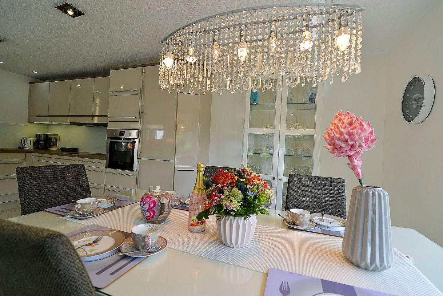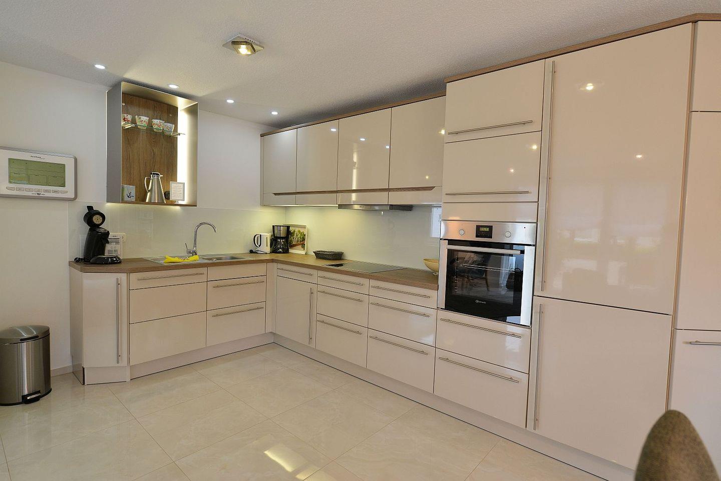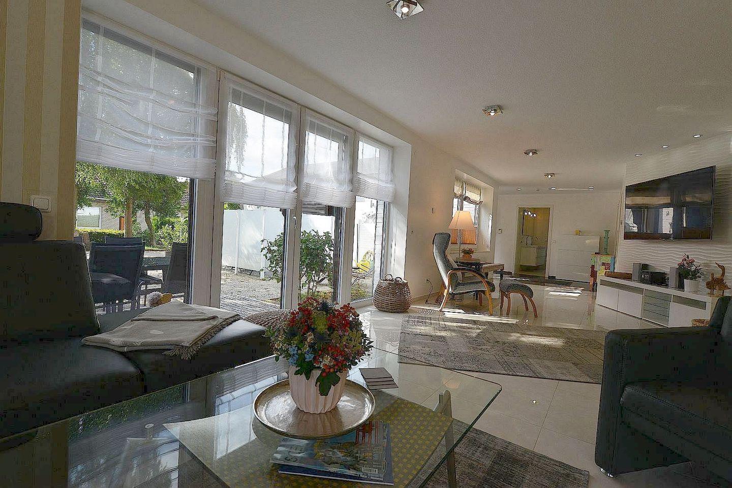 Die Ferienwohnung überzeugt mit einem großzügigen, lichtdurchfluteten Wohnbereich, stilvoller Einrichtung, Fußbodenheizung in allen Räumen, drei Smart-TVs, elektrischen Fensterrollos sowie kostenfreiem WLAN. Der Wohnraum bietet eine gemütliche Couch, viel Tageslicht und moderne Technik für entspannte Abende. Die offene Küche ist komplett ausgestattet und eignet sich ideal zur Selbstverpflegung – vom Frühstück bis zum Abendessen.