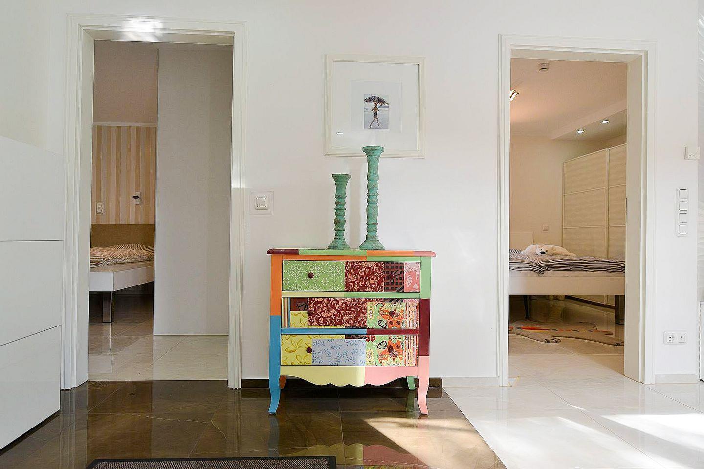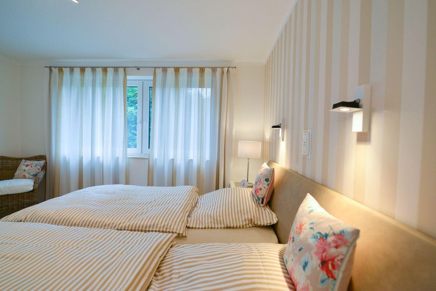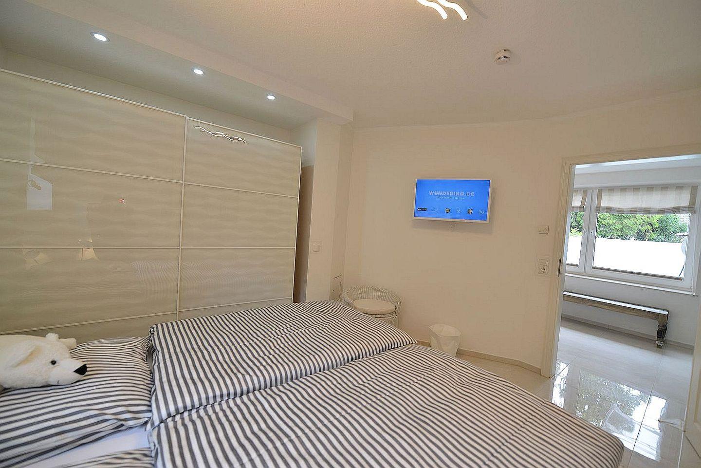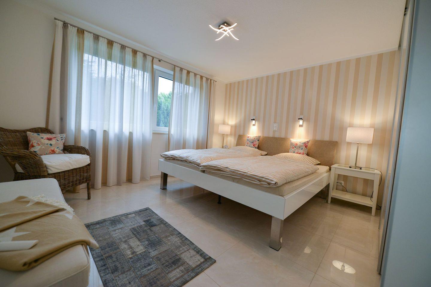 Die Ferienwohnung überzeugt mit einem großzügigen, lichtdurchfluteten Wohnbereich, stilvoller Einrichtung, Fußbodenheizung in allen Räumen, drei Smart-TVs, elektrischen Fensterrollos sowie kostenfreiem WLAN. Der Wohnraum bietet eine gemütliche Couch, viel Tageslicht und moderne Technik für entspannte Abende. Die offene Küche ist komplett ausgestattet und eignet sich ideal zur Selbstverpflegung – vom Frühstück bis zum Abendessen.