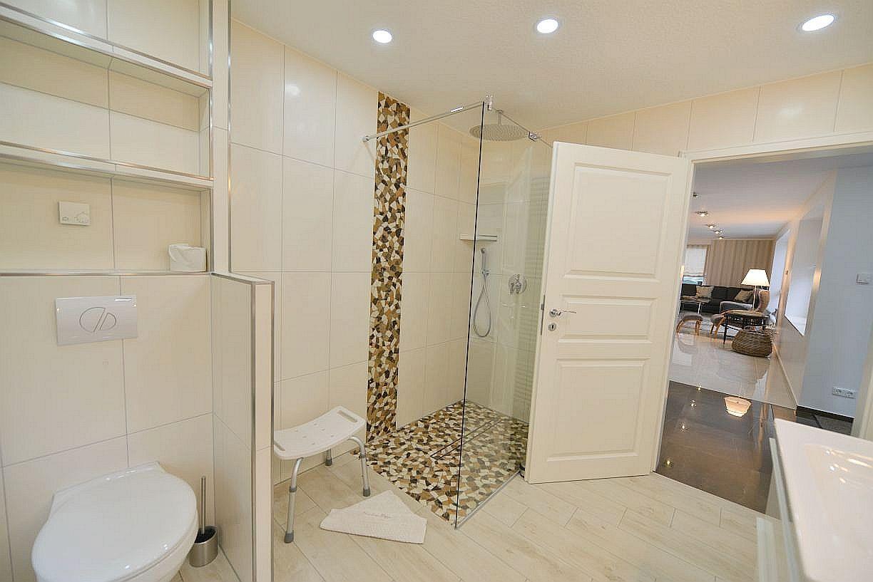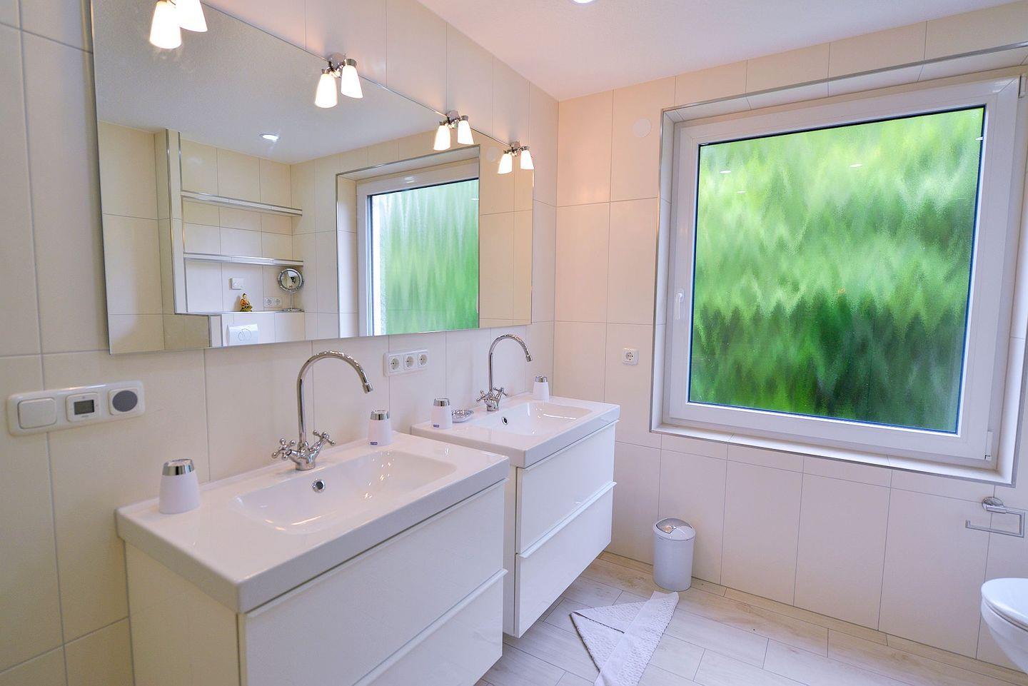 Das große Tageslichtbad ist hochwertig gestaltet und verfügt über eine ebenerdige Regendusche sowie ein Doppelwaschbecken. Für zusätzlichen Komfort sorgt auch hier die durchgehende Fußbodenheizung.