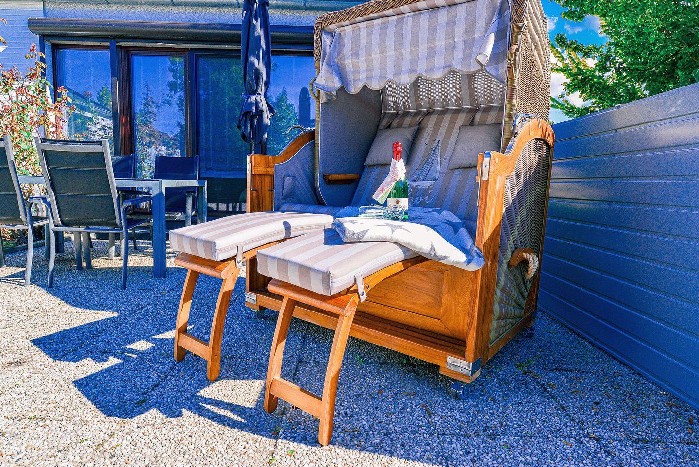 Direkt vor der Wohnung befindet sich eine Südwest-Terrasse mit hochwertigen Gartenmöbeln, die zum Verweilen einlädt – umgeben von Heide, Wald und frischer Nordseeluft. Zur Ausstattung gehört zudem ein eigener kostenloser Parkplatz direkt am Haus sowie ein abschließbarer Fahrradschuppen, ideal für Fahrräder und E-Bikes.