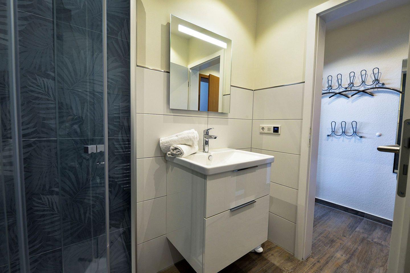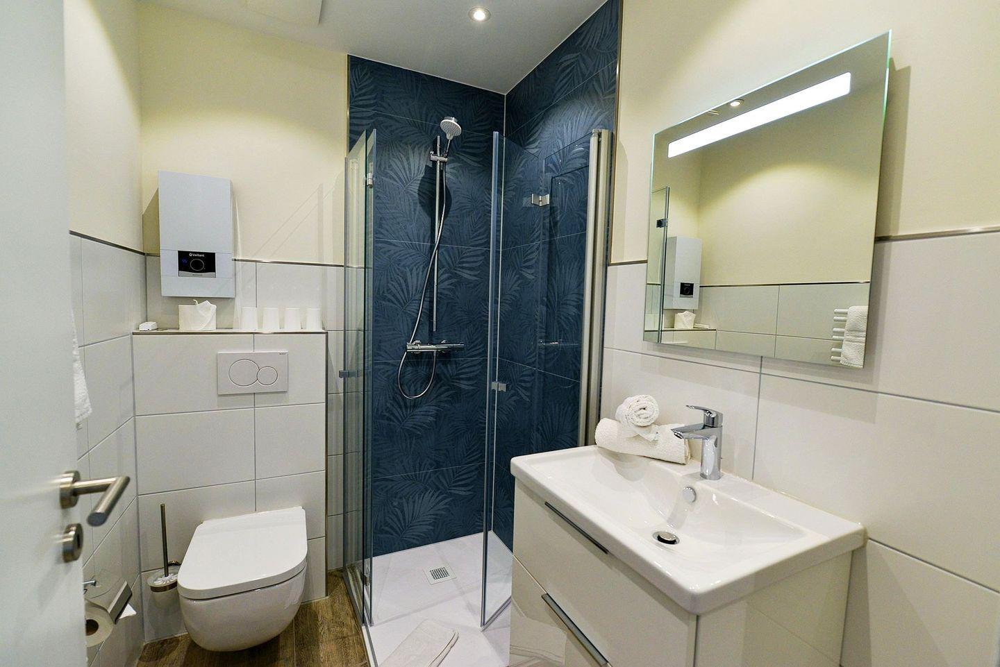 Die Wohnung ist komfortabel ausgestattet: Die offene Küchenzeile ist voll eingerichtet, das komplett neu gestaltete Bad überzeugt mit ebenerdiger Dusche und eingebautem Radio – hier beginnt der Tag mit einem Lächeln.