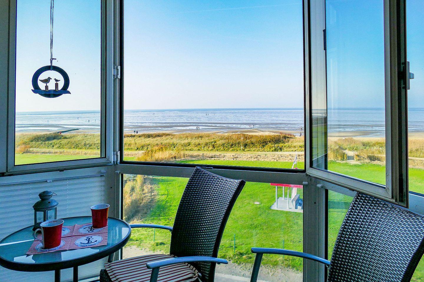 In der dritten Etage gelegen, bietet die Wohnung vom verglasten Westbalkon, der sich öffnen lässt, einen freien Blick auf die Nordsee – ein Logenplatz mit Meerblick.