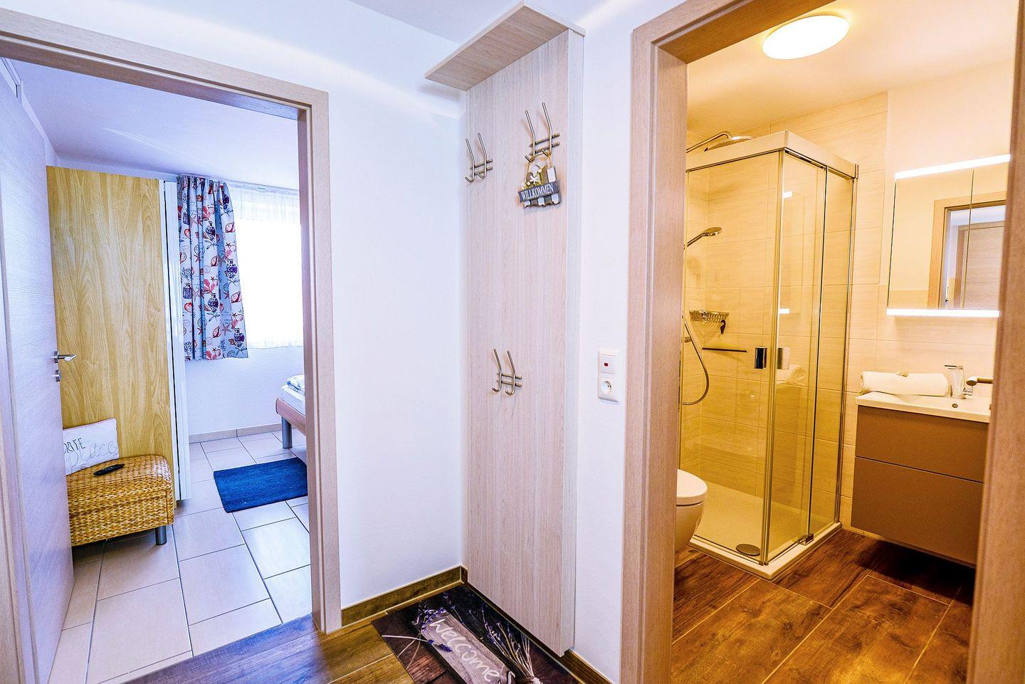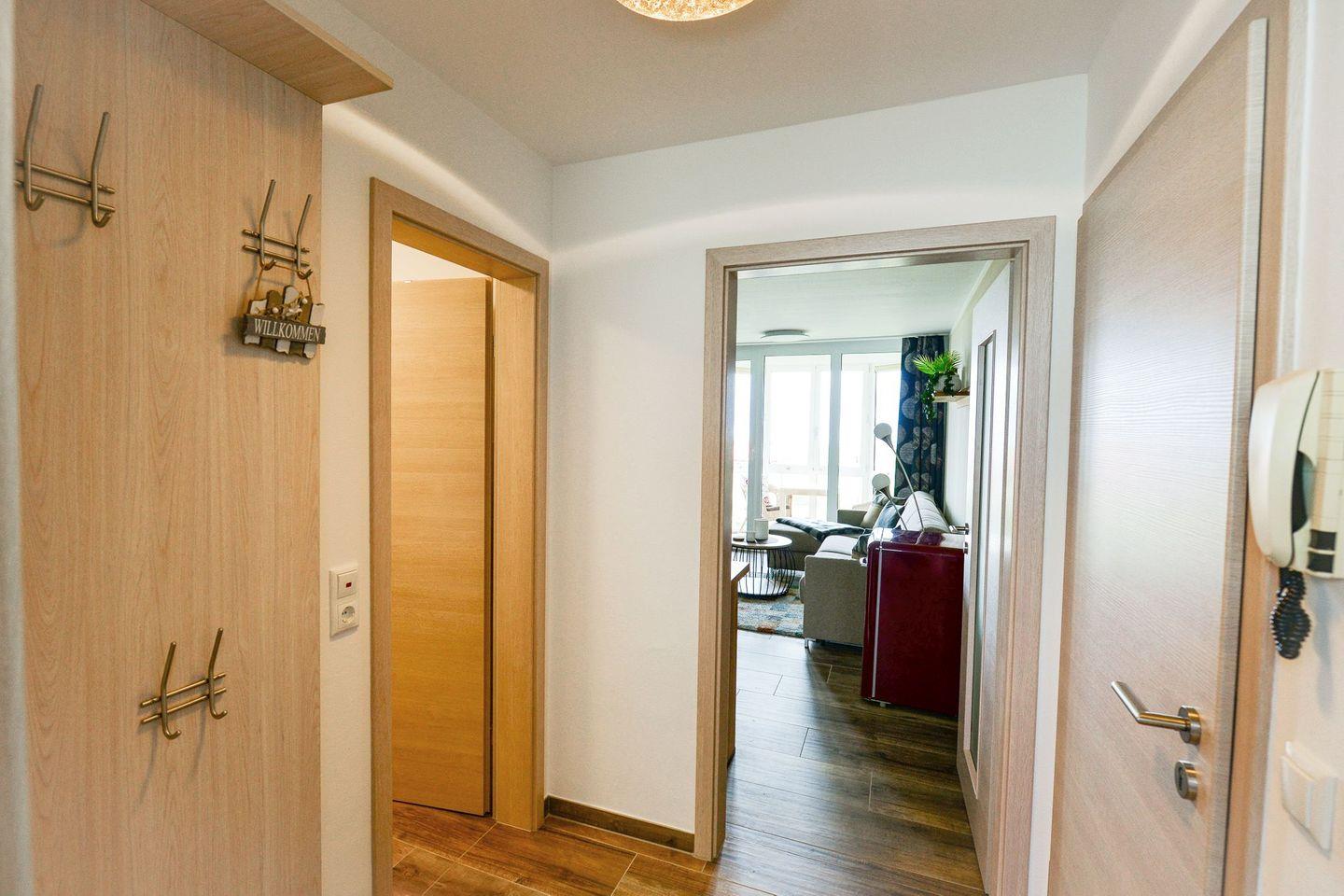 Wohnung an der Promenade mit direkter Panorama-Seesicht. Der Aufzug befindet sich im Eingang 7a und fährt bis zur 3. Etage. Die Eingänge 7 und 7b sind über den Außenbalkon erreichbar. Von dort aus führt das Treppenhaus ins 1., 2. und 4. OG. Ideal für 2–3 Personen, strandnah, verglaster Balkon, Hund erlaubt, Sauna im Haus gegen Gebühr, WLAN, Parkplatz inklusive.