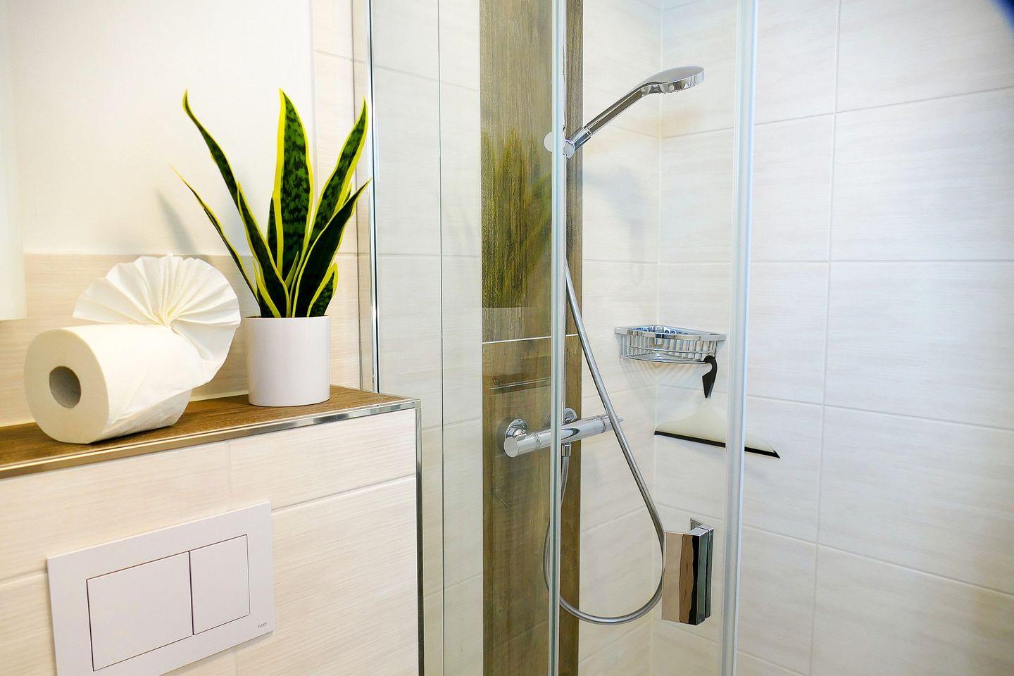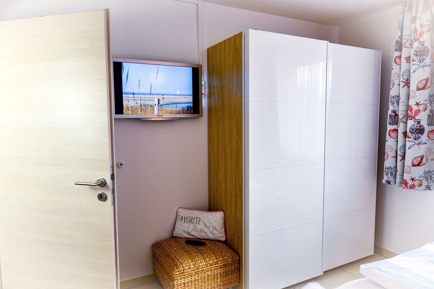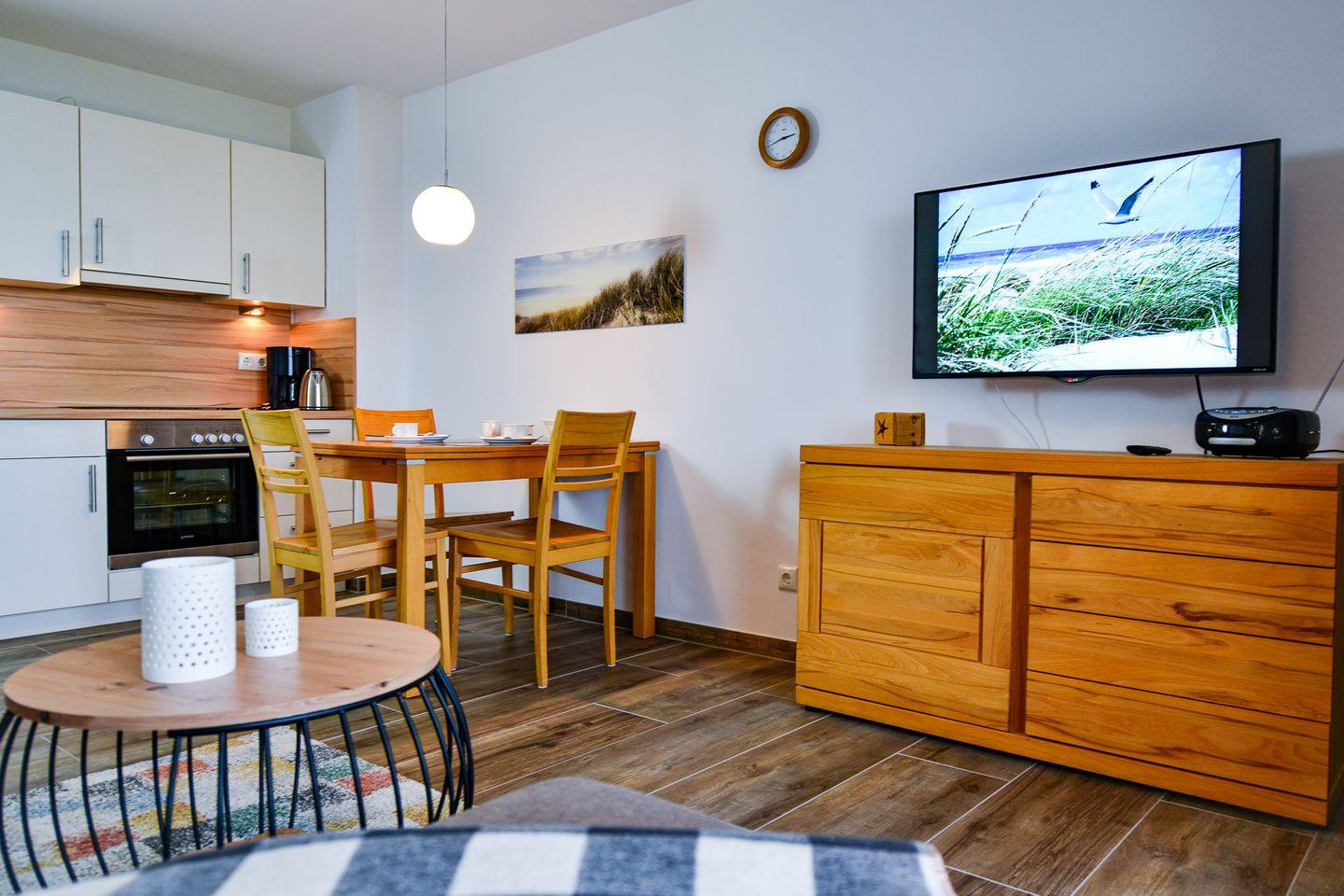Die Wohnung verfügt über ein separates Schlafzimmer mit Doppelbett sowie ein Schlafsofa im Wohnbereich. Die Küche ist voll ausgestattet mit Herd, Backofen, Kühlschrank und Kaffeemaschine. WLAN, Flatscreen-TV, Fußbodenheizung und ein neues und modernes Duschbad sorgen für Komfort.