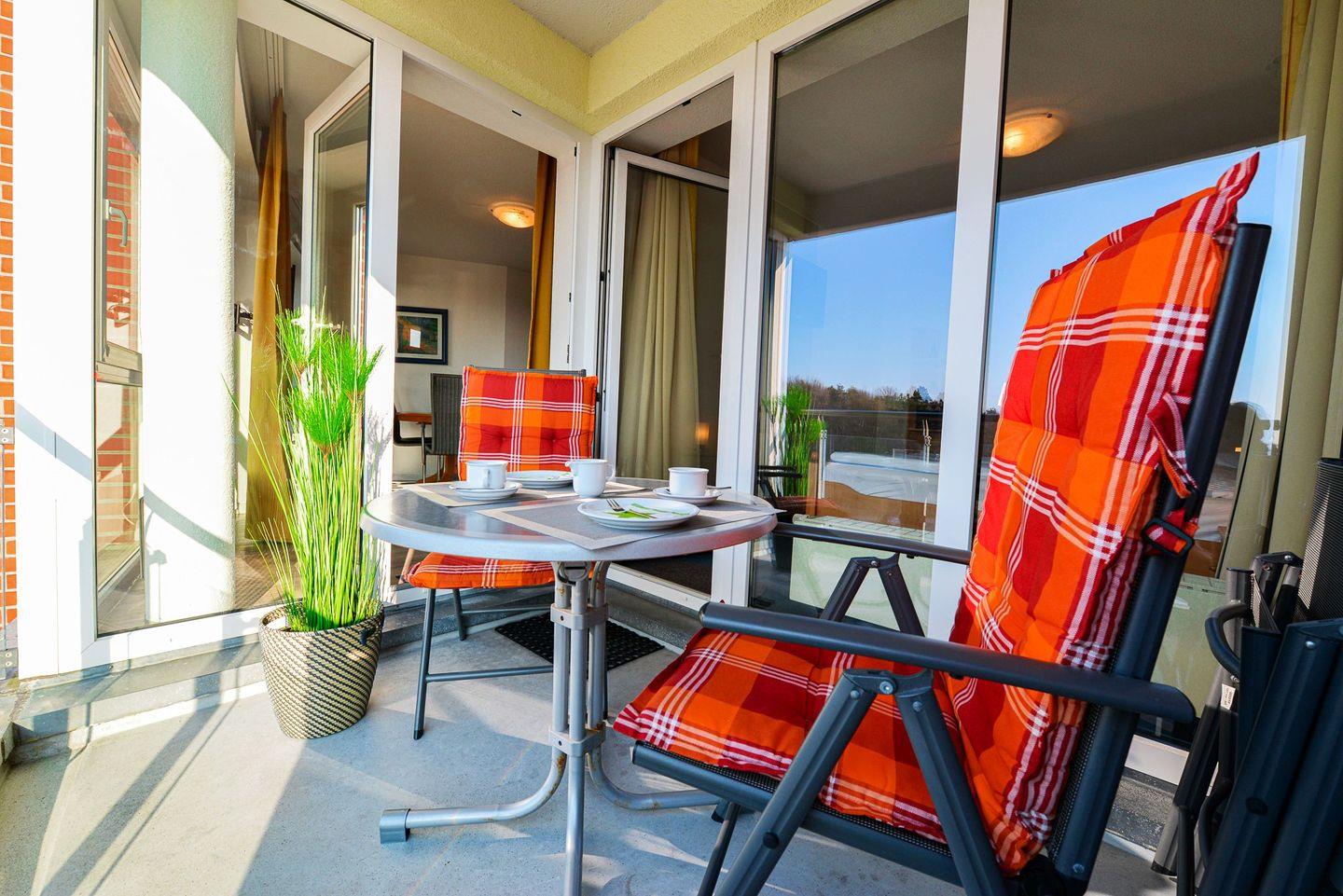 Besonders angenehm ist der überdachte Balkon mit seitlichem Blick aufs Meer, der zu jeder Tageszeit zum Verweilen einlädt – ob beim Frühstück oder am Abend mit einem Buch oder einem Glas Wein.