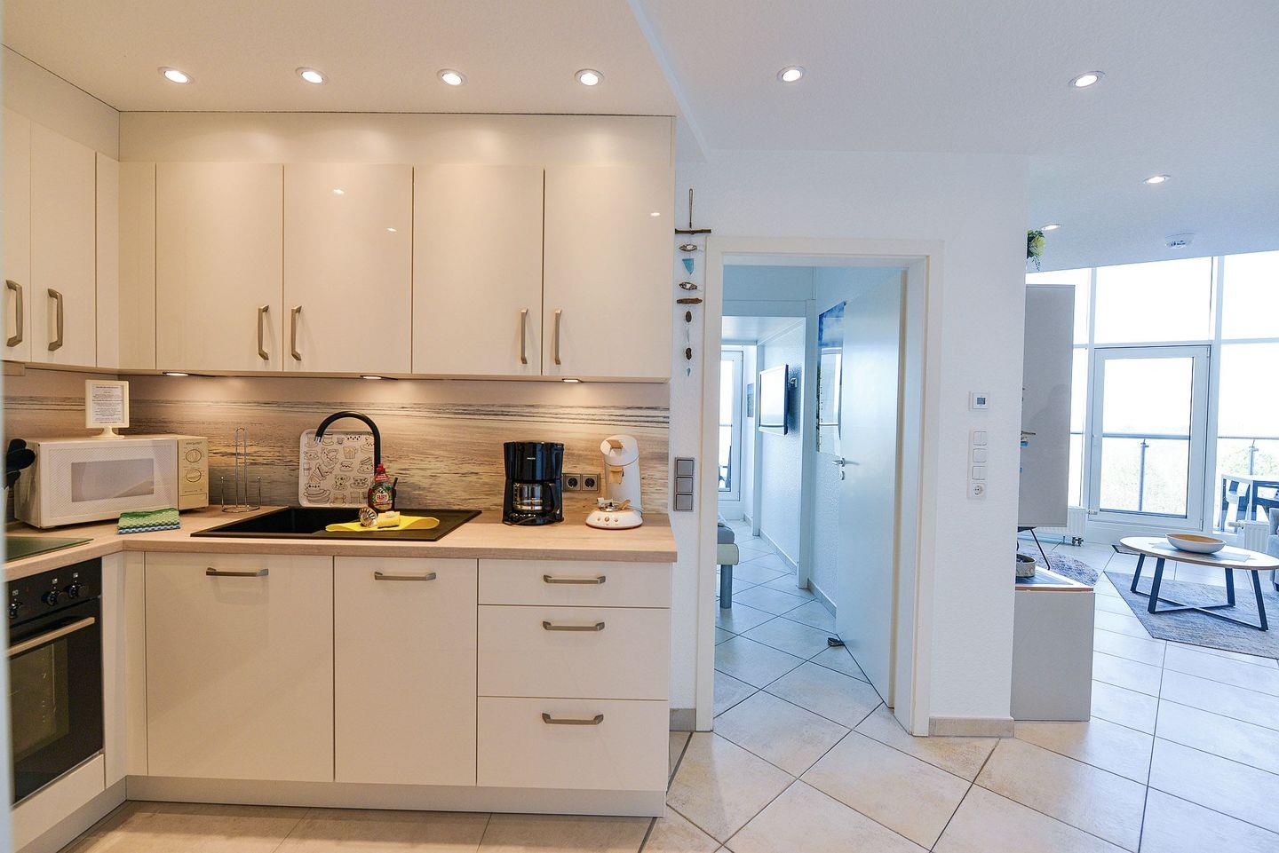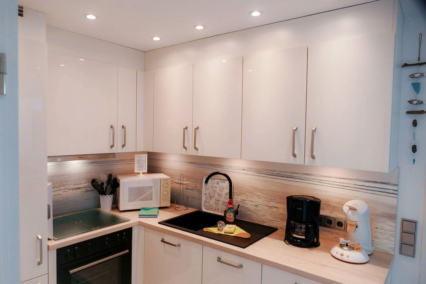 Die neue, voll ausgestattete Küche überzeugt nicht nur optisch, sondern auch funktional – inklusive Geschirrspüler, großem Kühlschrank und Senseo-Kaffeemaschine. Genießen Sie Ihre Mahlzeiten mit Blick auf das Meer – entweder im stilvollen Essbereich oder draußen auf dem Balkon.