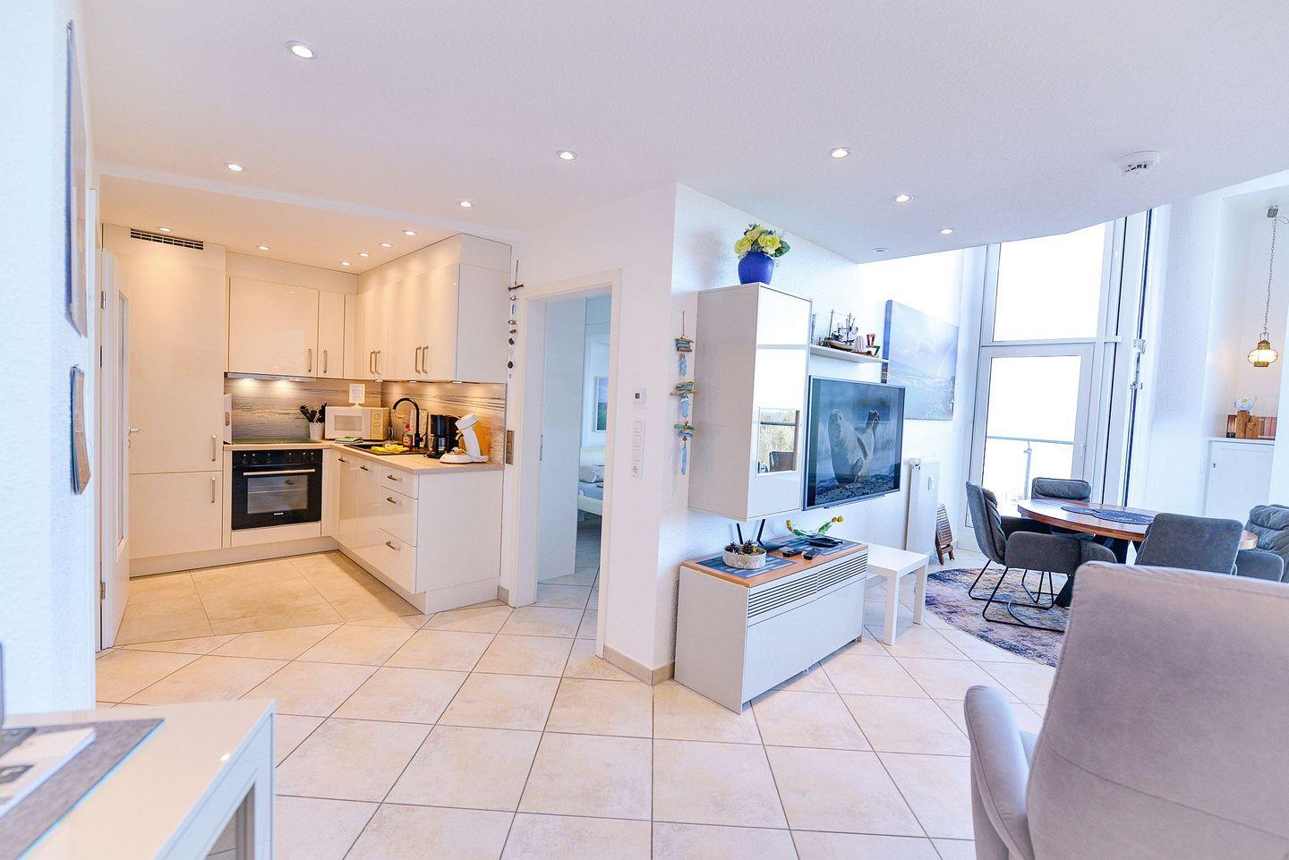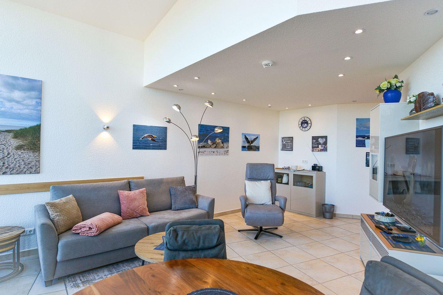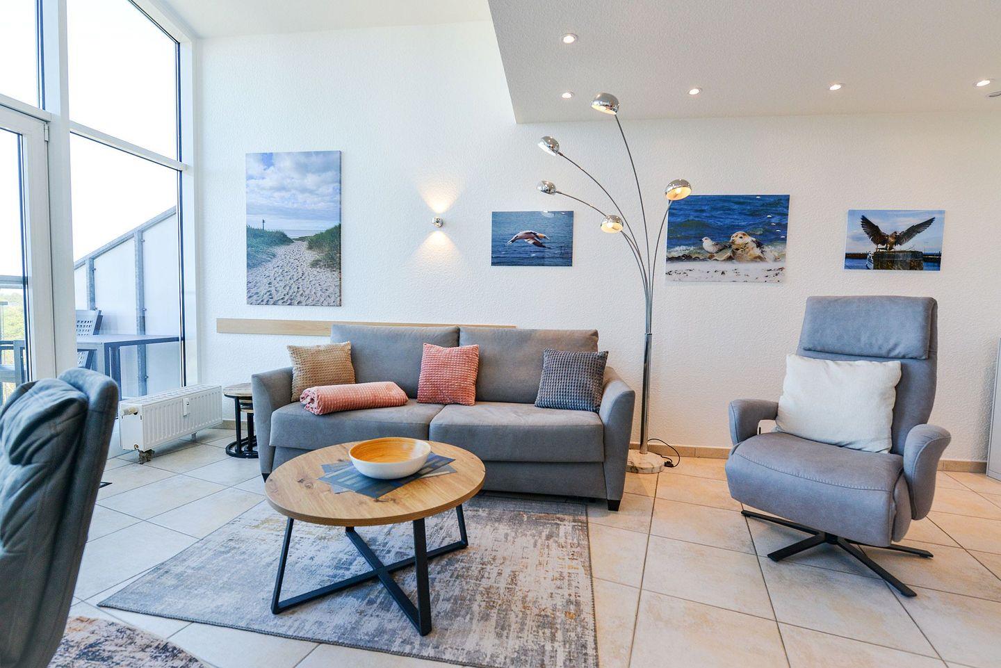 Modernes Penthouse im Haus Nordseebrandung in Cuxhaven-Sahlenburg. Zwei Balkone mit direkter Seesicht, stilvolle Einrichtung und hochwertige Ausstattung bieten den perfekten Rückzugsort für entspannte Tage an der Nordsee – mit Meerblick, Ruhe und Komfort über den Dächern von Sahlenburg.