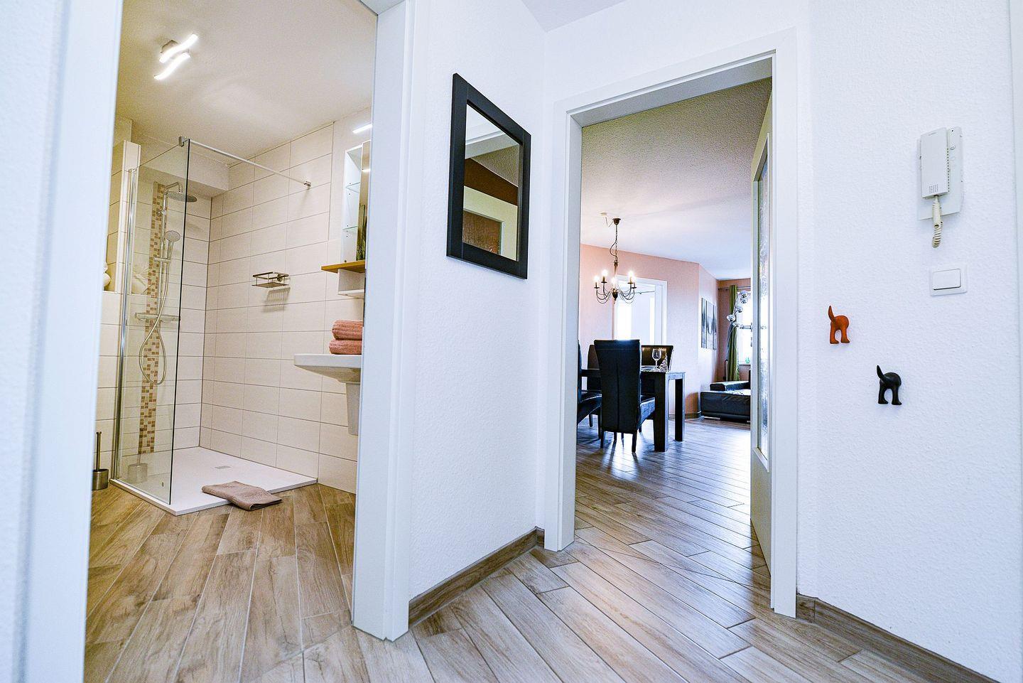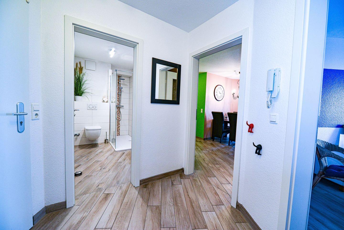 Urlauber, die gemeinsam mit Ihrem Hund verreisen sind genauso willkommen, wie Urlauber ohne Haustier. Für eine komfortable An- und Abreise bietet die Ferienwohnung einen kostenlosen Parkplatz in der Tiefgarage des Hauses. Saisonbedingt befindet sich ein Bäcker direkt im Haus.