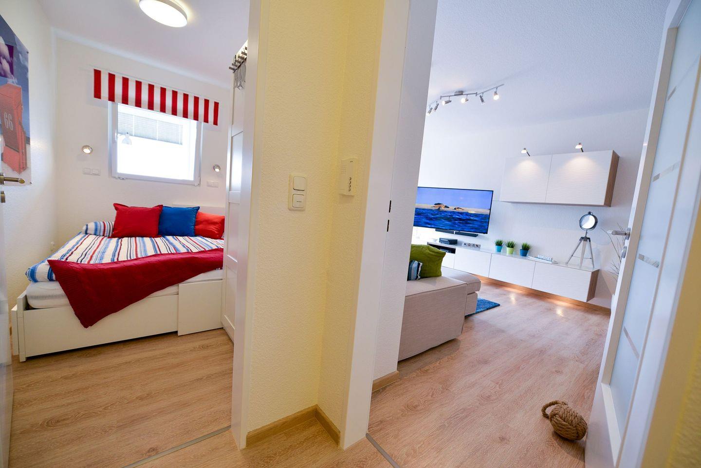 Die 50m² große und liebevoll eingerichtete Ferienwohnung für 2 bis 4 Personen begrüßt Sie mit modernem und charmantem Flair, Schwimmbad, Sauna und viel Raum für einen entspannten Urlaub im schönen Norden Deutschlands, Meeresrauschen mit seitlichem Seeblick inklusive!