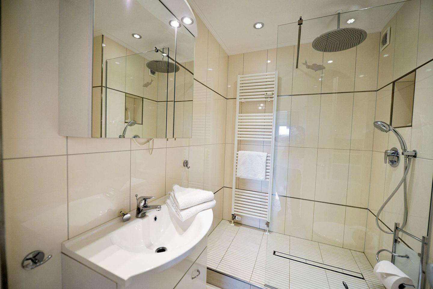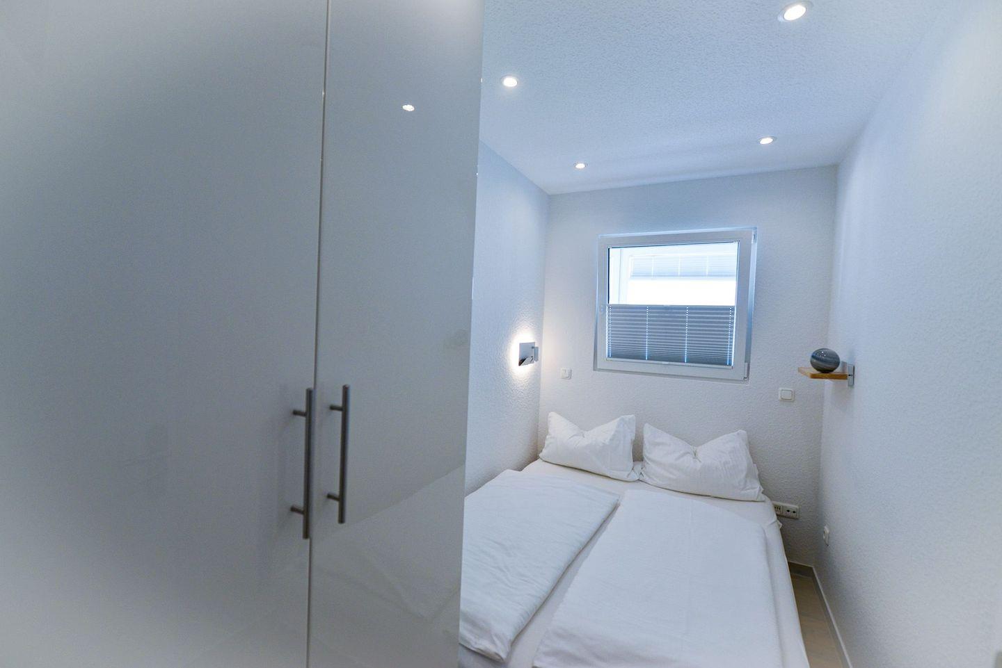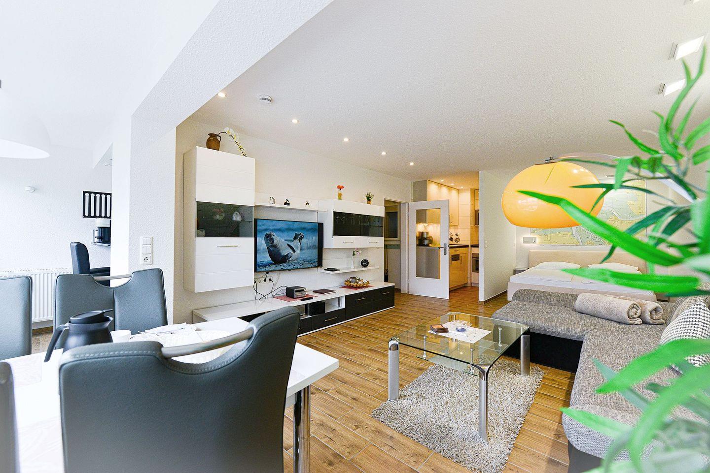 Ein separates Schlafzimmer mit Doppelschlafsofa, ein zusätzlicher Schlafplatz im Wohnbereich, eine offene Küche mit kompletter Ausstattung und ein modernes Bad mit ebenerdiger Dusche sorgen für Komfort. Die verglaste Südfensterfront lässt sich öffnen und bietet seitlichen Blick zur Nordsee. WLAN, zwei TVs sowie ein kostenfreier Parkplatz gehören zur Ausstattung. Die Sauna im Haus steht gegen Gebühr zur Verfügung. Hunde sind willkommen.