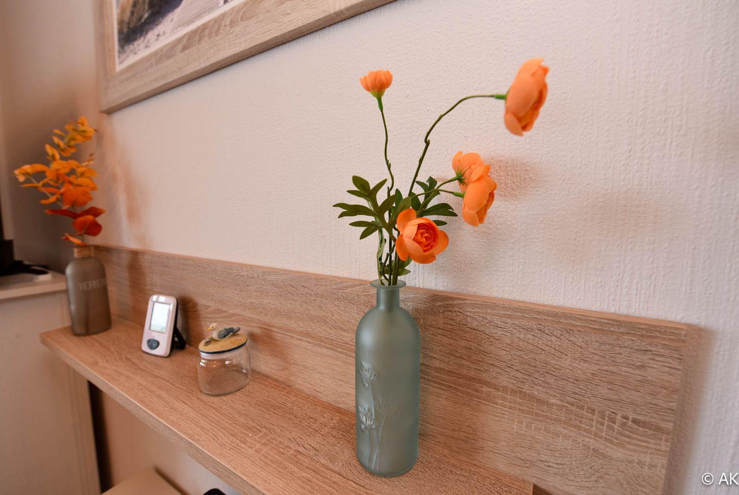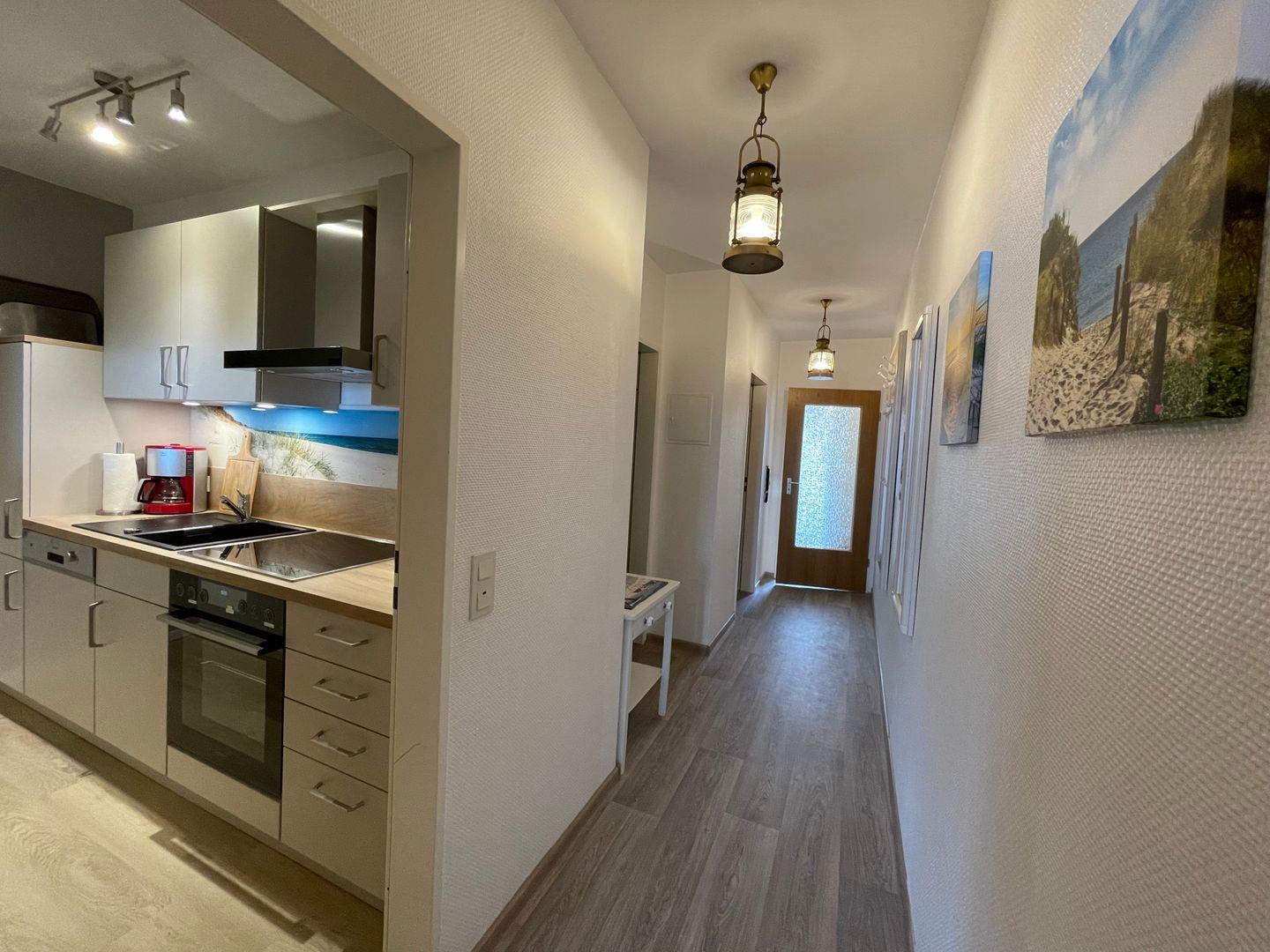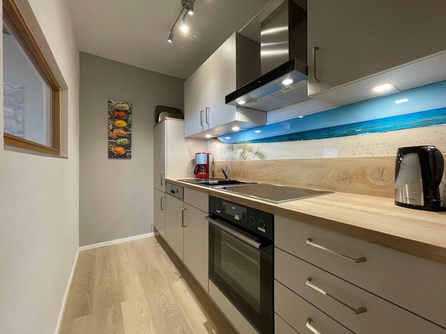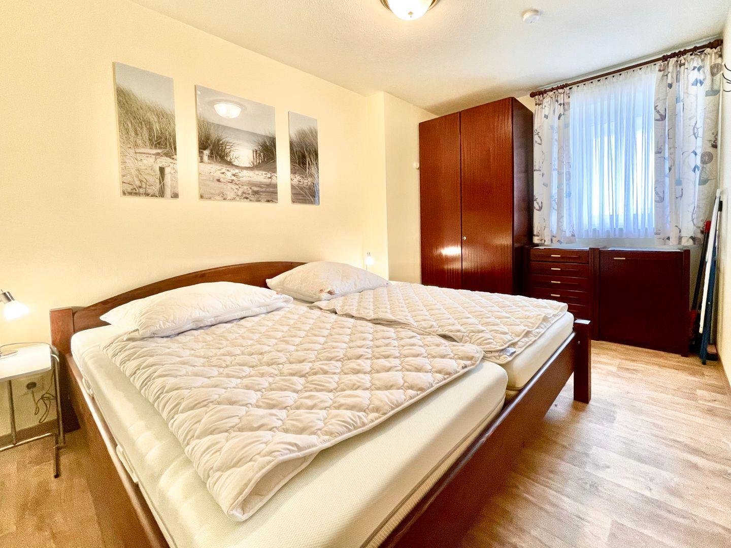 Das Appartement verfügt über ein separates Schlafzimmer, das mit einem Doppelbett ausgestattet ist. Die vom Wohnzimmer getrennte Küche bietet unter anderem einen Backofen sowie einen Geschirrspüler.