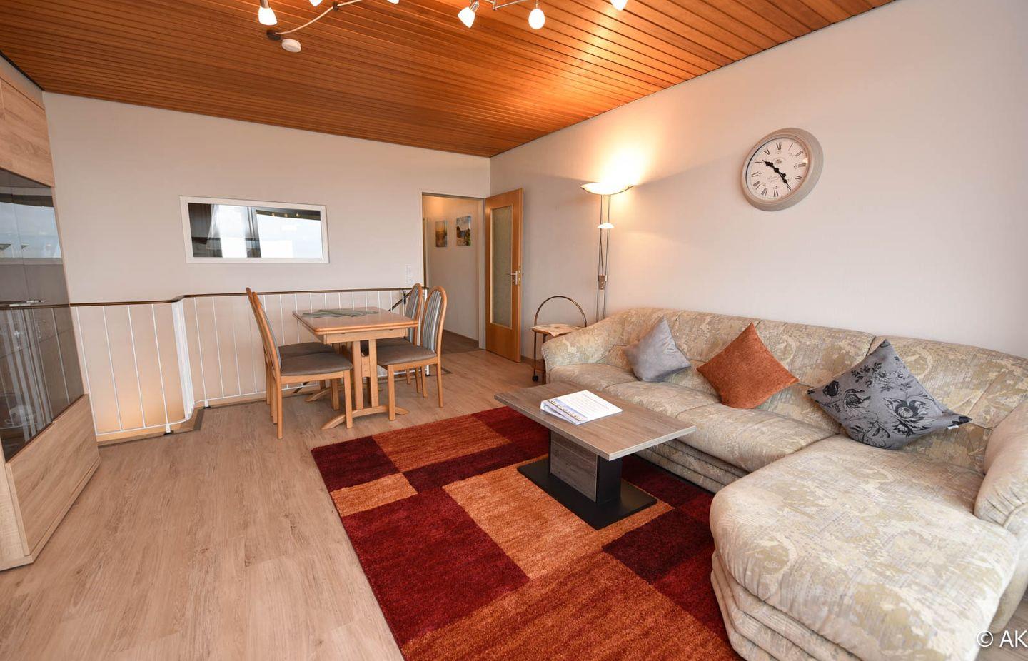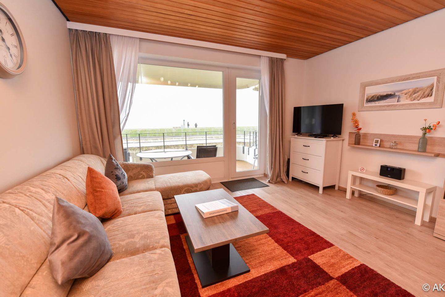 Das Wohnzimmer ist mit Vinylboden ausgestattet und bietet einen traumhaften Blick auf die Nordsee. Hier befindet sich zudem ein Esstisch, der zum gemütlichen Verweilen einlädt.