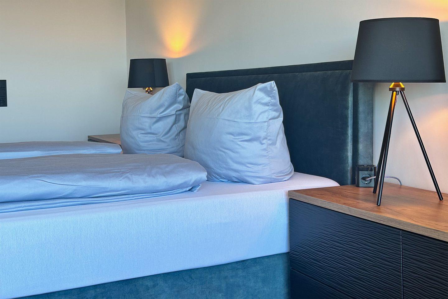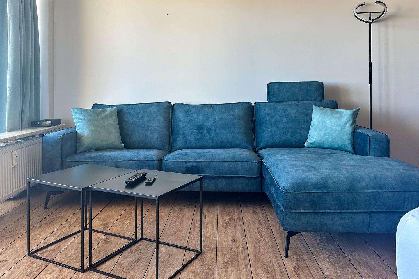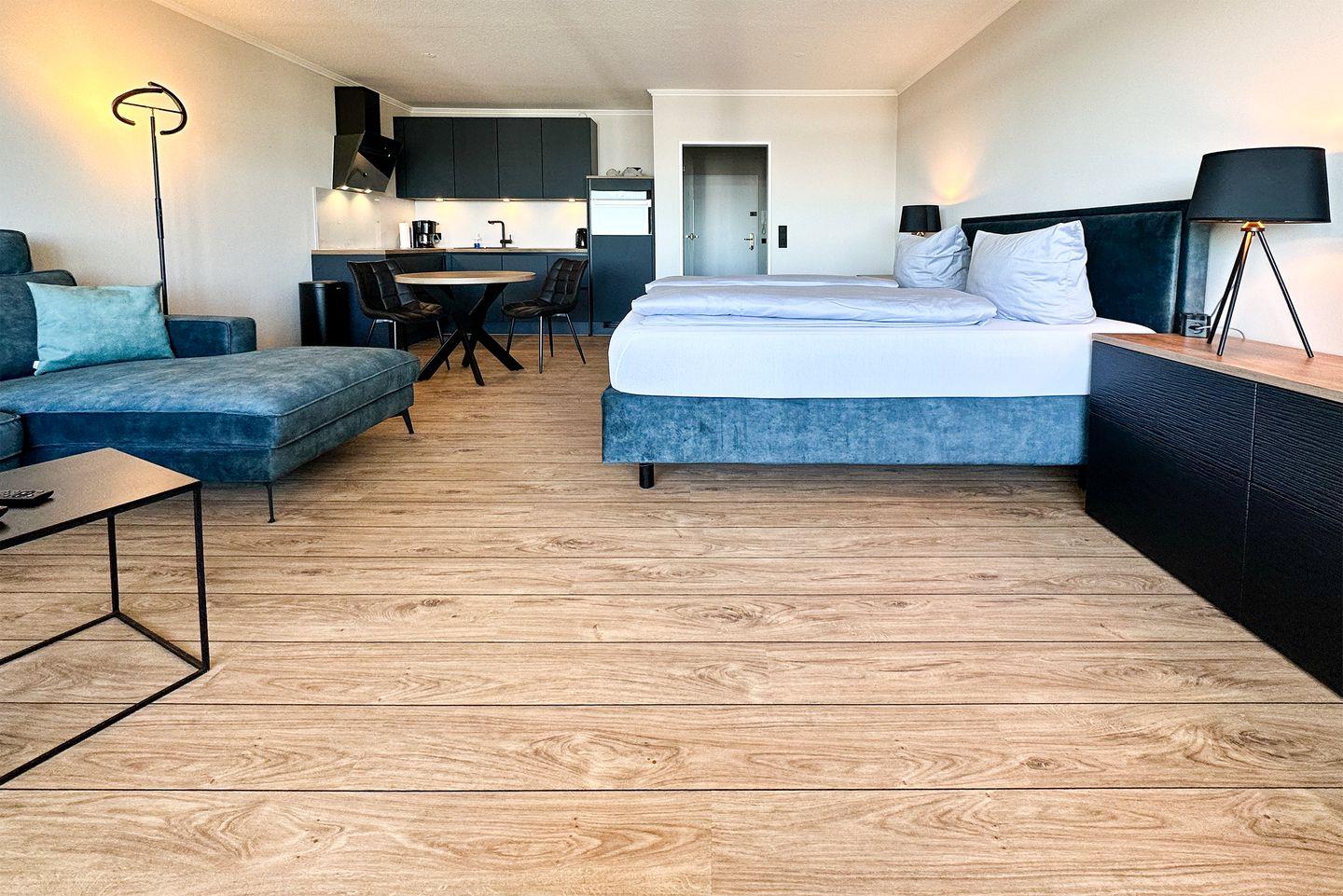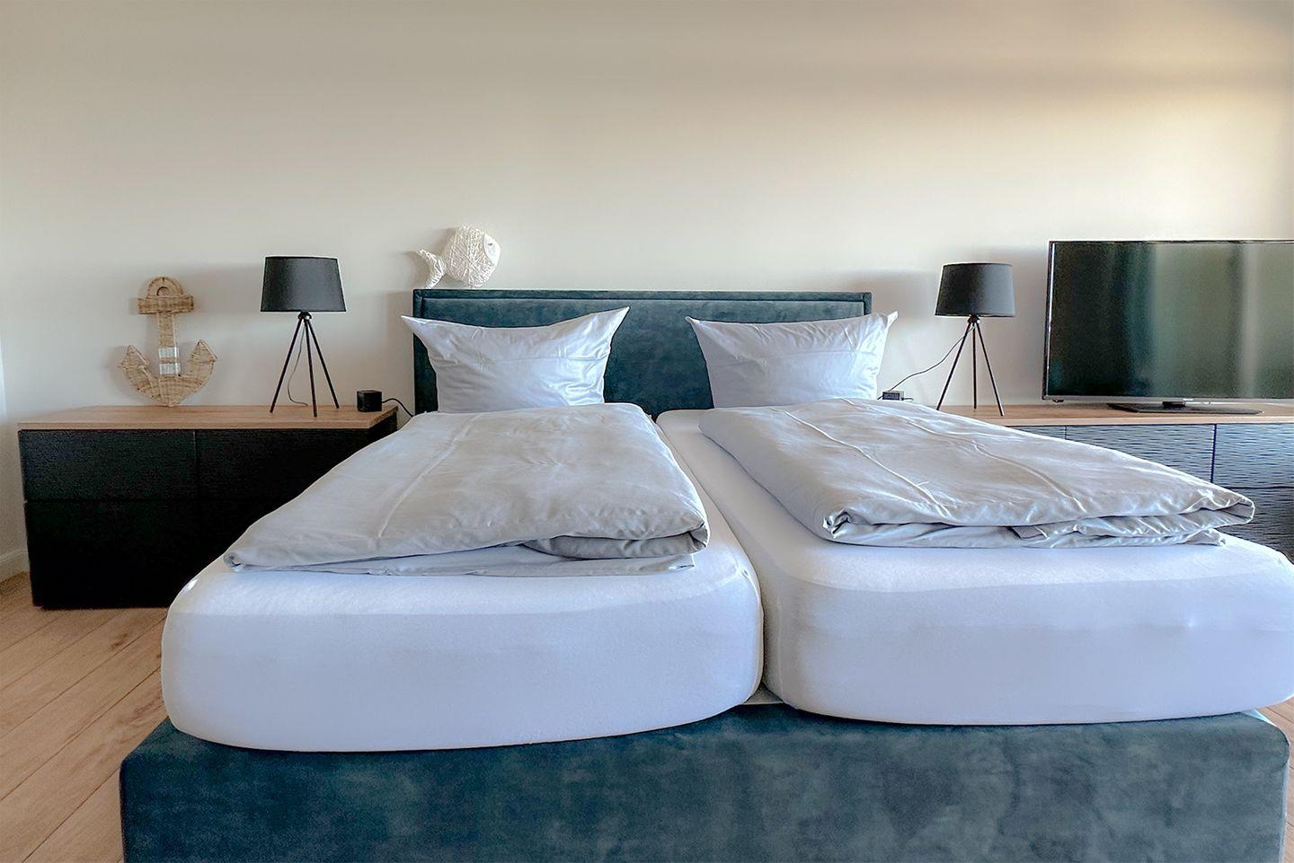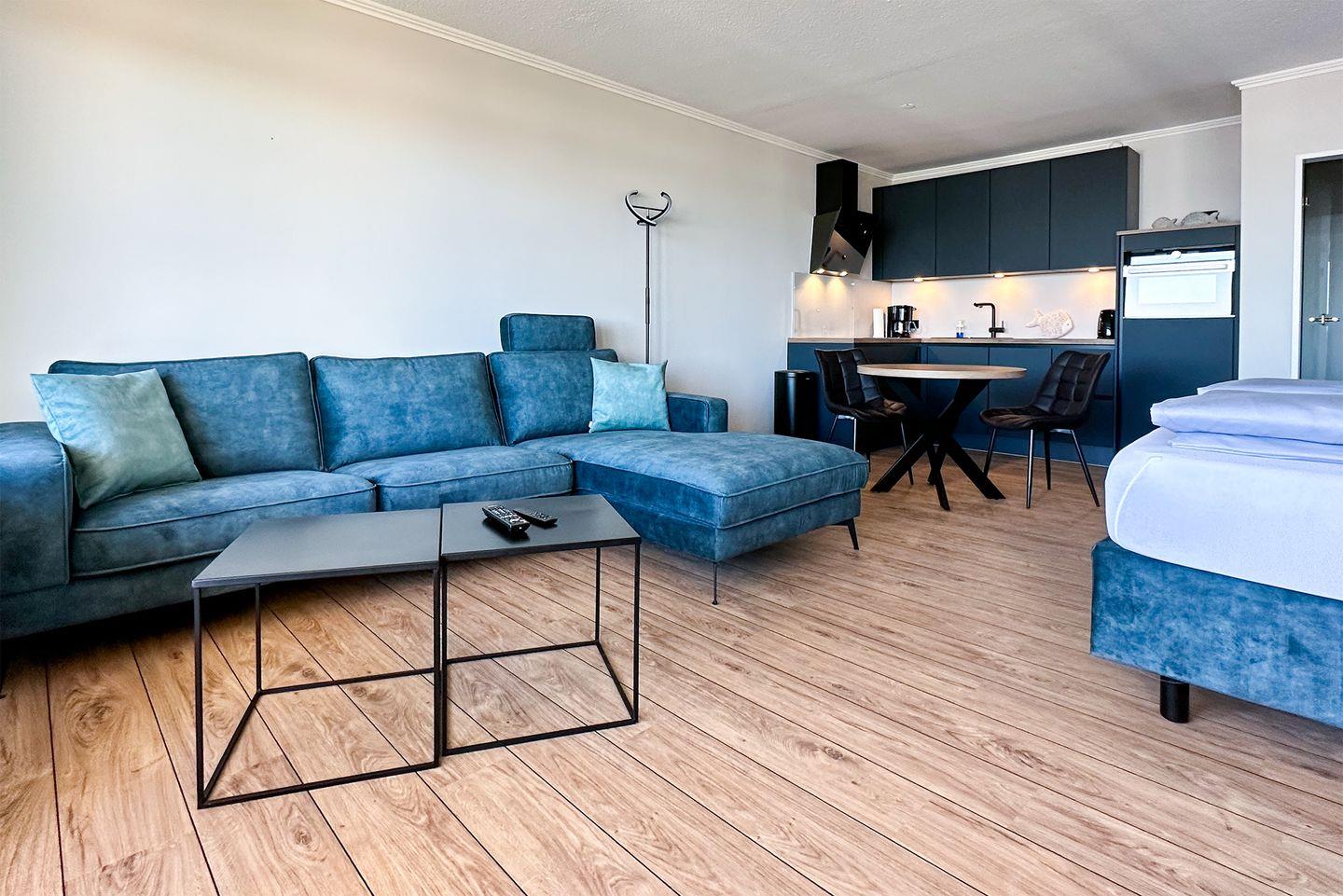 Das gemütliche Ecksofa mit Blick aufs Meer, die schöne Einbauküche sowie der bequeme Essplatz und das hochwertige Boxspringbett, ausgestattet mit Emma 25 Hybrid Matratzen, wird Sie entzücken.
