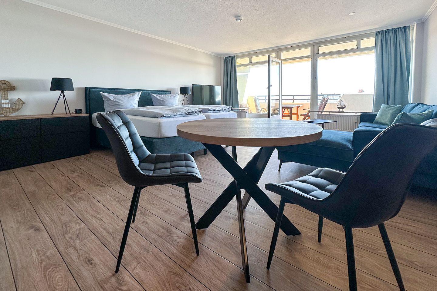 Panoramahaus Duhnen: Dieses geschmackvoll eingerichtete, große 1-Raum-Appartement mit Balkon und Meerblick in Richtung Nord-Ost direkt beim Dorfbrunnen im Herzen von Duhnen gelegen wurde im Frühjahr 2023 für Sie komplett renoviert.