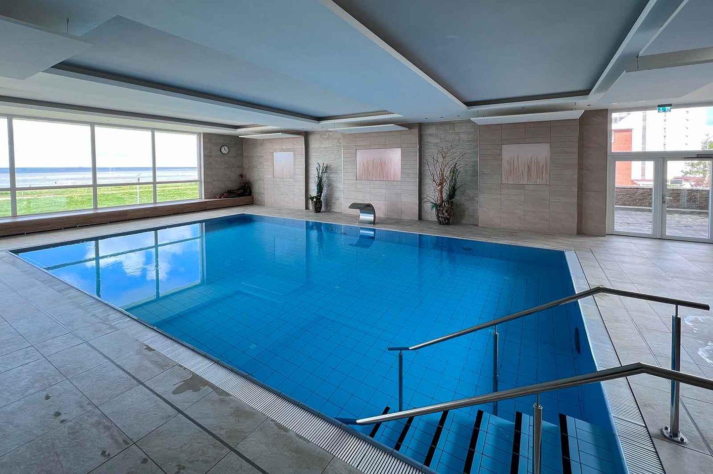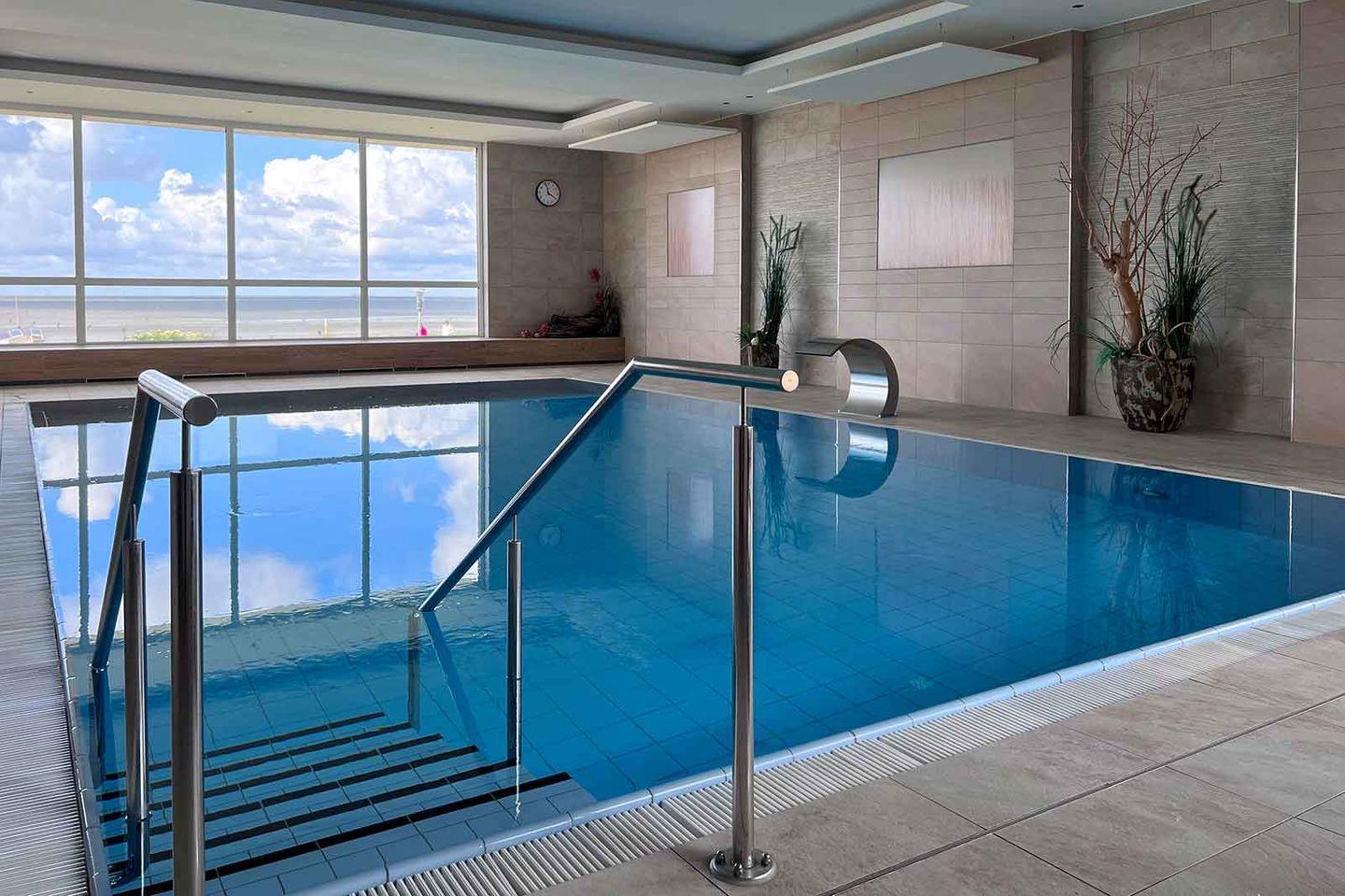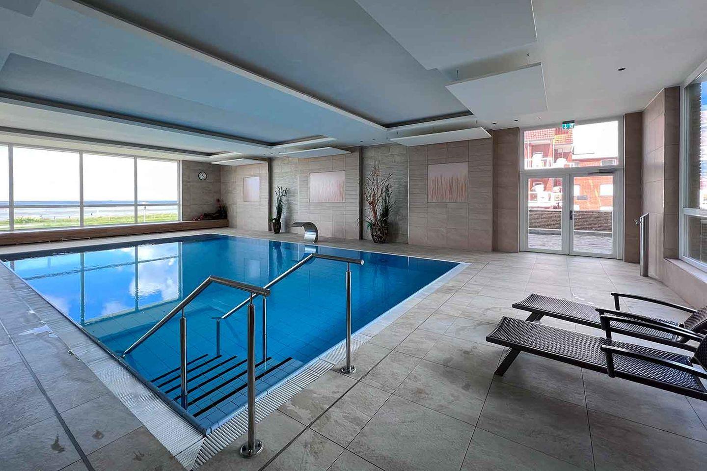 Ein modernes Schwimmbad mit Panorama-Meerblick auf die Nordsee und eine Sauna sowie ein Solarium befinden sich direkt im Haus und darf von den Gästen bei Verfügbarkeit kostenfrei genutzt werden.