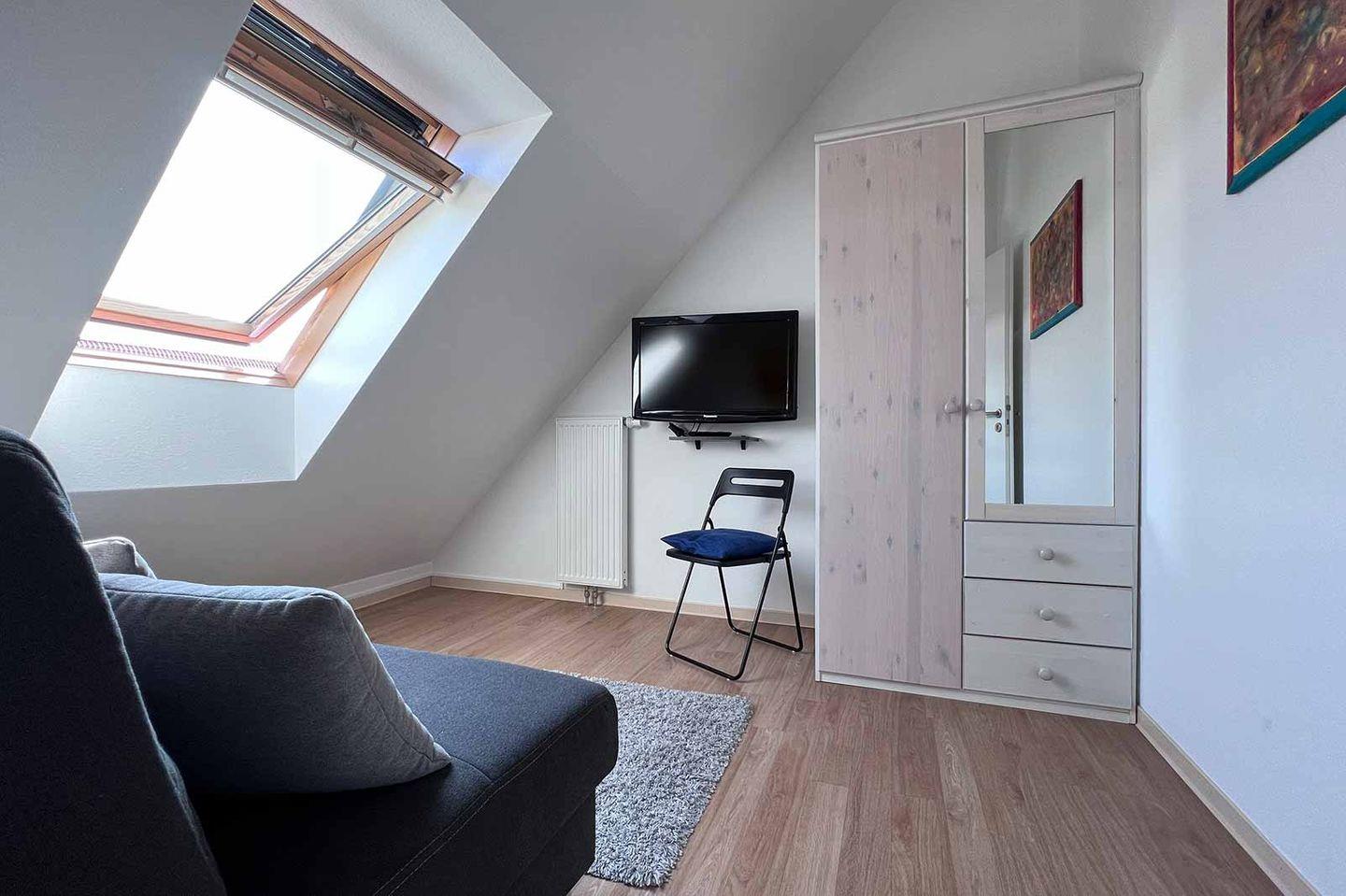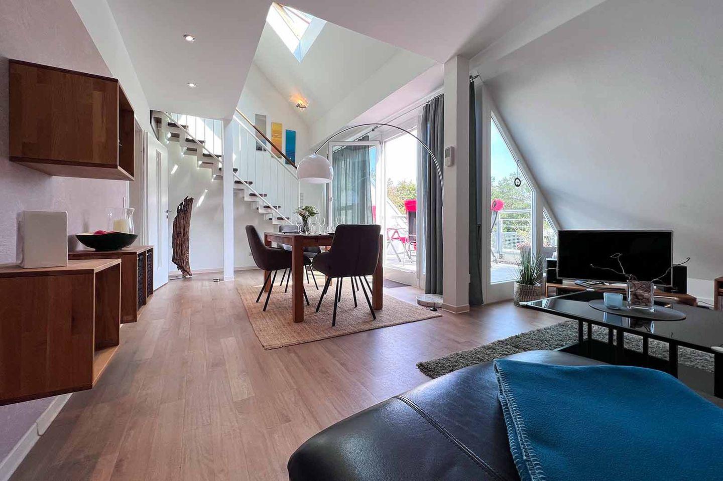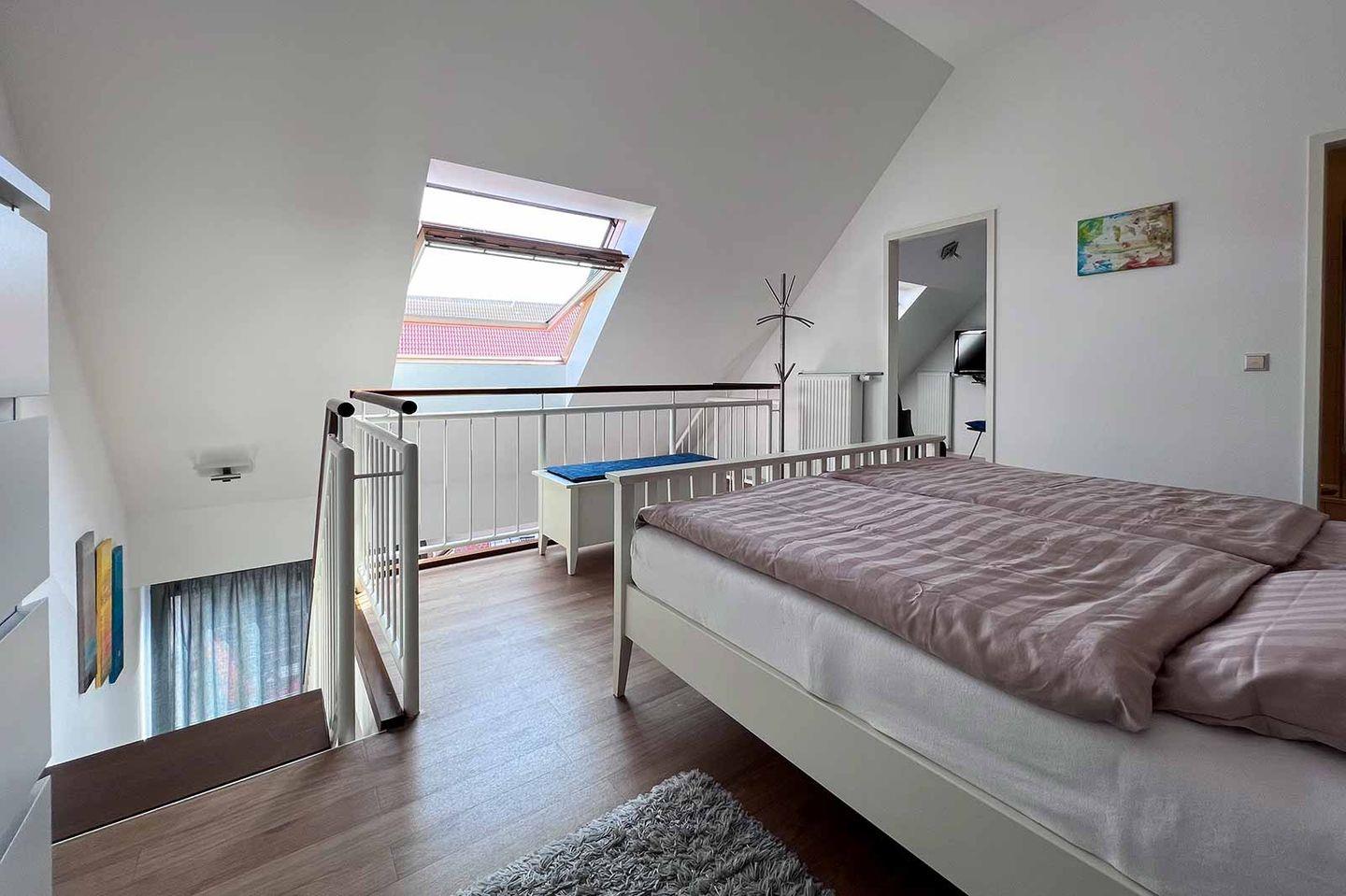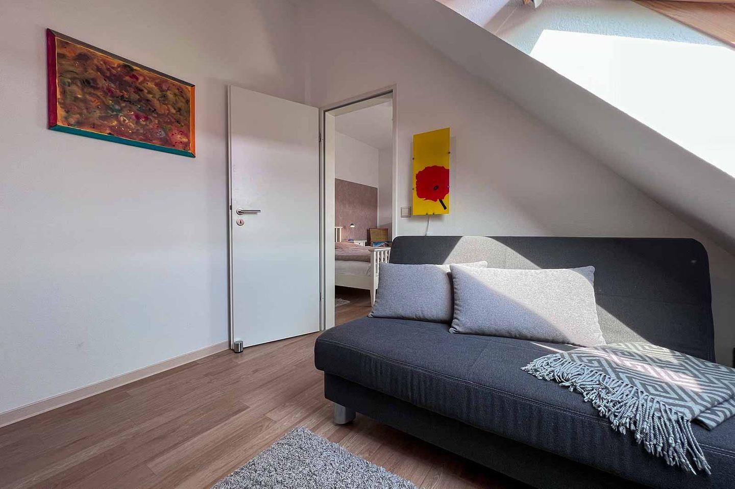 Die Wohnung befindet sich im vierten Stock eines gepflegten Mehrfamilienhauses und ist bequem über einen Aufzug erreichbar. Der geräumige Wohnbereich ist geschmackvoll eingerichtet und zeichnet sich durch einen hochwertigen Vinylboden aus. Hier können Sie entspannen und die gemeinsame Zeit genießen, etwa bei einem Filmabend vor dem Fernseher. Zudem stehen Ihnen eine HiFi-Anlage und ein DVD-Spieler zur Verfügung, sodass Sie sich auf ein unterhaltsames Freizeitprogramm freuen können.