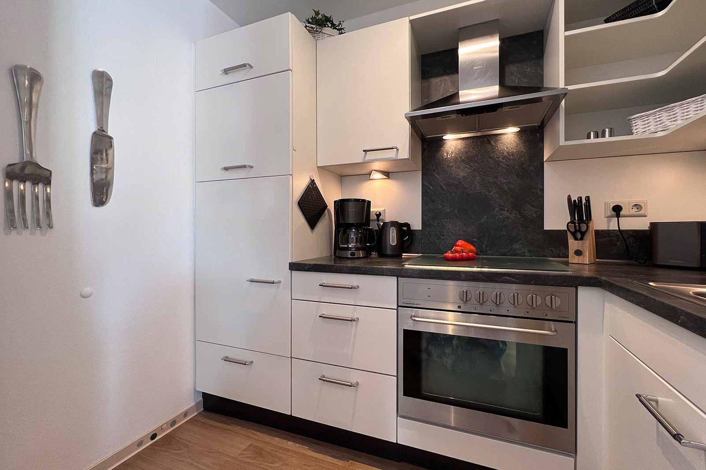 Die offene Küche verbindet sich harmonisch mit dem Essbereich und ist mit modernen Geräten ausgestattet, darunter ein Ceran-Herd, ein Kühlschrank mit Gefrierfach, eine Spülmaschine, eine Mikrowelle und sogar eine Espressomaschine für Ihren täglichen Kaffeegenuss. Kleine Extras wie ein Wasserkocher, Toaster und Eierkocher runden die Küchenausstattung ab. Genießen Sie Ihre Mahlzeiten entweder im Esszimmer oder auf dem Balkon, der Ihnen einen wunderbaren Ort bietet, um die angenehmen Luft der Küste zu genießen.
