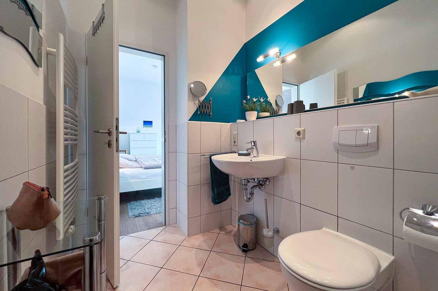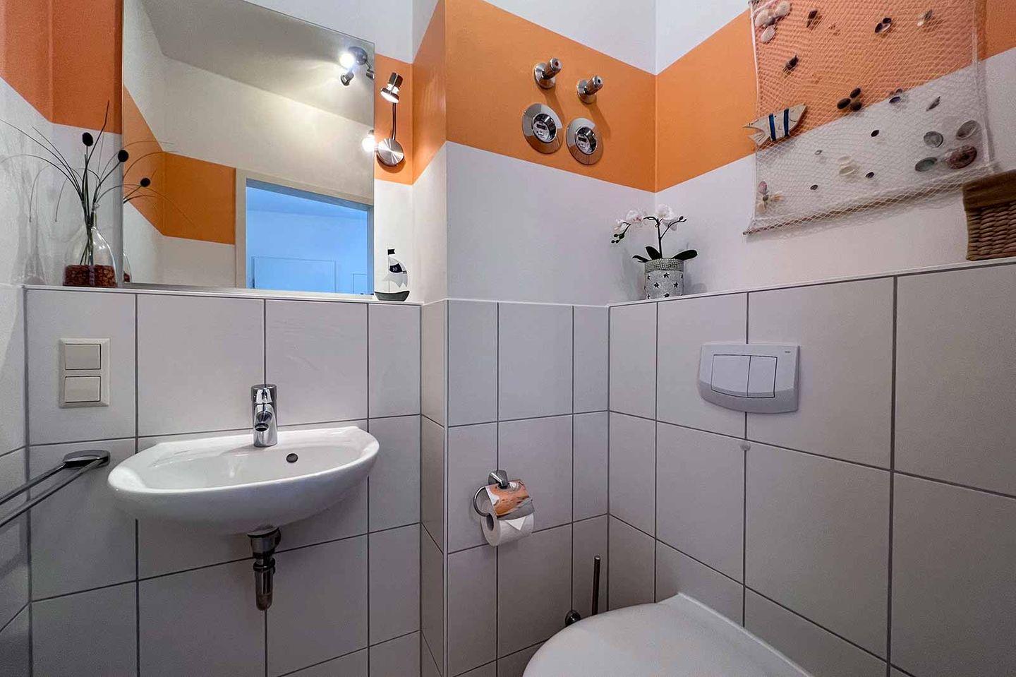 Für zusätzlichen Komfort sorgt das Badezimmer, ausgestattet mit einer Dusche, sowie ein separates Gäste-WC. Zu den praktischen Annehmlichkeiten gehören ein Haartrockner im Badezimmer und eine Waschküche mit Waschmaschine, Trockner und Bügelbrett, die gemeinschaftlich genutzt werden.