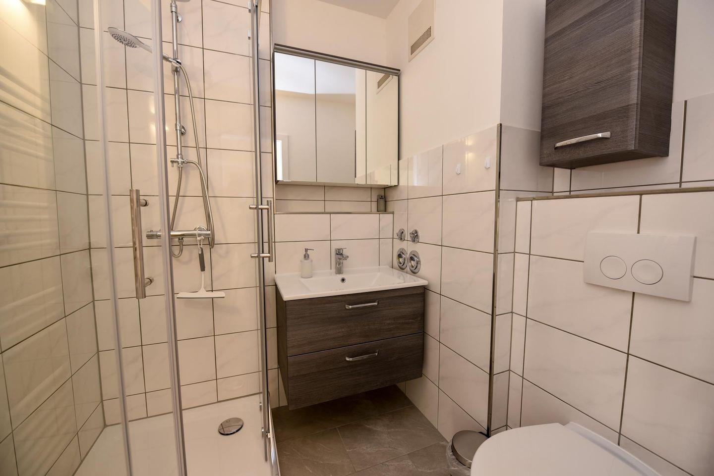Das hell geflieste Badezimmer verfügt über einen tiefen Duscheinstieg
