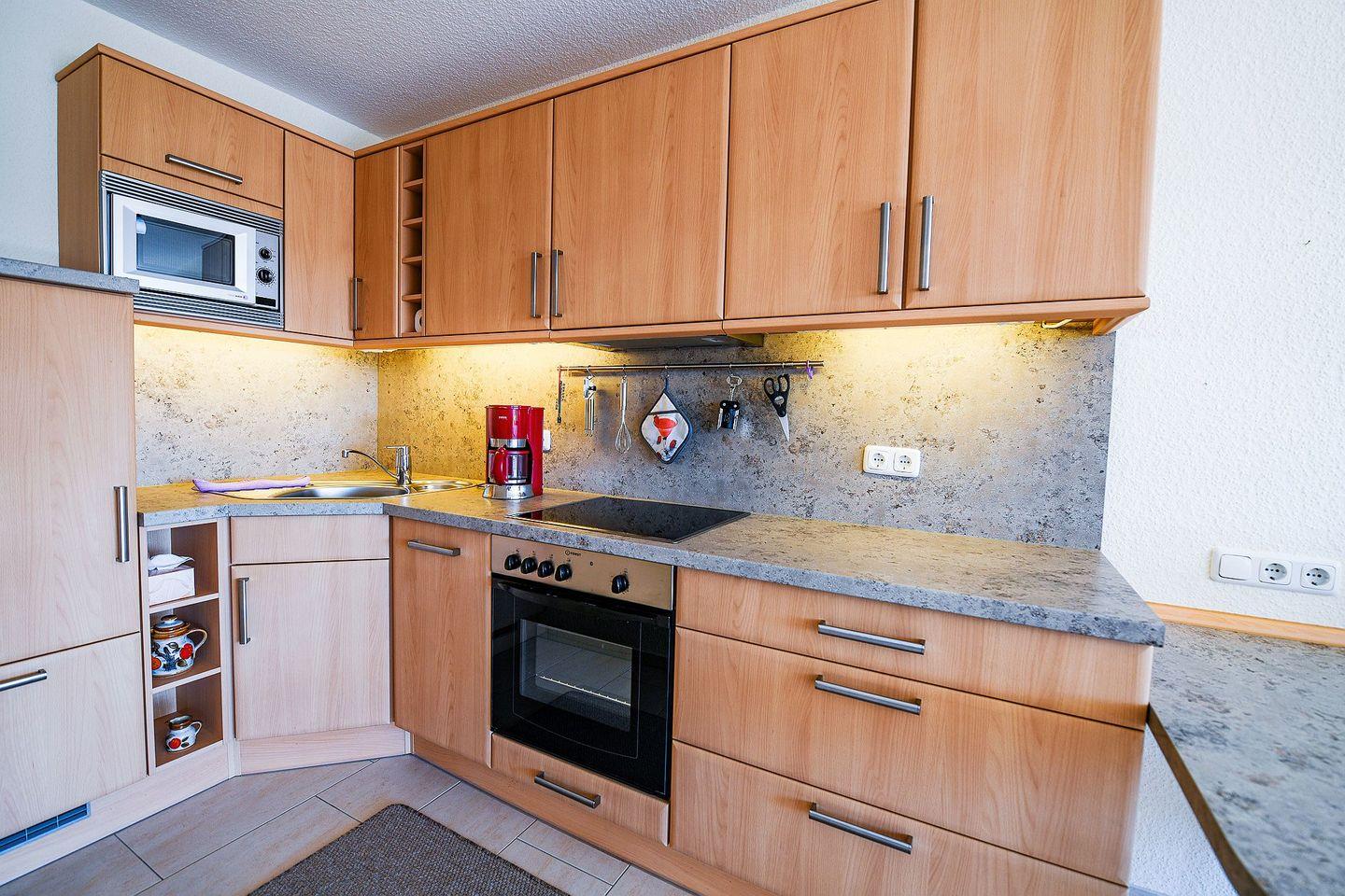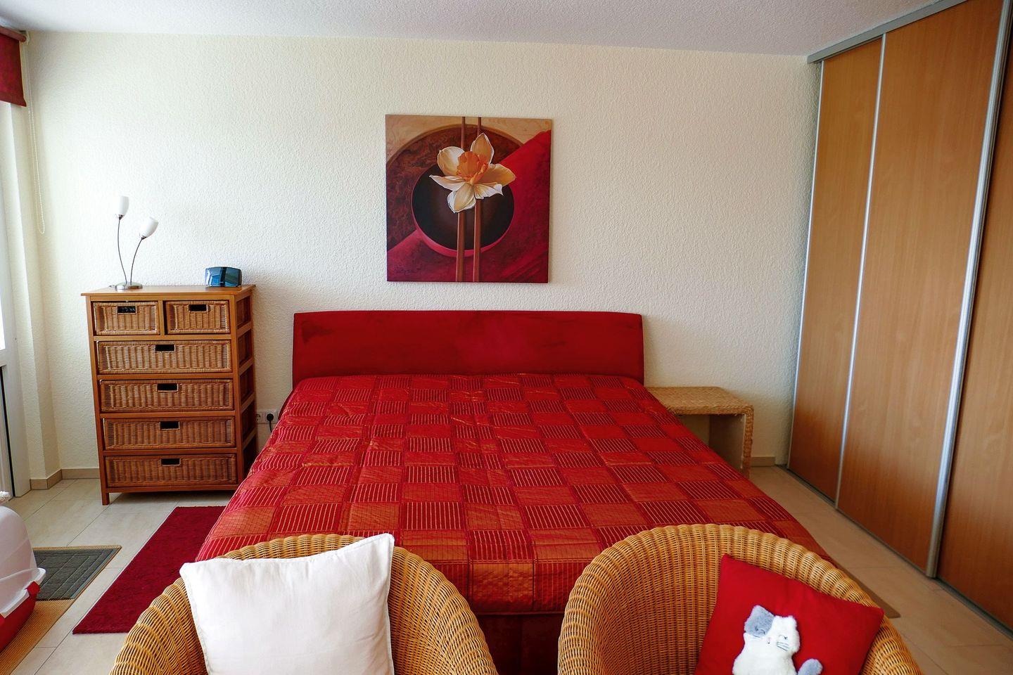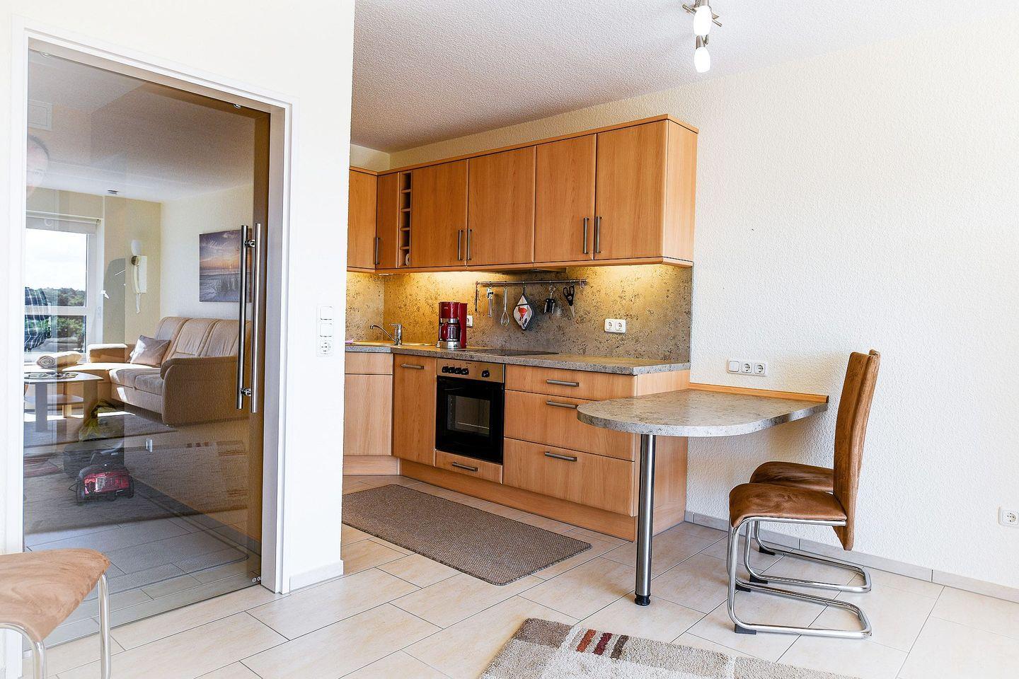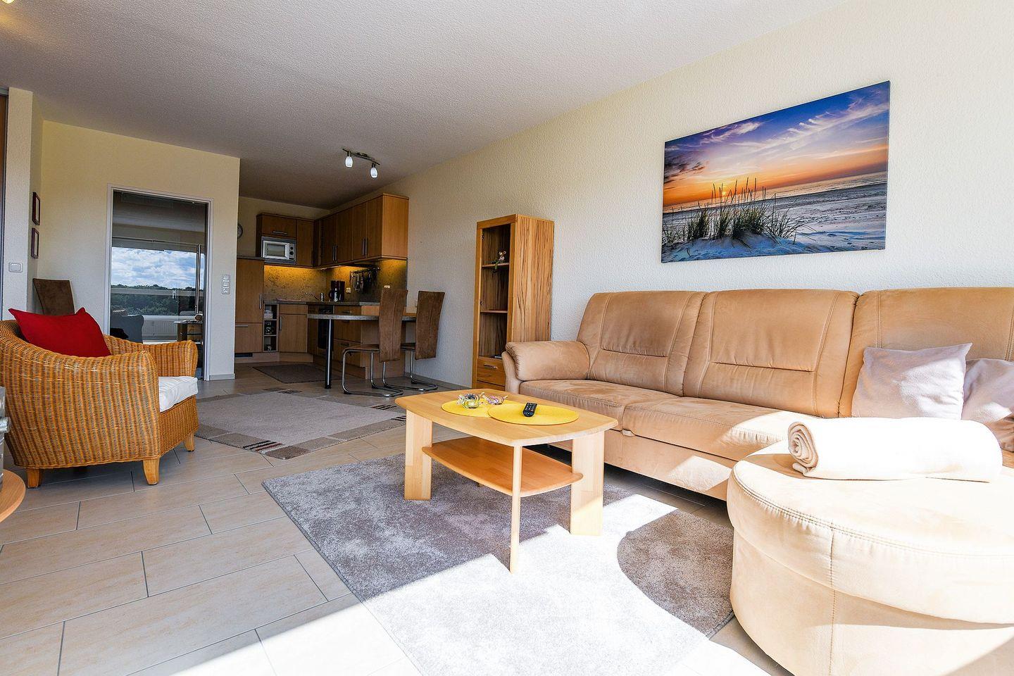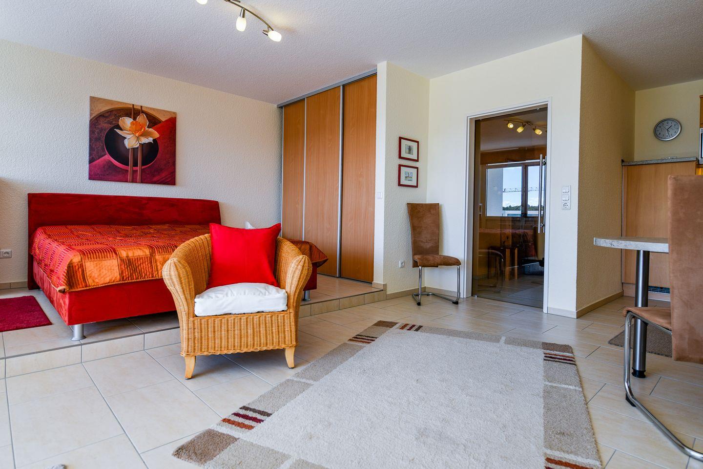 Das modern eingerichtete Einraumapartment ist eine Wohlfühlwohnung für einen entspannten Nordseeurlaub. Es bietet ein komfortables Doppelbett, einen Flachbild-TV sowie eine offene, komplett ausgestattete Küche. Das neube Bad ist mit Dusche und WC ausgestattet. Auf dem geschützten Südbalkon genießen Sie die Sonne und einen seitlichen Blick auf Strand und Meer.