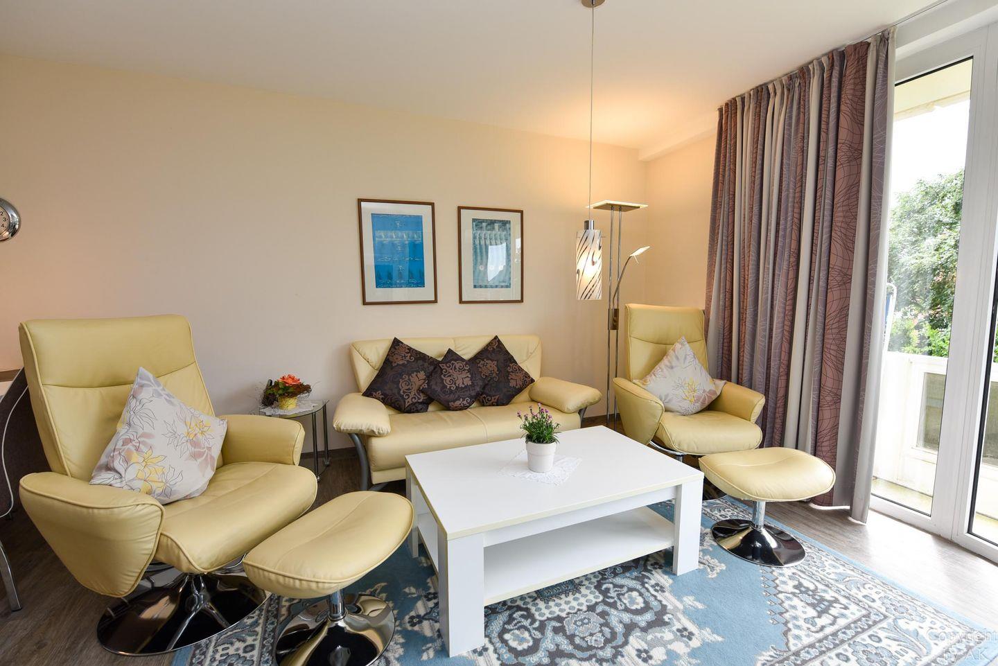 Geräumiges und hochwertig eingerichtetes Ferienappartement im Haus Trafalger. Der Wohnbereich ist u.a. mit einem Ledersofa, 2 Relax-Sesseln und einer Essecke ausgestattet. Als Unterhaltungselektronik stehen den Gästen ein Internetradio, ein großer Flachbild-TV, ein Telefon und ein DVD-Player zur Verfügung.