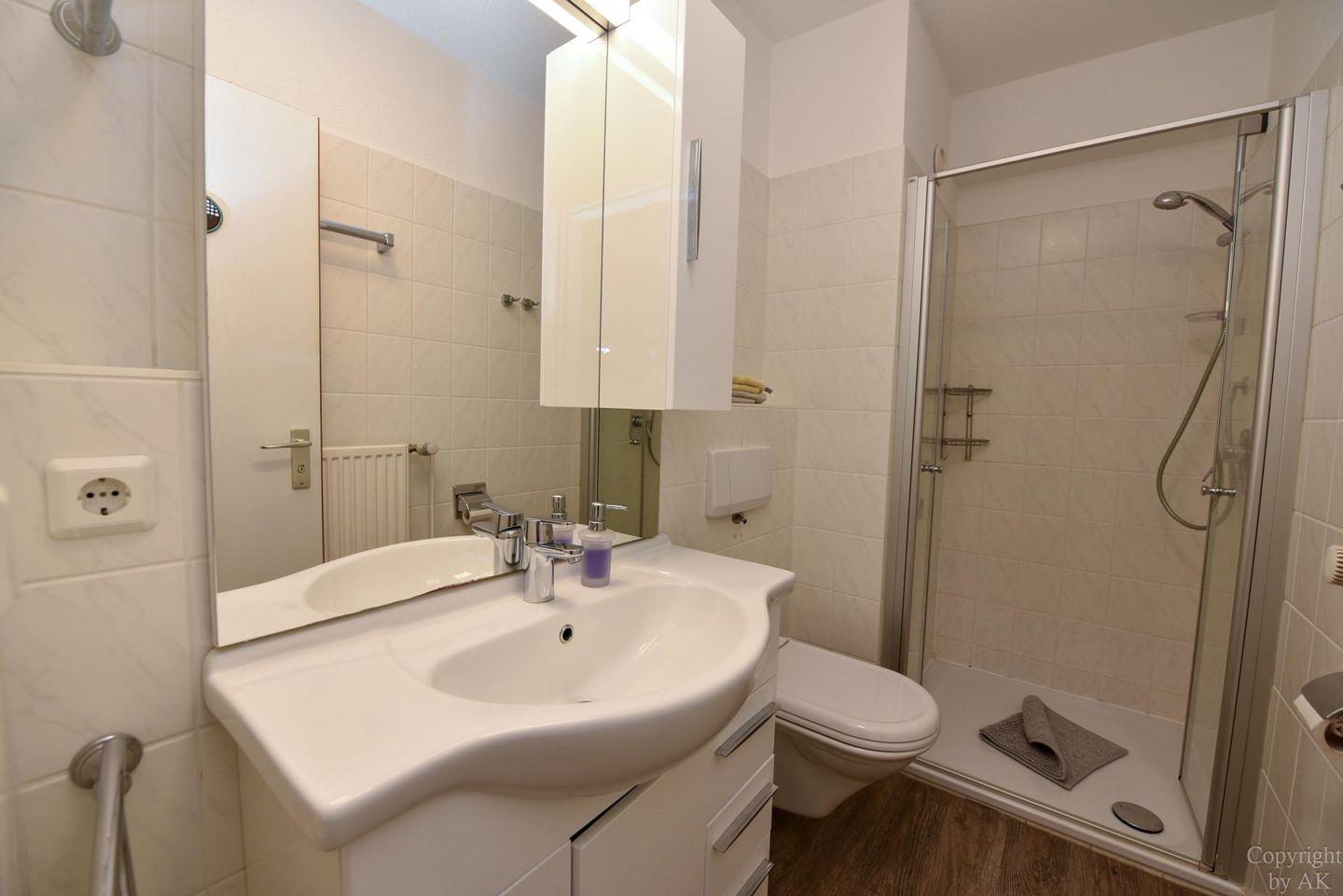Das Badezimmer ist mit einer Dusche, einem WC und einem Waschtisch mit Ablageflächen ausgestattet, um Ihren Komfort zu gewährleisten.