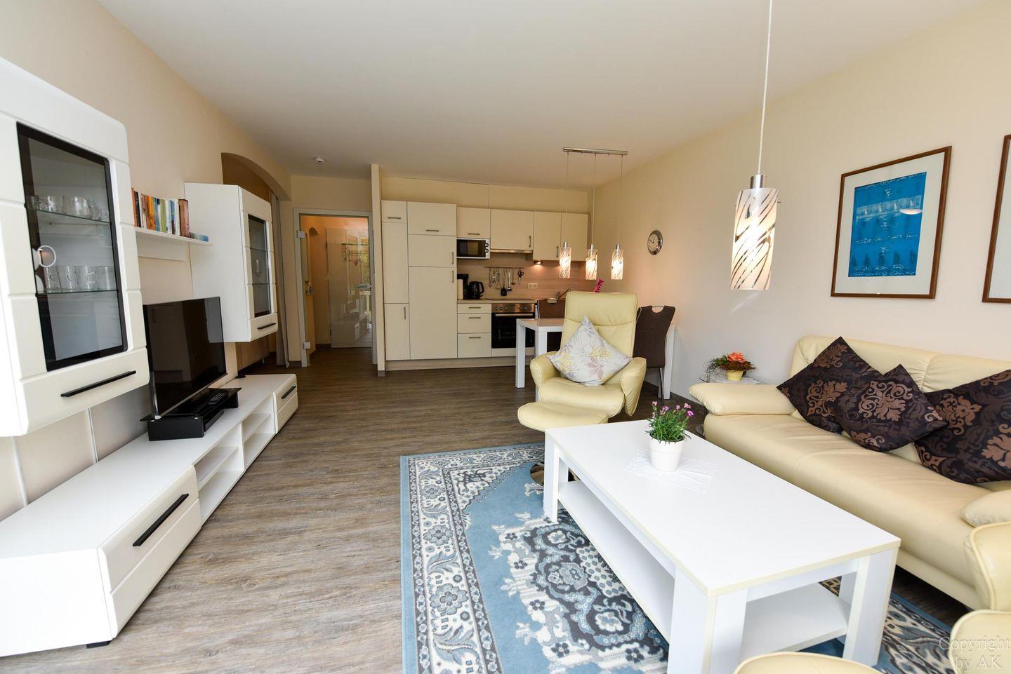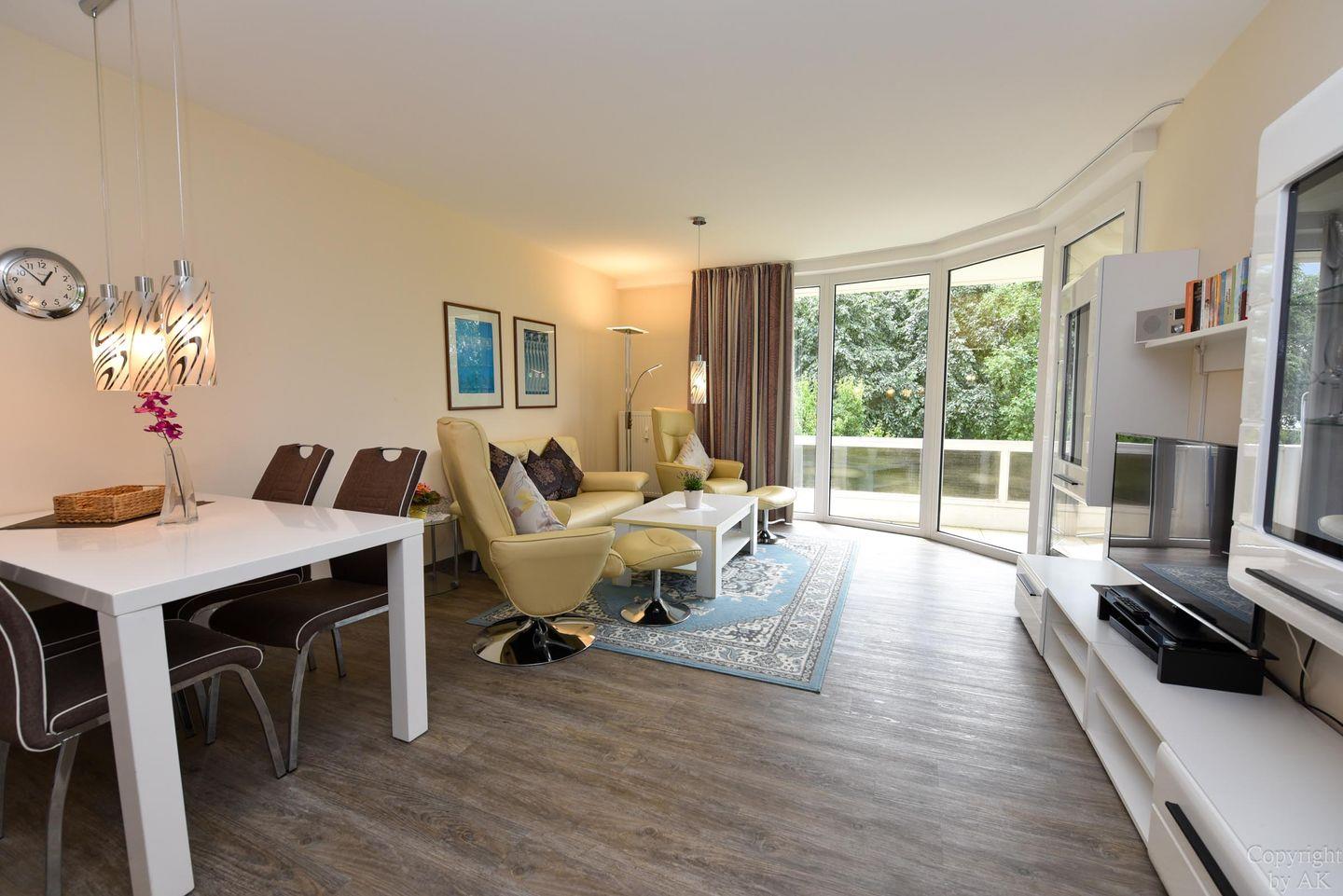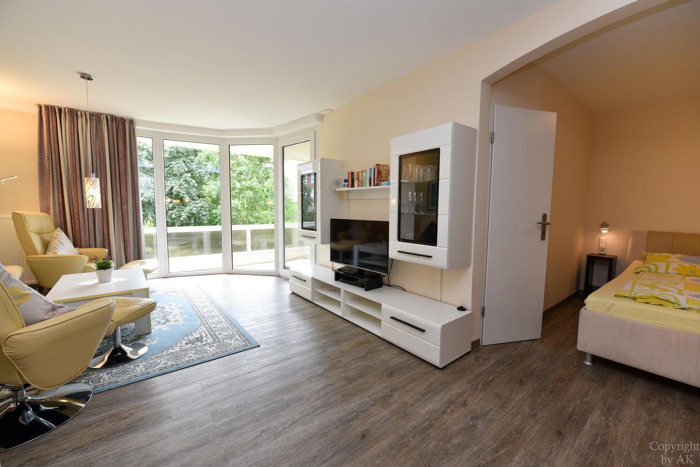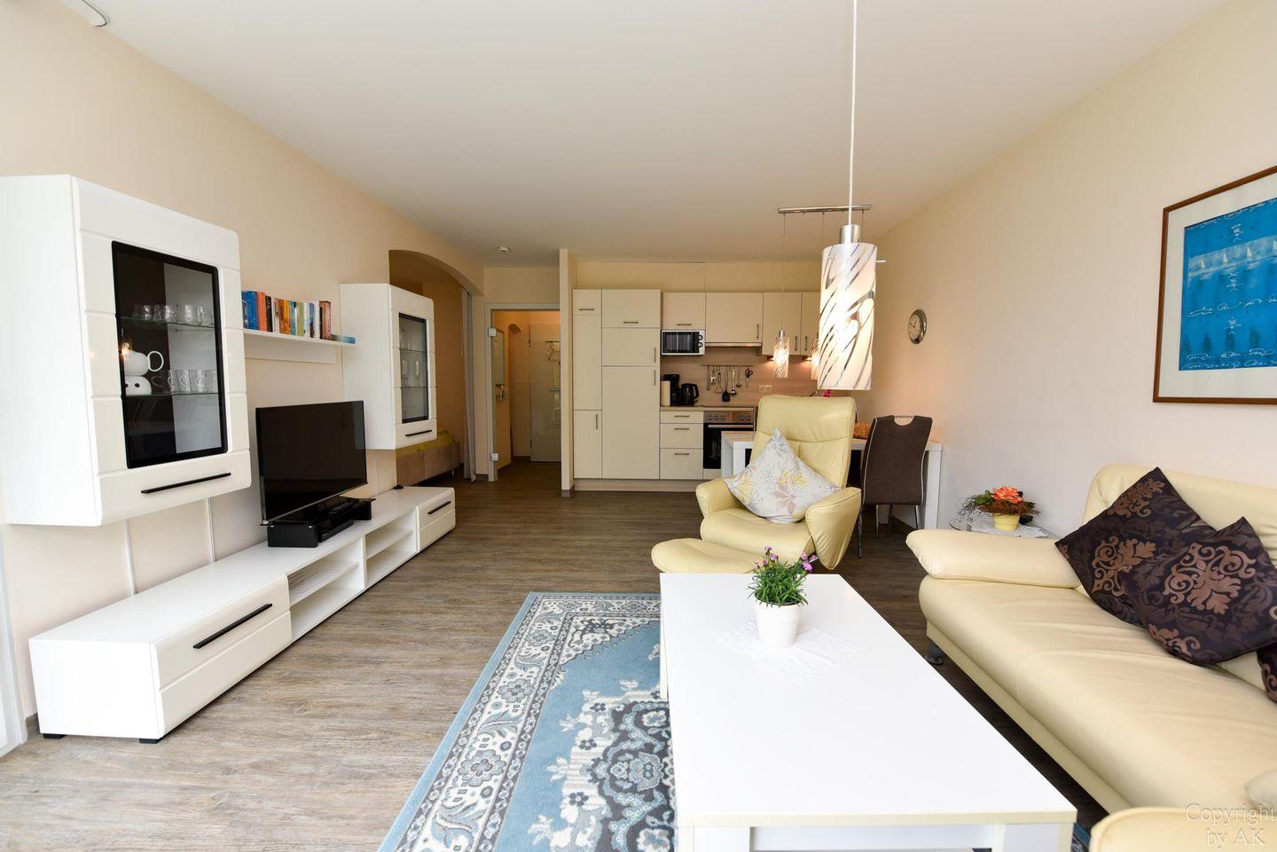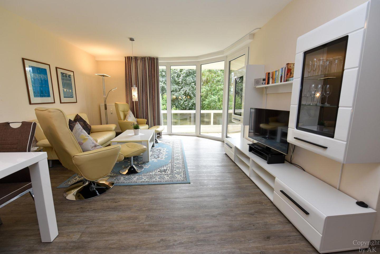 Hochwertig eingerichtetes Ferienwohnung im Haus Trafalger mit Süd-Balkon, separatem Schlafzimmer, moderner Küche, komfortablem Wohnbereich und umfassender Unterhaltungstechnik.