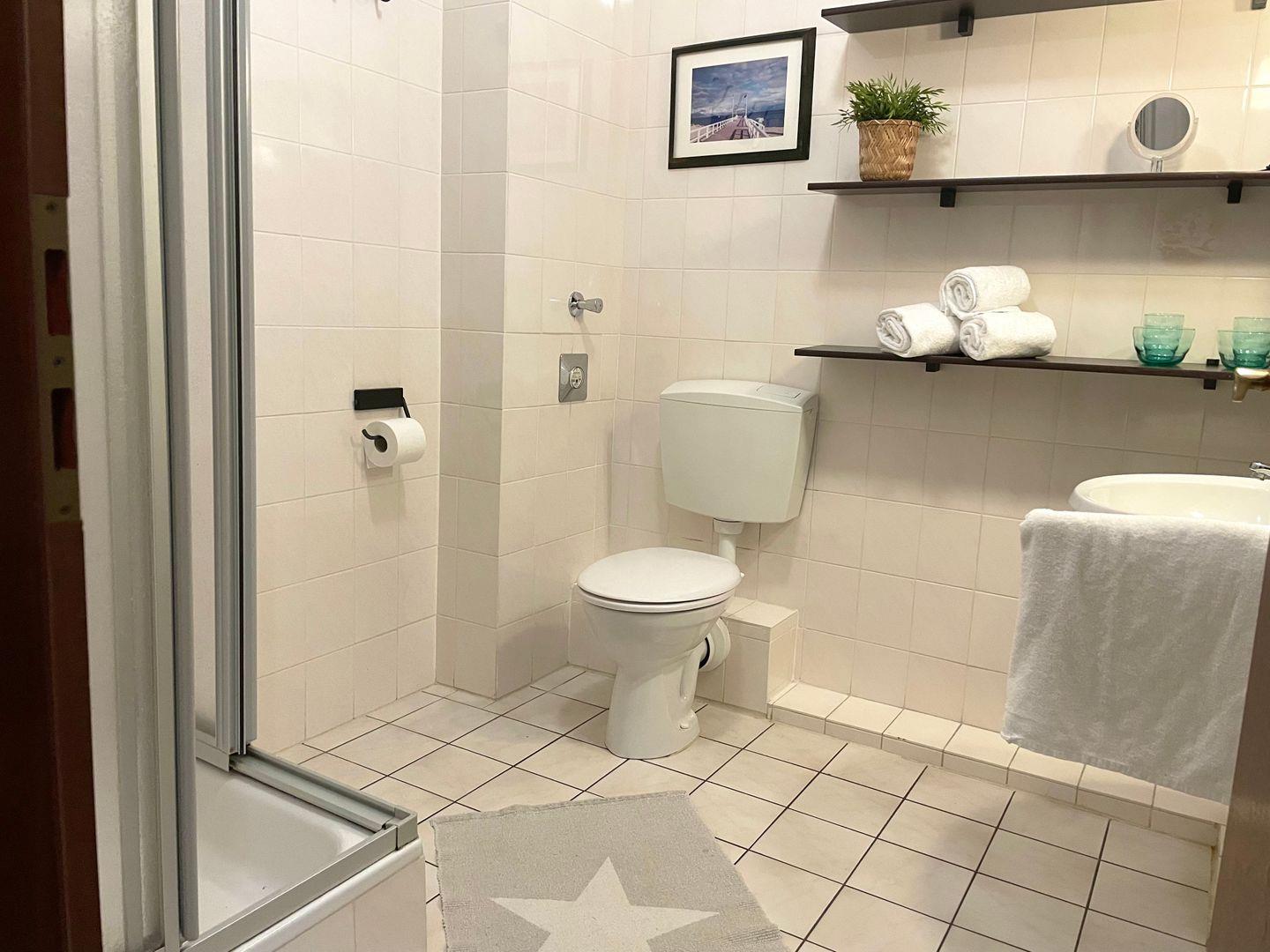Praktisch für den Alltag: Im Haus stehen Ihnen eine Münzwaschmaschine, ein Trockner sowie ein abschließbarer Fahrradraum zur Verfügung. Ihr Auto können Sie bequem vor dem Haus parken oder in die Tiefgarage mit eigenem Parkplatz (nicht für besonders große Autos geeignet) fahren. Die Wohnung ist barrierearm und ohne Treppen erreichbar – ideal für Gäste mit Mobilitätseinschränkungen oder Kinderwagen.