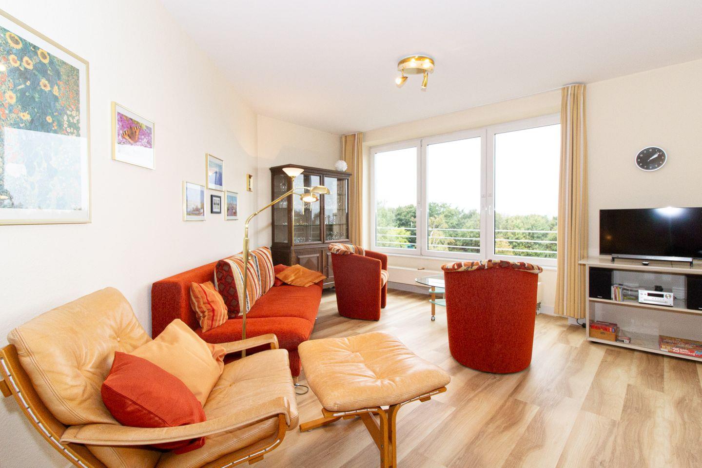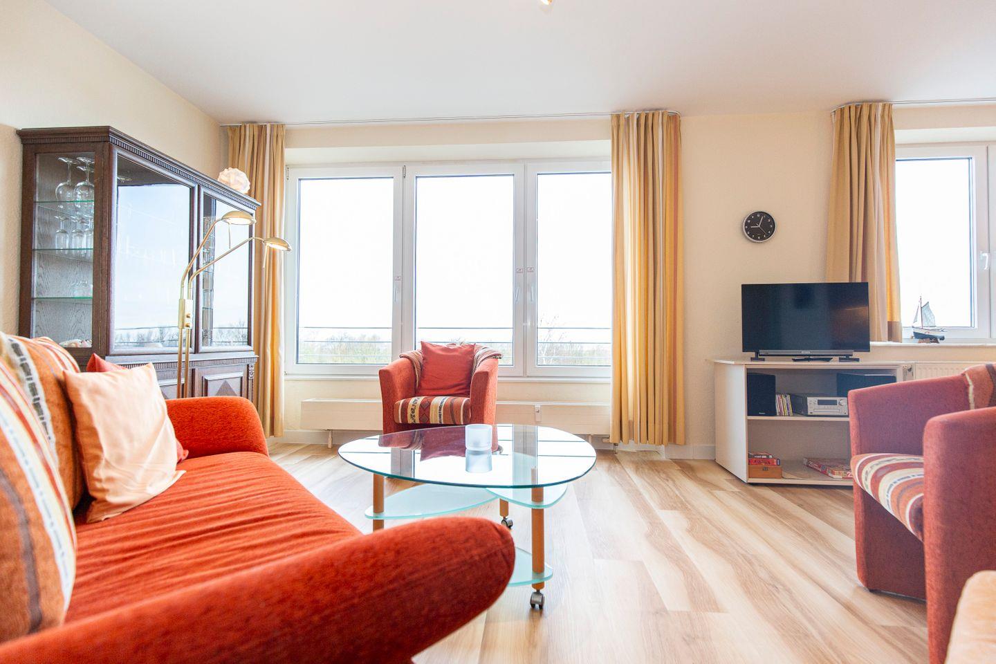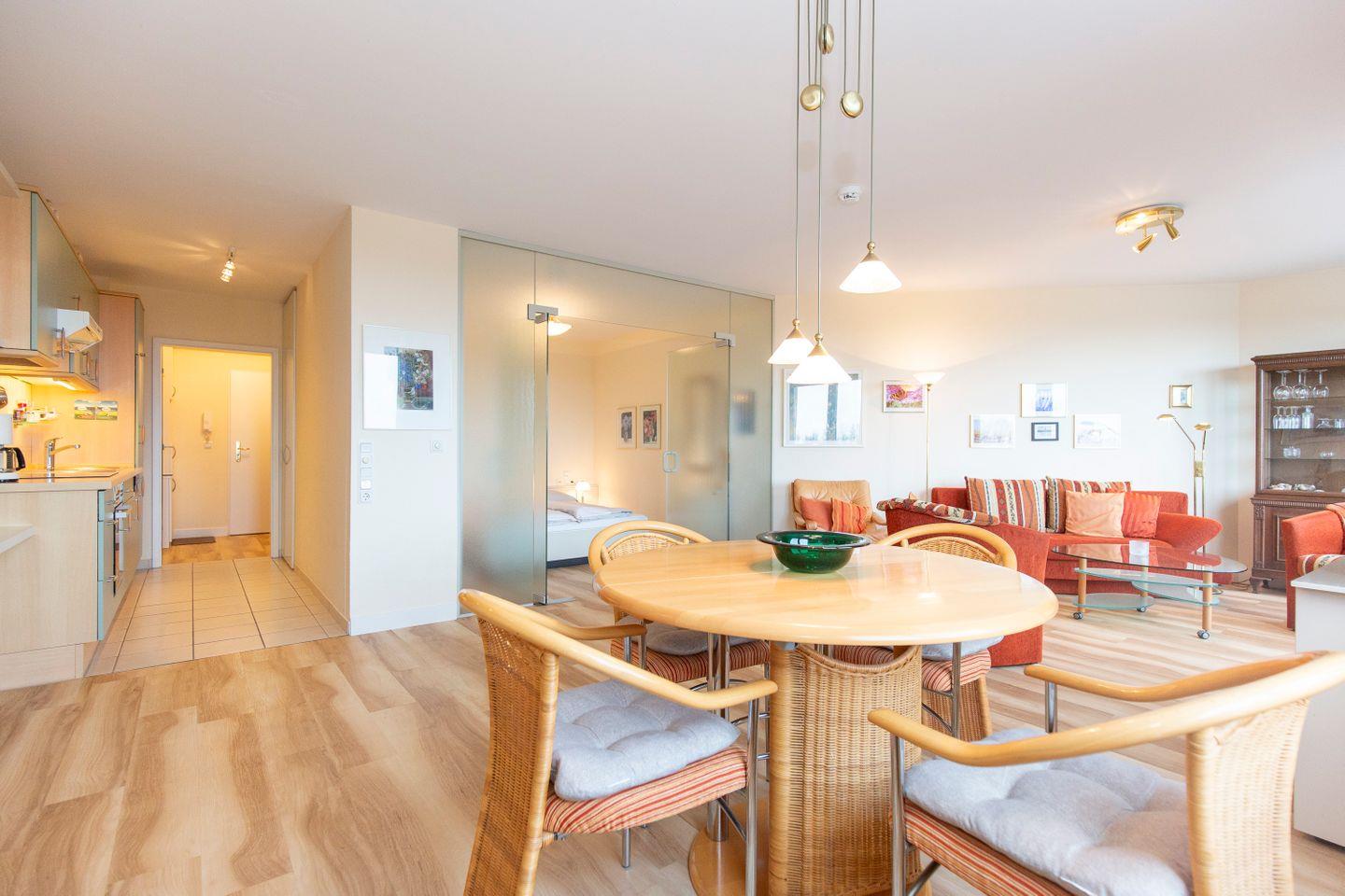 Haus "Kurpark-Residenz", Typ C, Appartement-Nr. "240", bis 2 Personen, 2. OG, Nordseite (Seesicht Richtung "Elbe"), ca. 55 m² Wohnungsgröße, Wohnzimmer mit Couch, separates Schlafzimmer mit Doppelbett (innenliegend), Dusche/WC, Küchenzeile mit mit Backofen und Geschirrspüler, SAT-TV, WLAN, Tiefgaragenstellplatz, Nichtraucher.