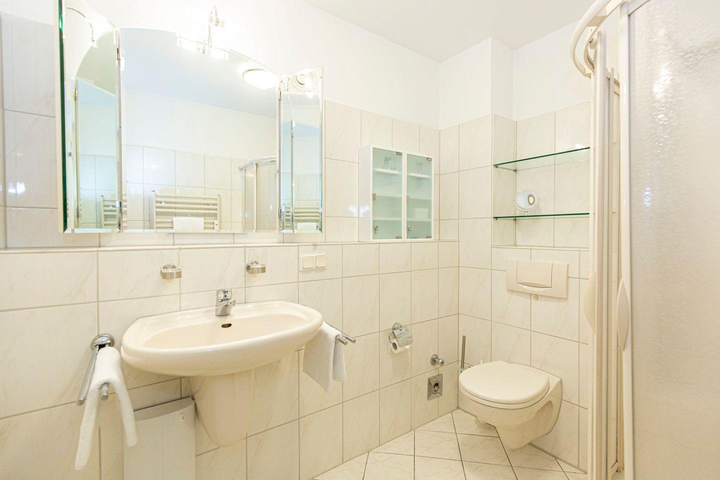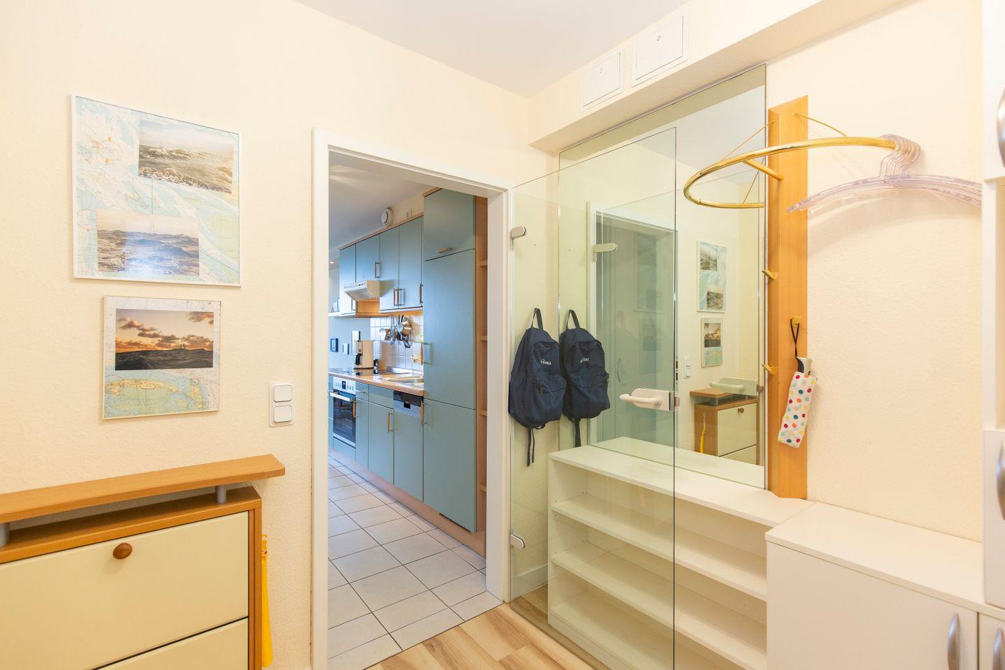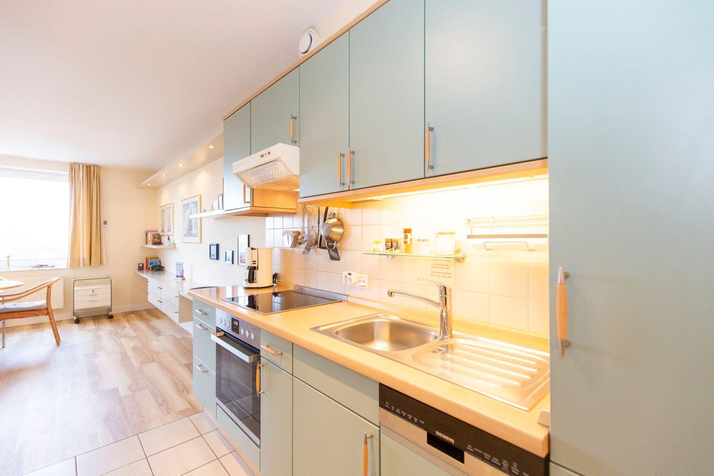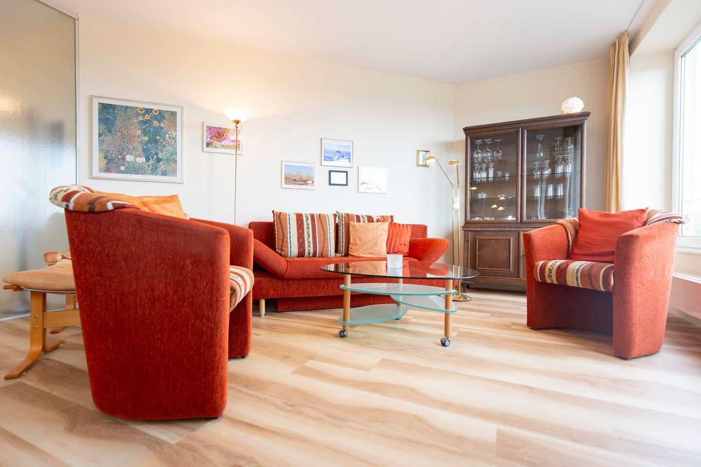 Haus "Kurpark-Residenz", Typ C, Appartement-Nr. "240", bis 2 Personen, 2. OG, Nordseite (Seesicht Richtung "Elbe"), ca. 55 m² Wohnungsgröße, Wohnzimmer mit Couch, separates Schlafzimmer mit Doppelbett (innenliegend), Dusche/WC, Küchenzeile mit mit Backofen und Geschirrspüler, SAT-TV, WLAN, Tiefgaragenstellplatz, Nichtraucher.