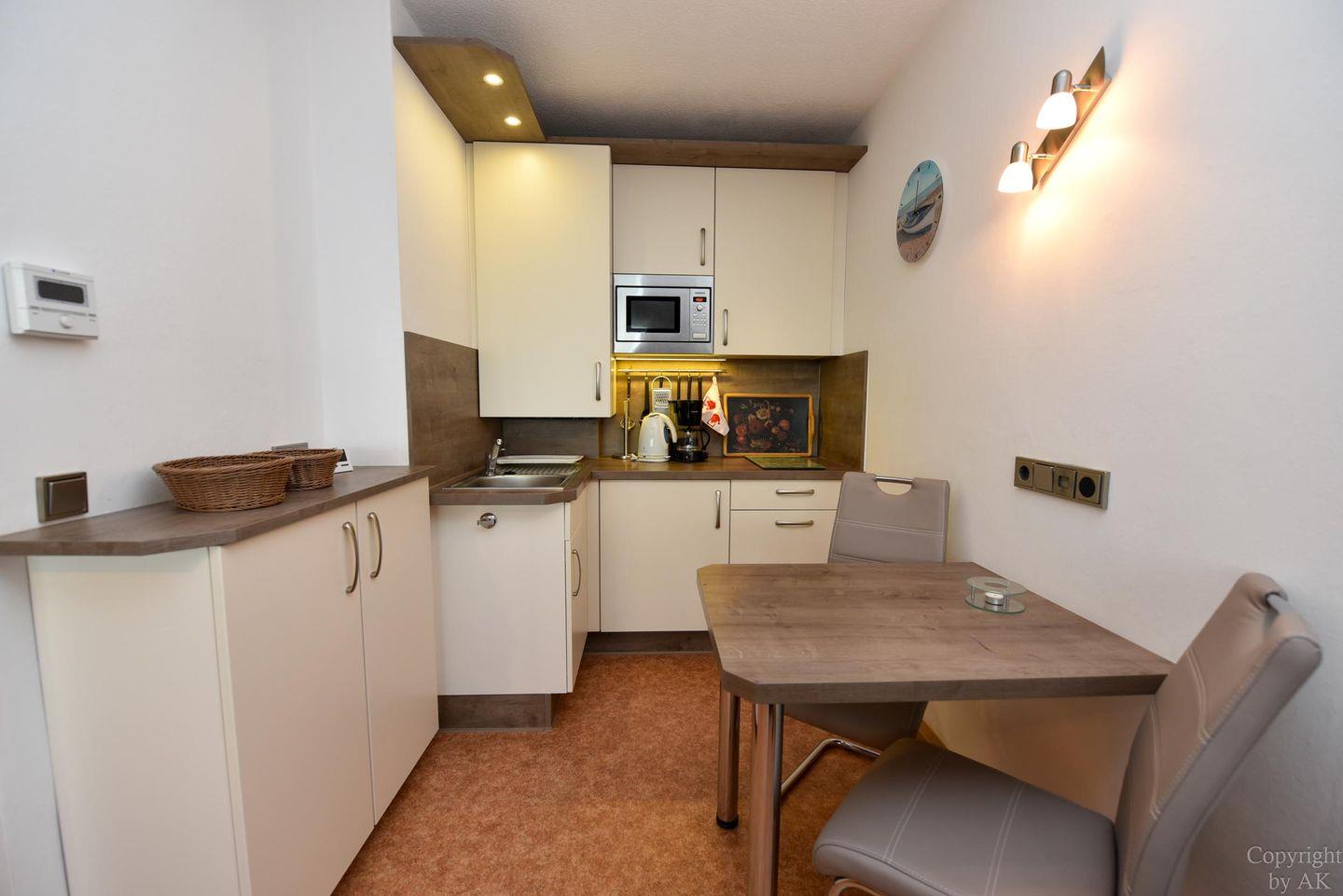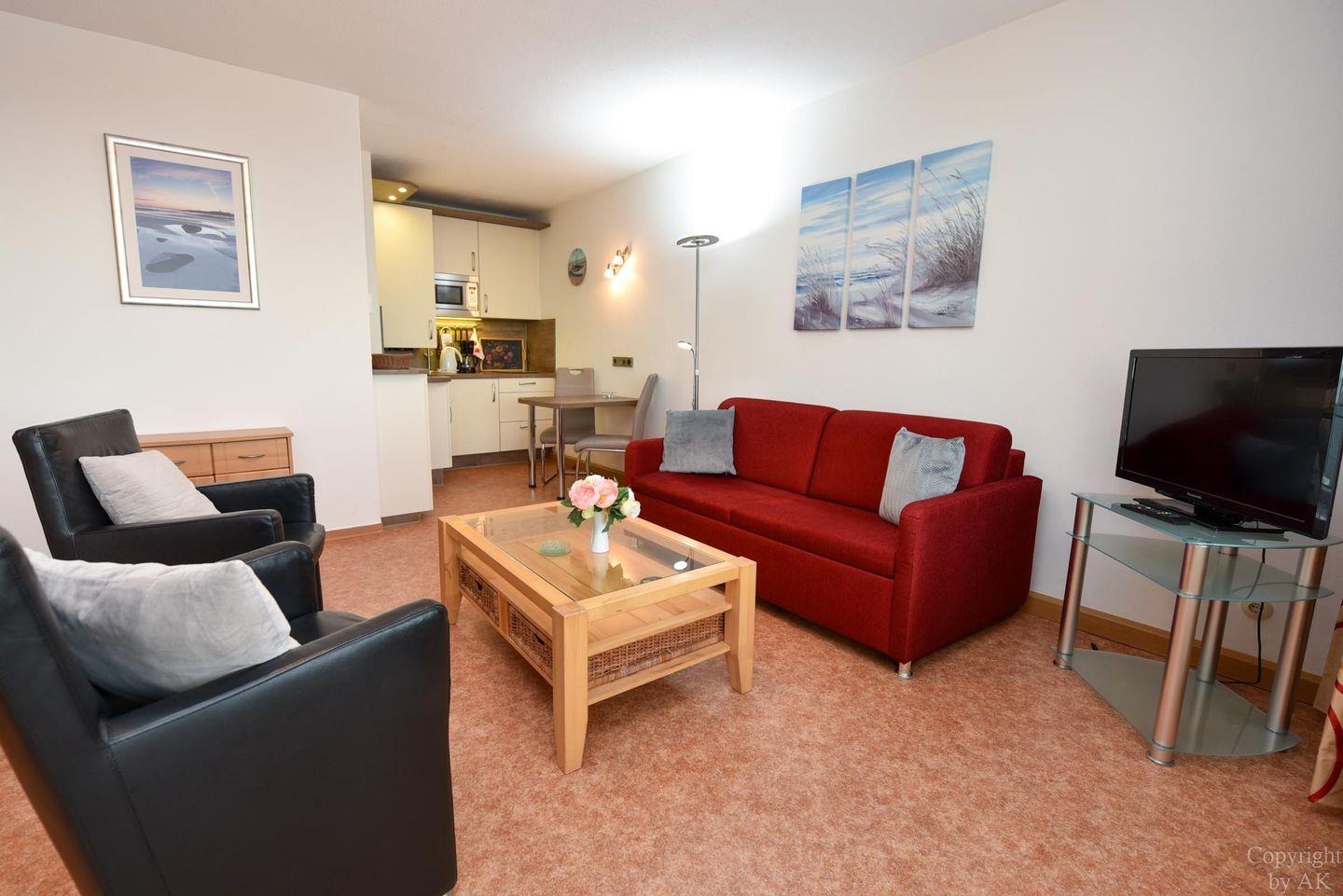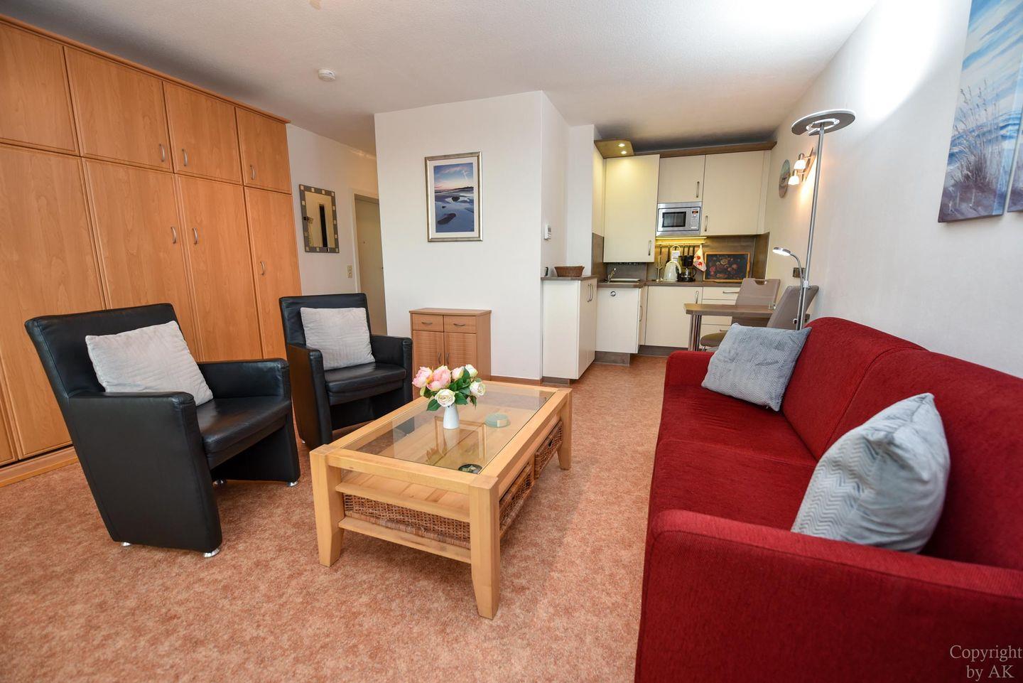Die Wohnung ist mit WLAN und einem LCD-Fernseher ausgestattet. Die Küchenzeile umfasst ein 2-Platten-Ceranfeld, einen Kühlschrank, eine Kaffeefiltermaschine, einen Wasserkocher, eine Mikrowelle und einen Toaster. Für die Gäste des Hauses Atlantic stehen zudem ein Schwimmbad, eine Sauna, ein Fitnessraum und eine Tischtennisplatte zur Verfügung. Zusätzlich bietet die Wohnung eine abschließbare Einzelgarage zum Parken und für Fahrräder zwei Stellplätze im Fahrradschuppen.