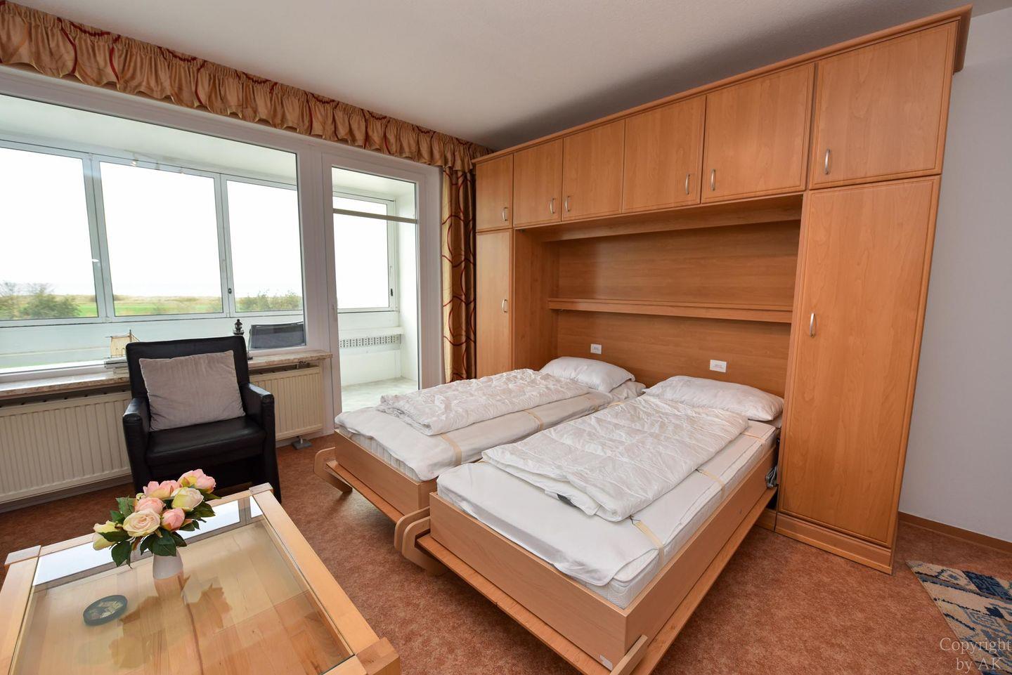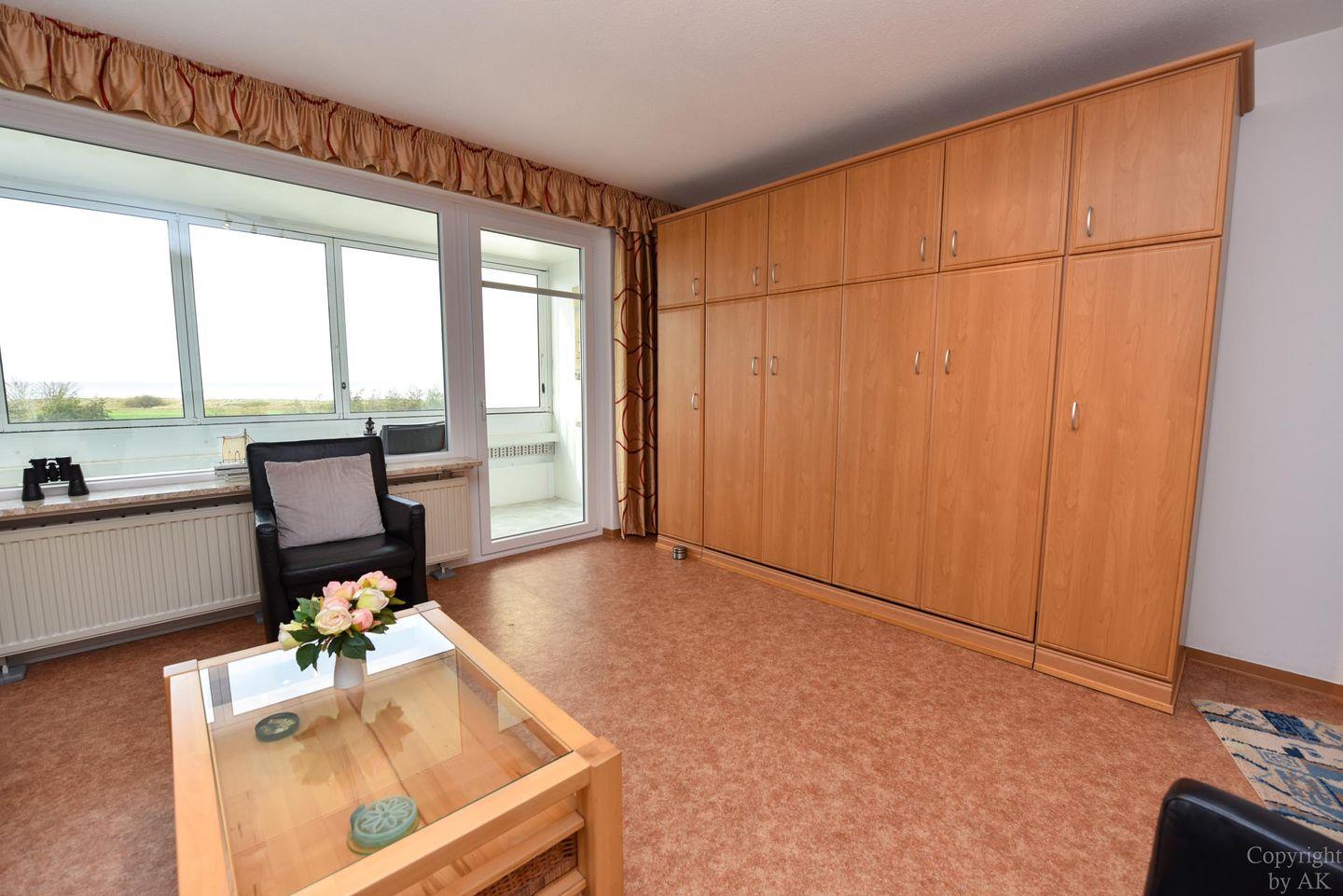 Die 1-Raum-Ferienwohnung Nr. 303 im Haus Atlantic in Cuxhaven-Döse ist ein charmantes und gut ausgestattetes Urlaubsziel. Mit einer Größe von etwa 30 Quadratmetern bietet diese Wohnung im 3. Stockwerk eine herrliche Seesicht. Sie verfügt über zwei Einzelschrankbetten, eine kleine Küchenzeile und einen Essbereich für zwei Personen. Das Badezimmer ist mit Dusche und WC ausgestattet. Ein besonderes Highlight ist der Balkon, der einen direkten Blick auf den Strand und das Wattenmeer in Richtung der Insel Nige Wark und somit in den wunderschönen Sonnenuntergang bietet. Die Außenverglasung des Balkons kann vollständig geöffnet werden, was auch bei kaltem Wetter oder Regen einen angenehmen Aufenthalt ermöglicht.