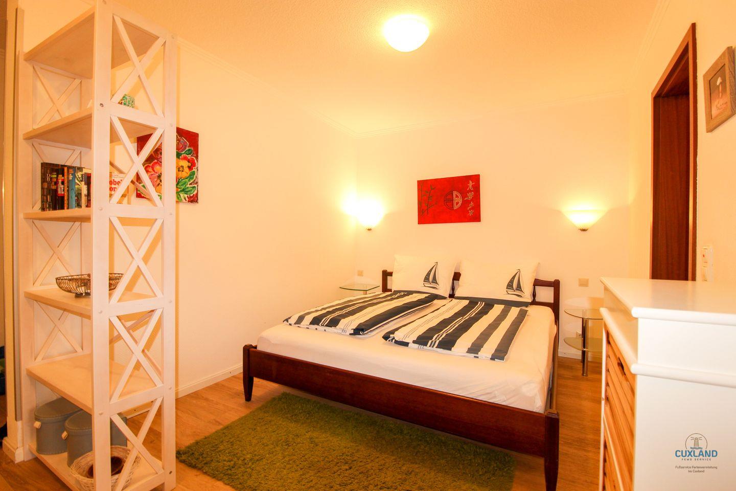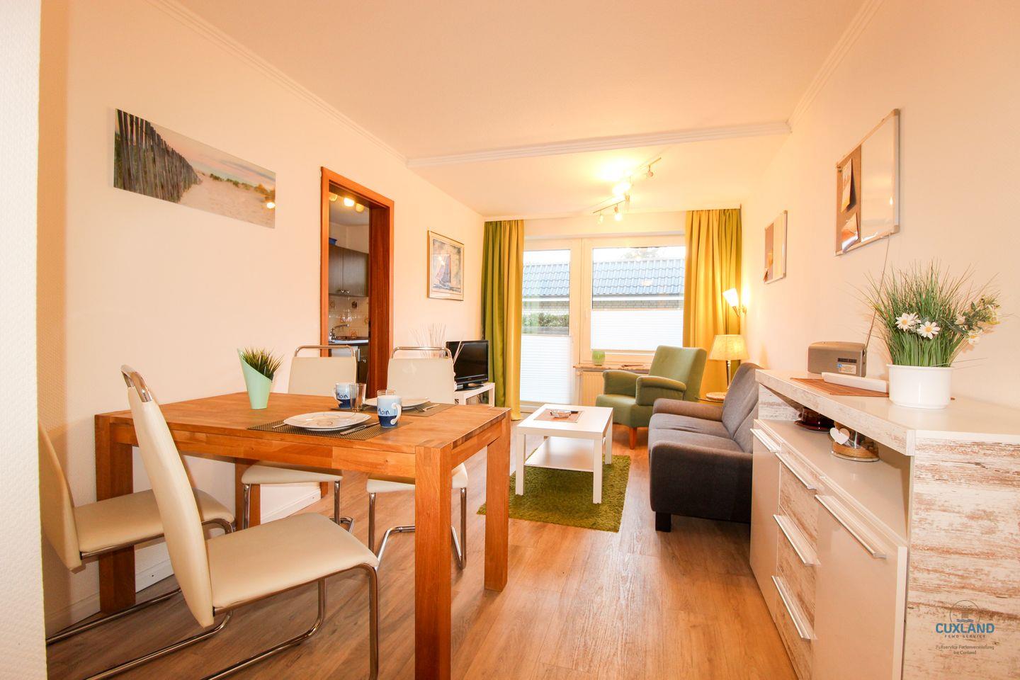Gemütliches 49qm Apartment im Erdgeschoss, ideal für entspannten Urlaub zu zweit in Döse. Schlafbereich mit gemütlichem Doppelbett und direktem Zugang zum Bad. Wohnbereich lädt mit gemütlicher Einrichtung ein. Süd-westlich ausgerichtete Terrasse für Frühstück oder abendliches Glas Wein. Vollausgestattete Küche für leckere Speisen. Kostenfreies WLAN und Parkplatz vor dem Haus verfügbar.