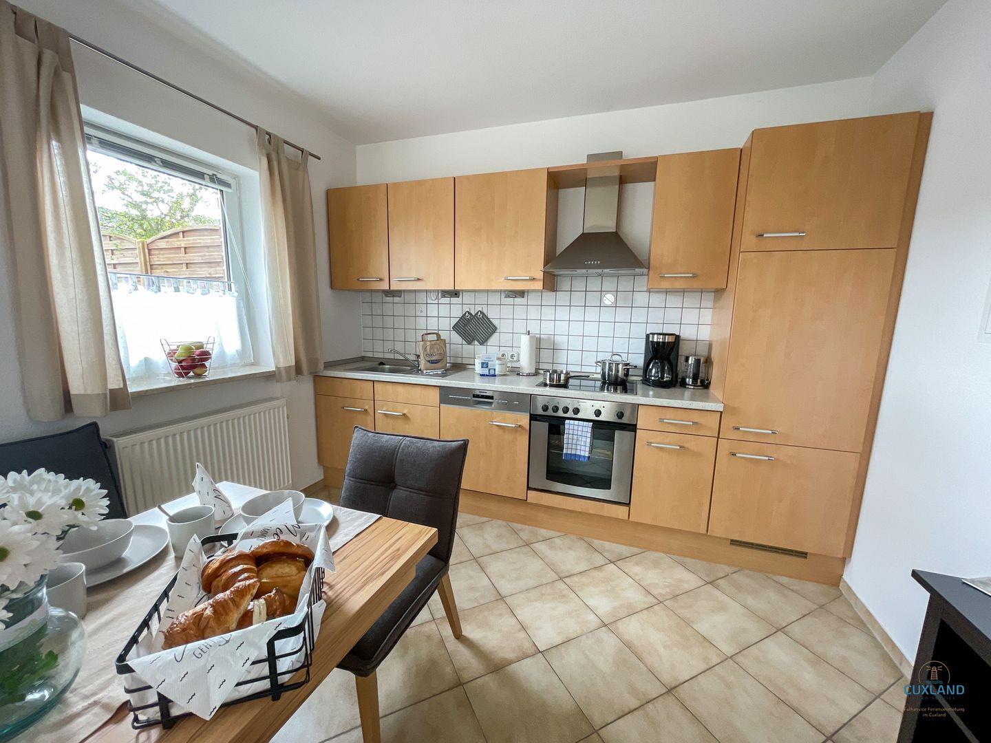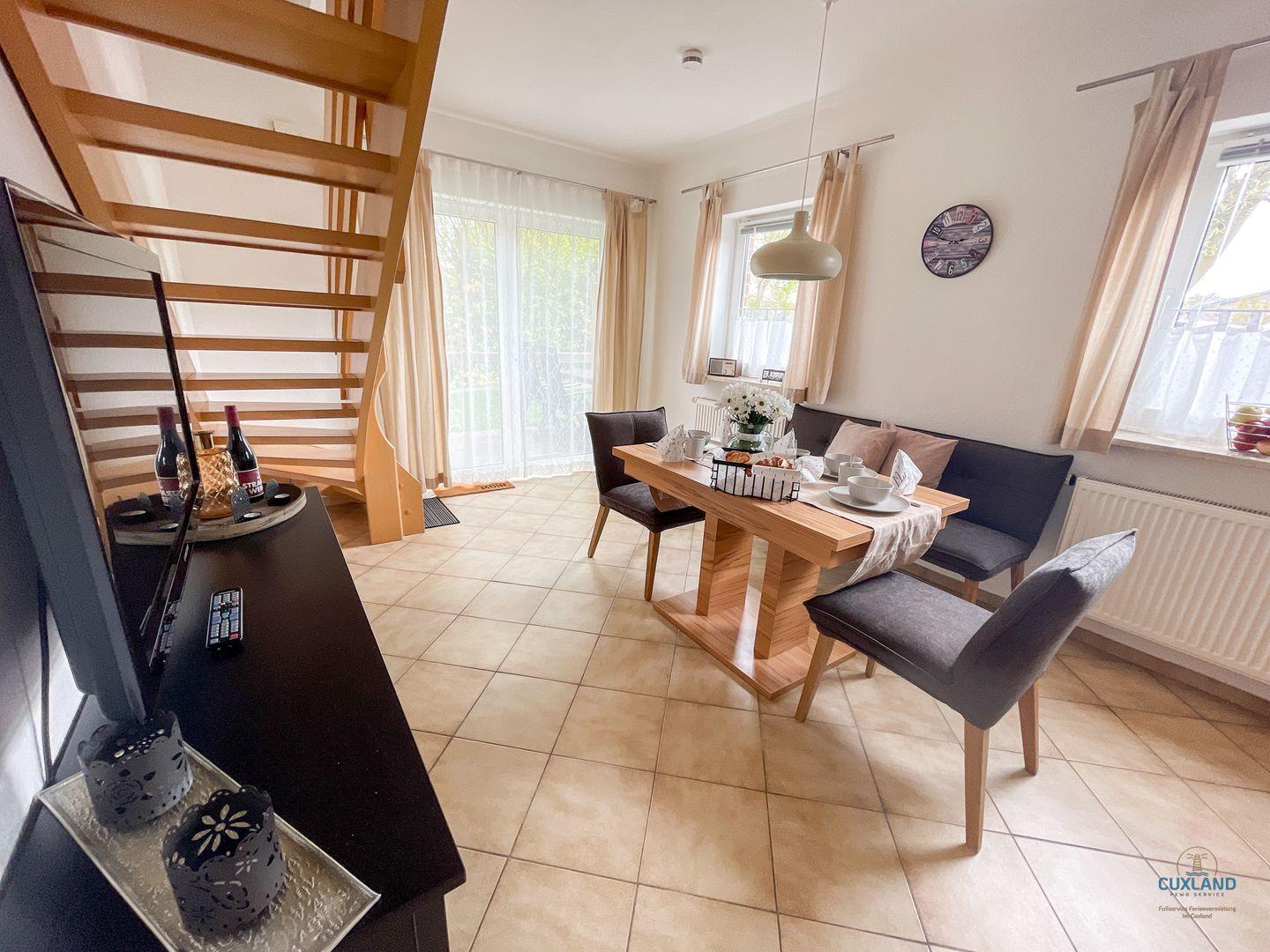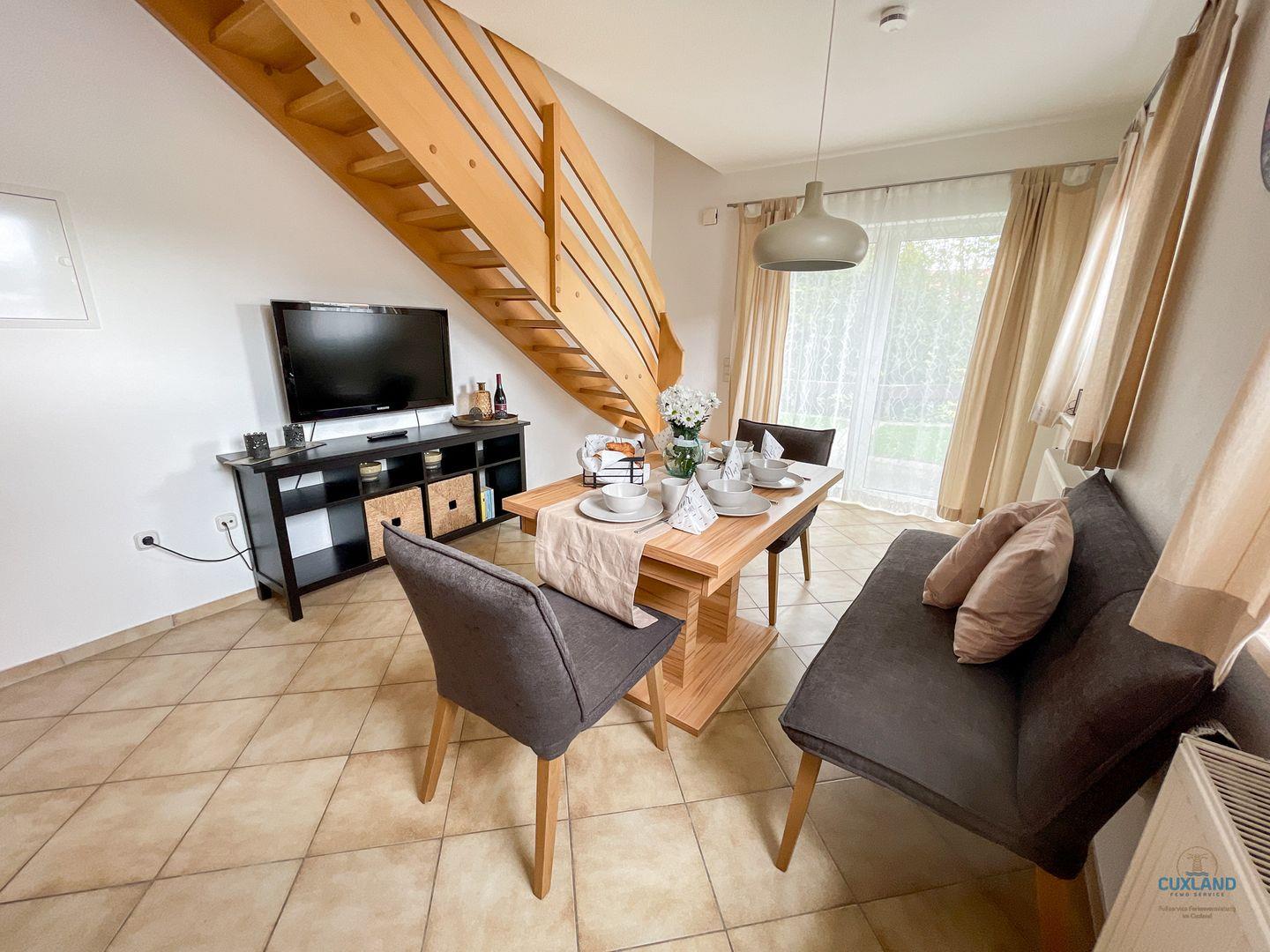 Gemütliche 57qm Wohnung über zwei Ebenen in Sahlenburg für bis zu 4 Personen. Großzügiger Wohnraum mit offener Küche und Essbereich. Gemütlicher Bereich mit Couchgarnitur und TV, führt zur Terrasse. Zwei Schlafzimmer: eines mit Doppelbett und Sitzecke, das zweite mit zwei Einzelbetten. Kostenfreie Nutzung der Waschmaschine im Duschbad. Hund erlaubt (gegen Gebühr). Kostenloses WLAN und eigener PKW-Stellplatz vorhanden.