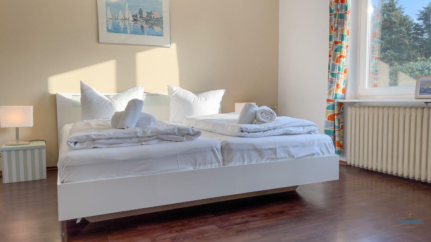 Schlafzimmer, die identisch eingerichtet sind. Vom Gartenschlafzimmer gelangt über eine kleine, zweite Terrasse direkt in den Garten.
