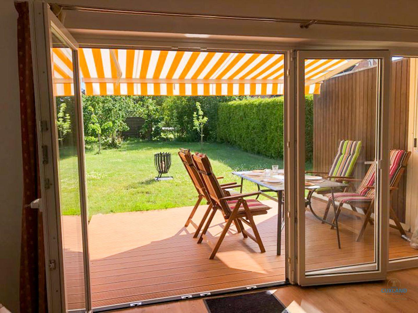 die sonnige Terrasse, welche mit einer Markise ausgestattet ist. An die
