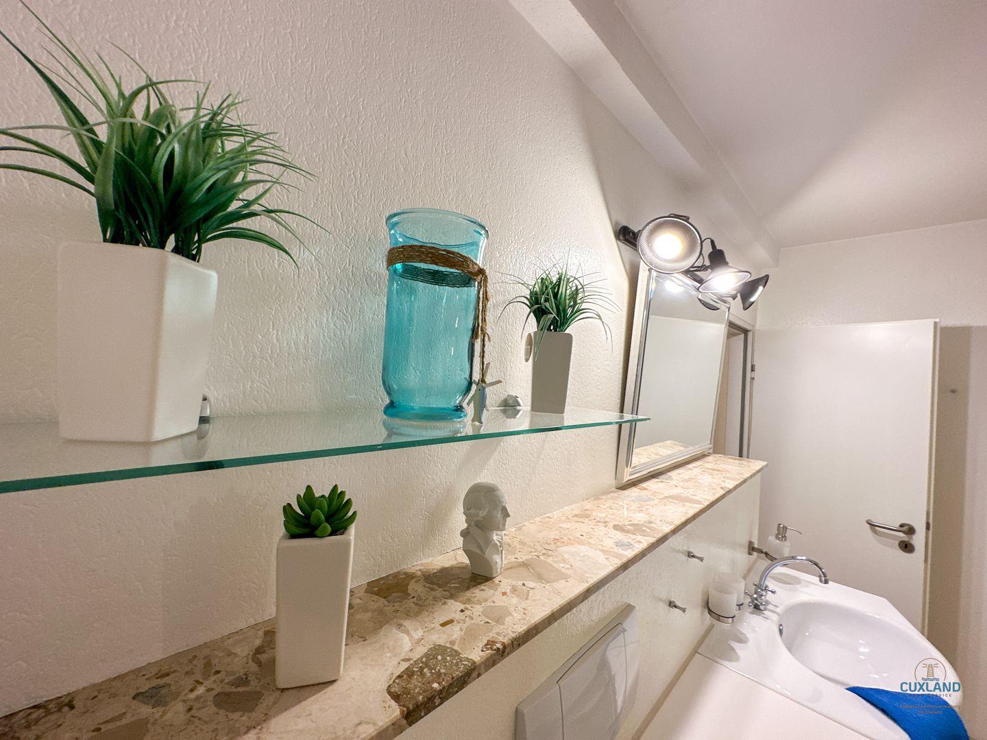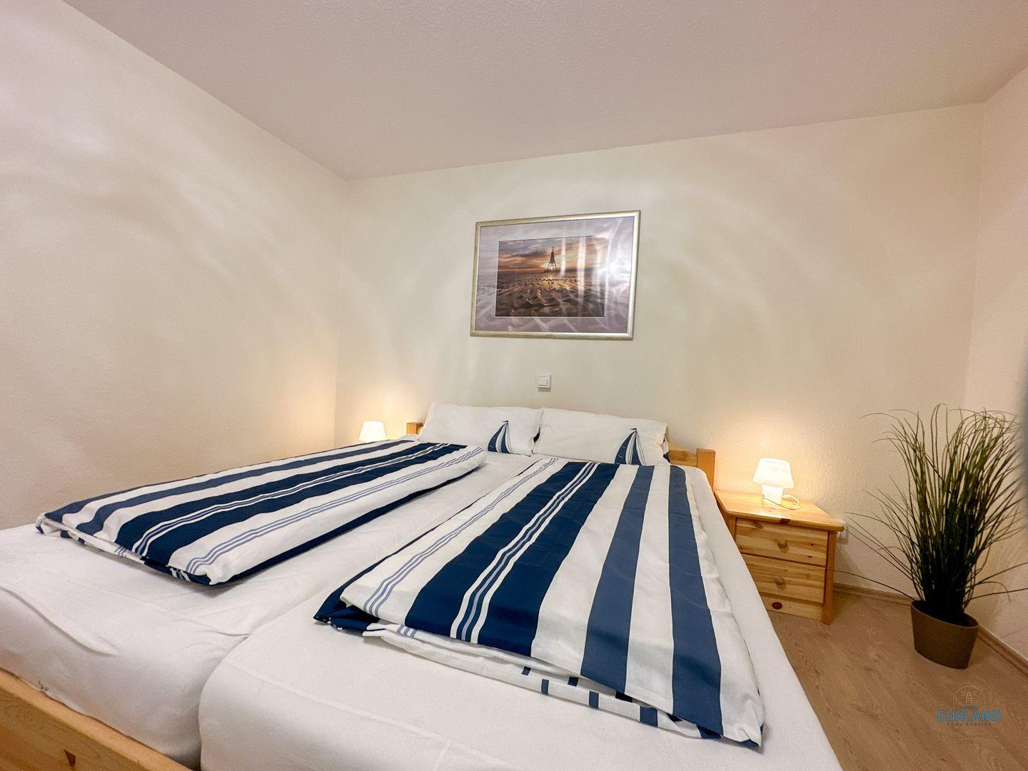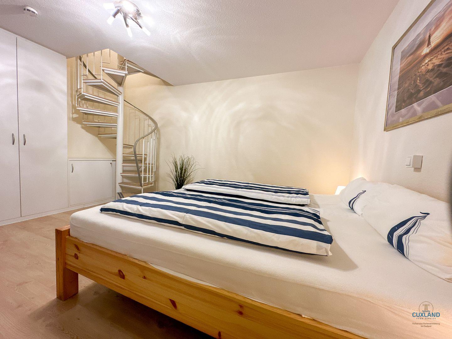 Dieses 65qm große Apartment im Haus Nautic erstreckt sich über zwei Ebenen in der 2. Etage. Es bietet einen Wohnraum mit Essbereich und Balkon mit Blick auf den Weltschifffahrtsweg. Ein modernes Badezimmer, eine separate Küche sowie ein kleines Schlafzimmer mit Einzelbett befinden sich ebenfalls auf dieser Ebene. Über eine Wendeltreppe gelangt man zum großzügigen Hauptschlafzimmer. Kostenloses WLAN und ein eigener PKW-Stellplatz sind inklusive.