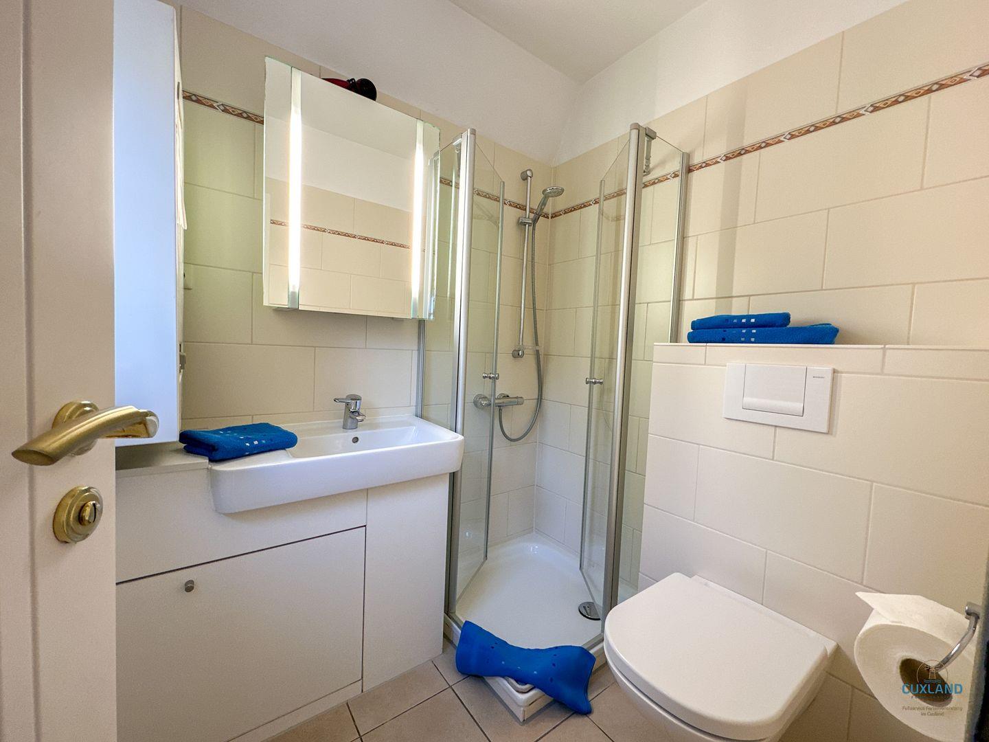 - Dusche, WC, Waschbecken, Spiegel, Haartrockner