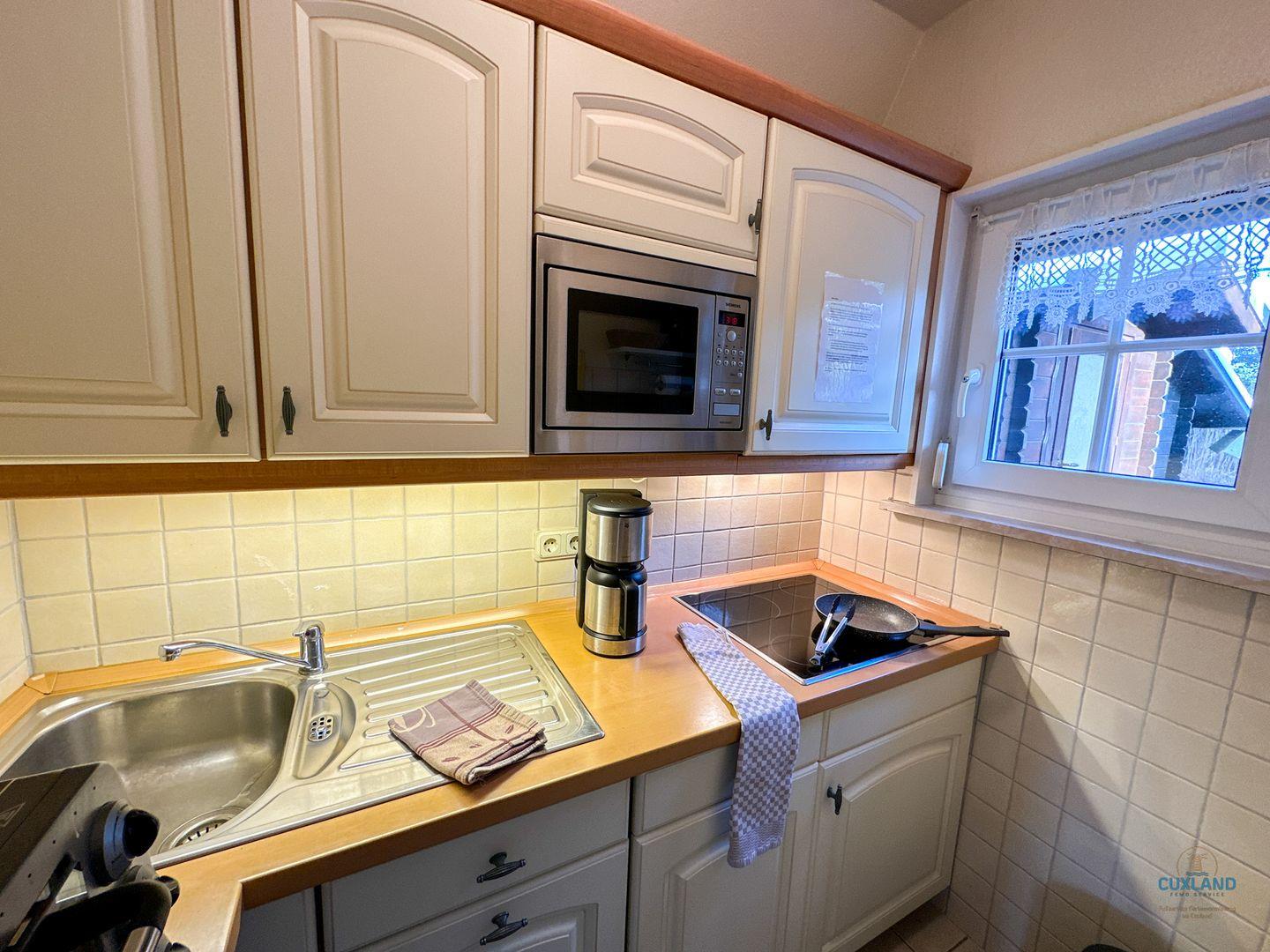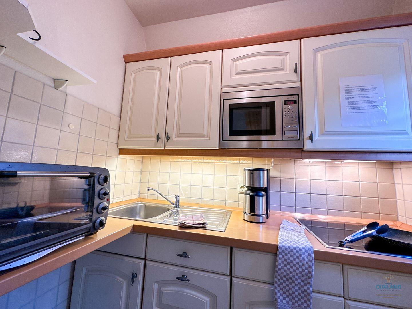 - Cerankochfeld, Backofen, Kühlschrank mit Gefrierfach, Mikrowelle, Spülmaschine, Kaffeemaschine, Wasserkocher, Toaster