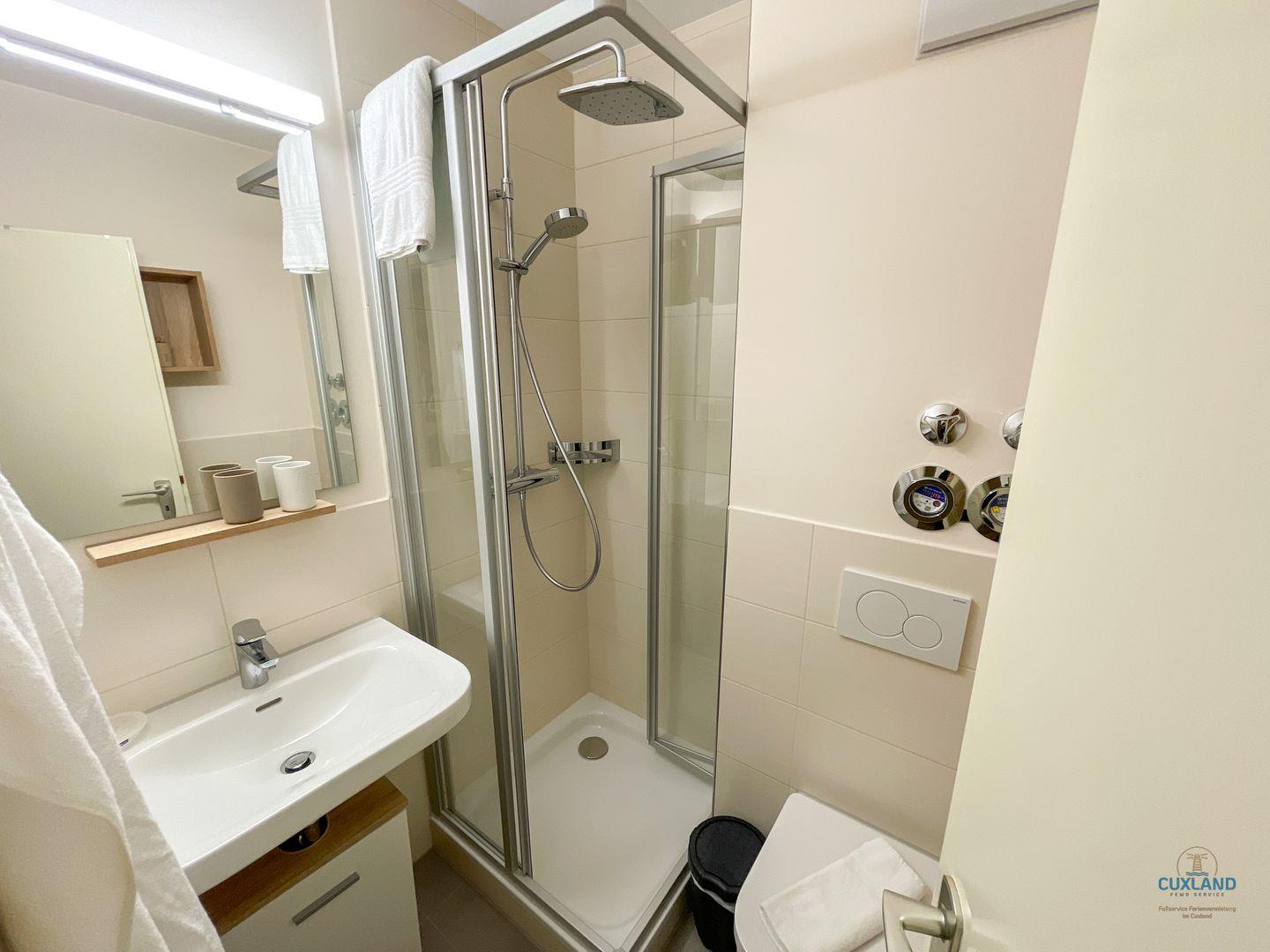 - Dusche, WC, Waschbecken, Spiegel, Haartrockner