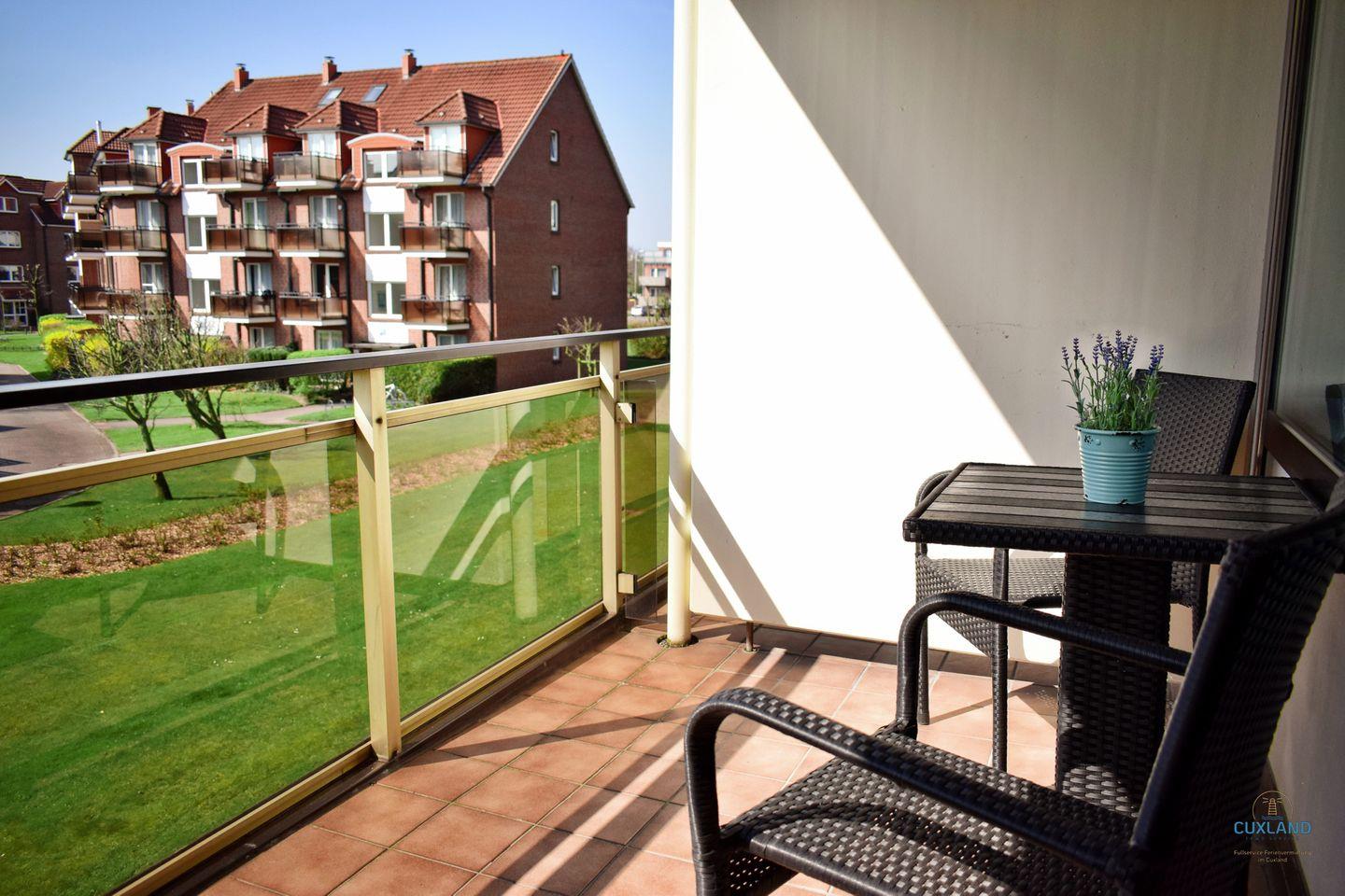 - Überdachter Südbalkon mit Blick ins Grüne – geschützt bei Wind und Wetter