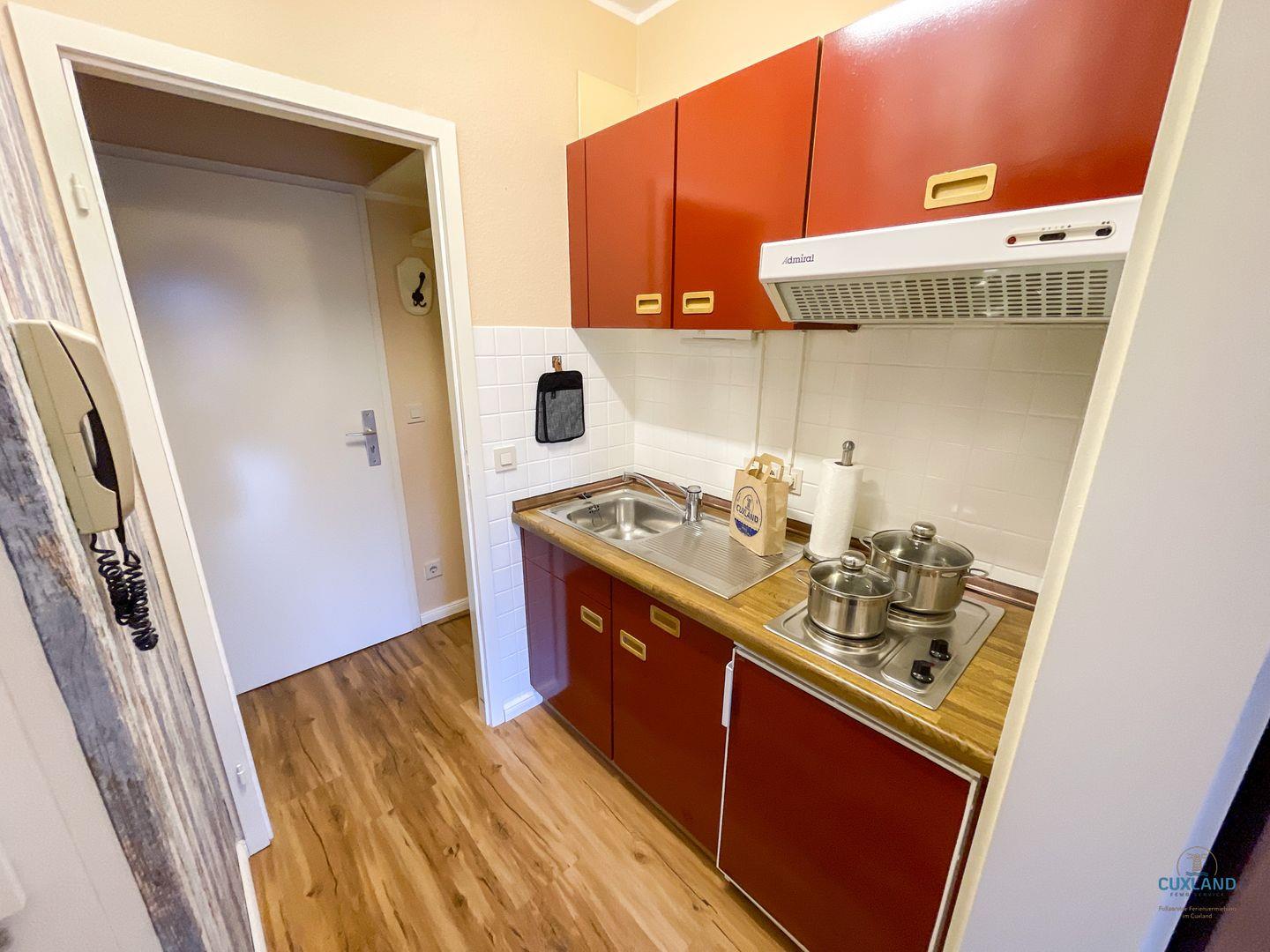 - Offene Küchenzeile mit:Cerankochfeld, Kühlschrank mit Gefrierfach, Kaffeemaschine, Wasserkocher, Toaster