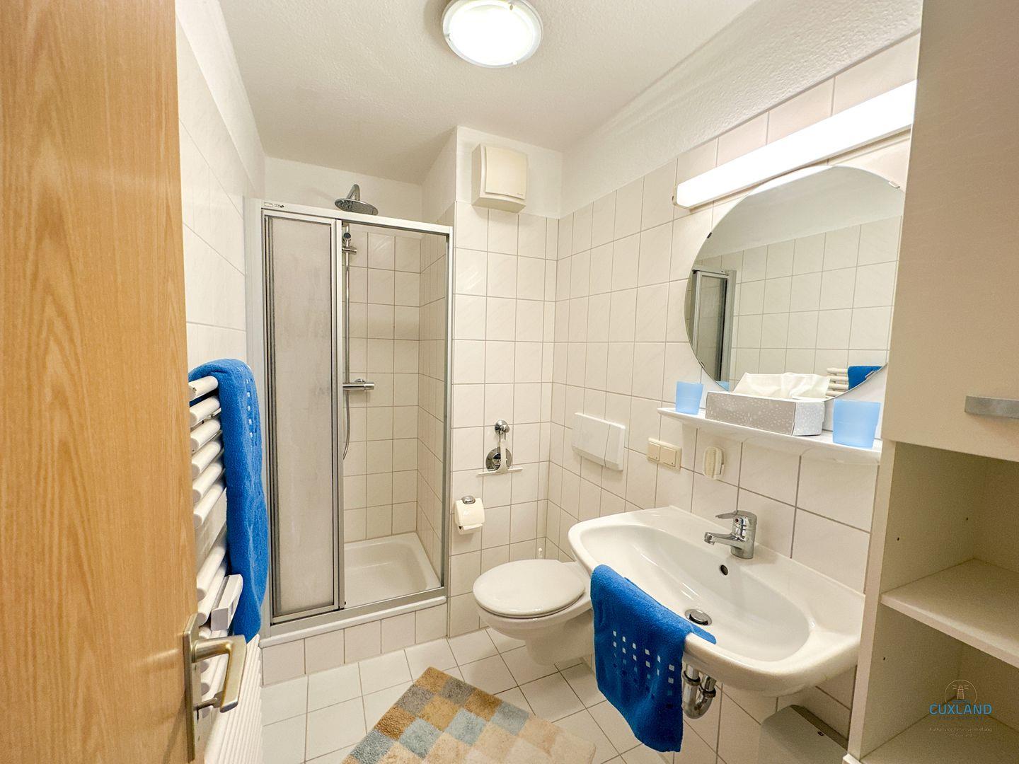 - Geräumiges Badezimmer mit Dusche/WC, Spiegel, Föhn, beheizbarer Handtuchhalter