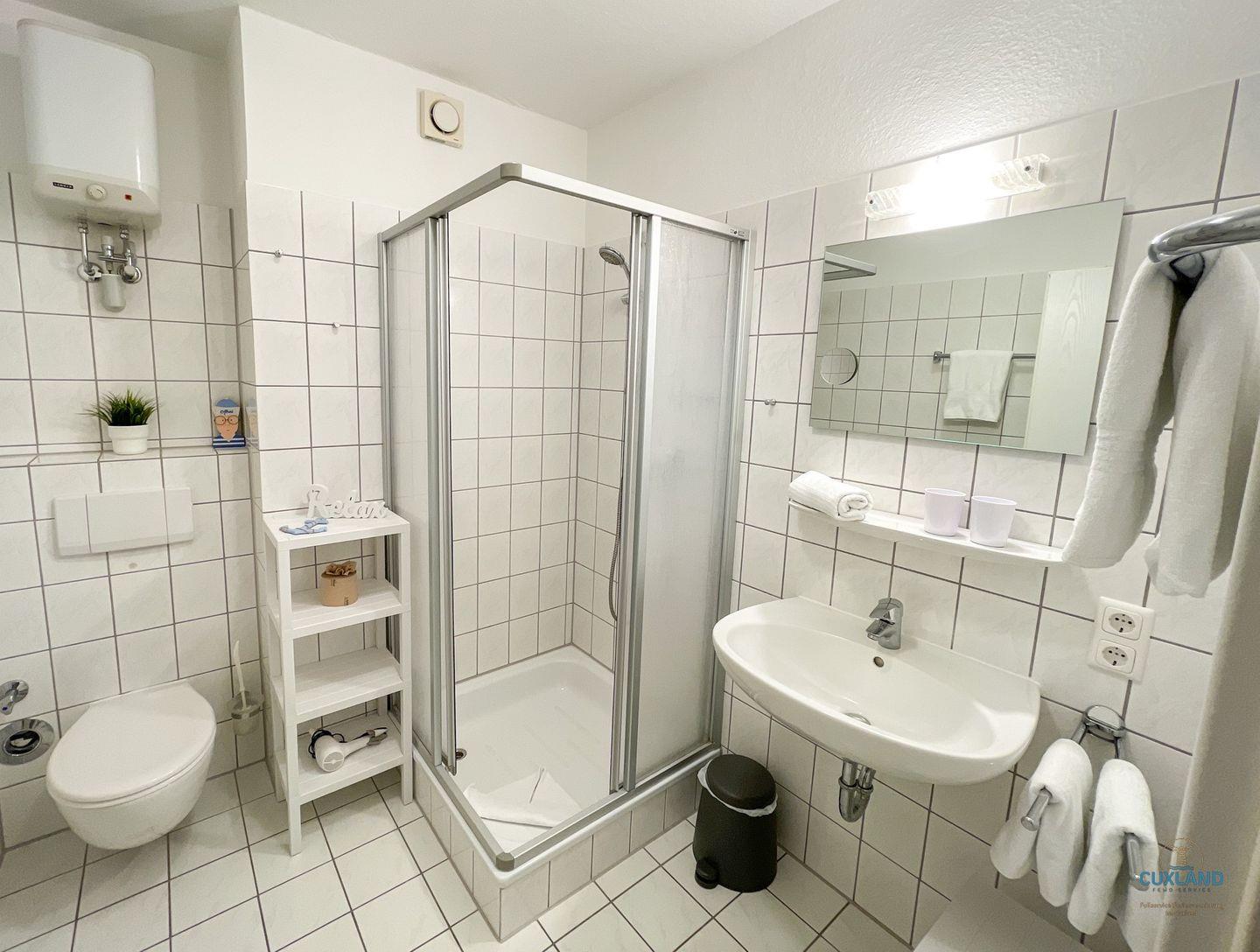 in Ruhe speisen. Das Badezimmer verfügt über eine Dusche, ein WC und ein